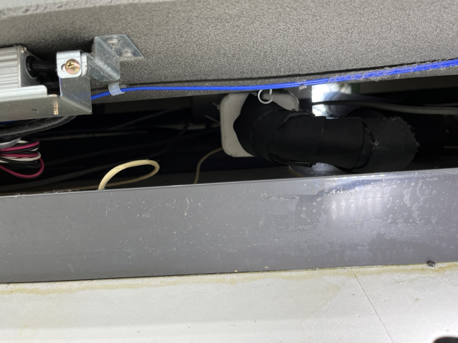 屋内の方の水漏れは、大型冷凍庫の下部のドレン(排水部)の配管が表の衝撃で外れていましたので、配管接続をやり直しました。
