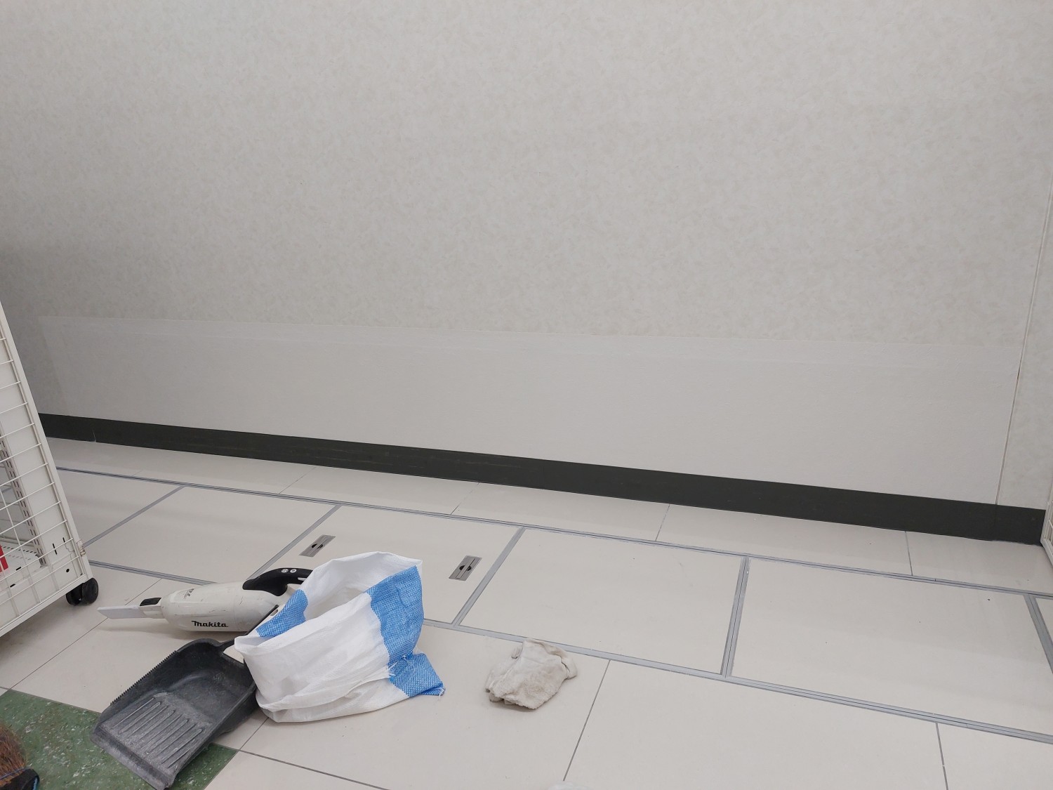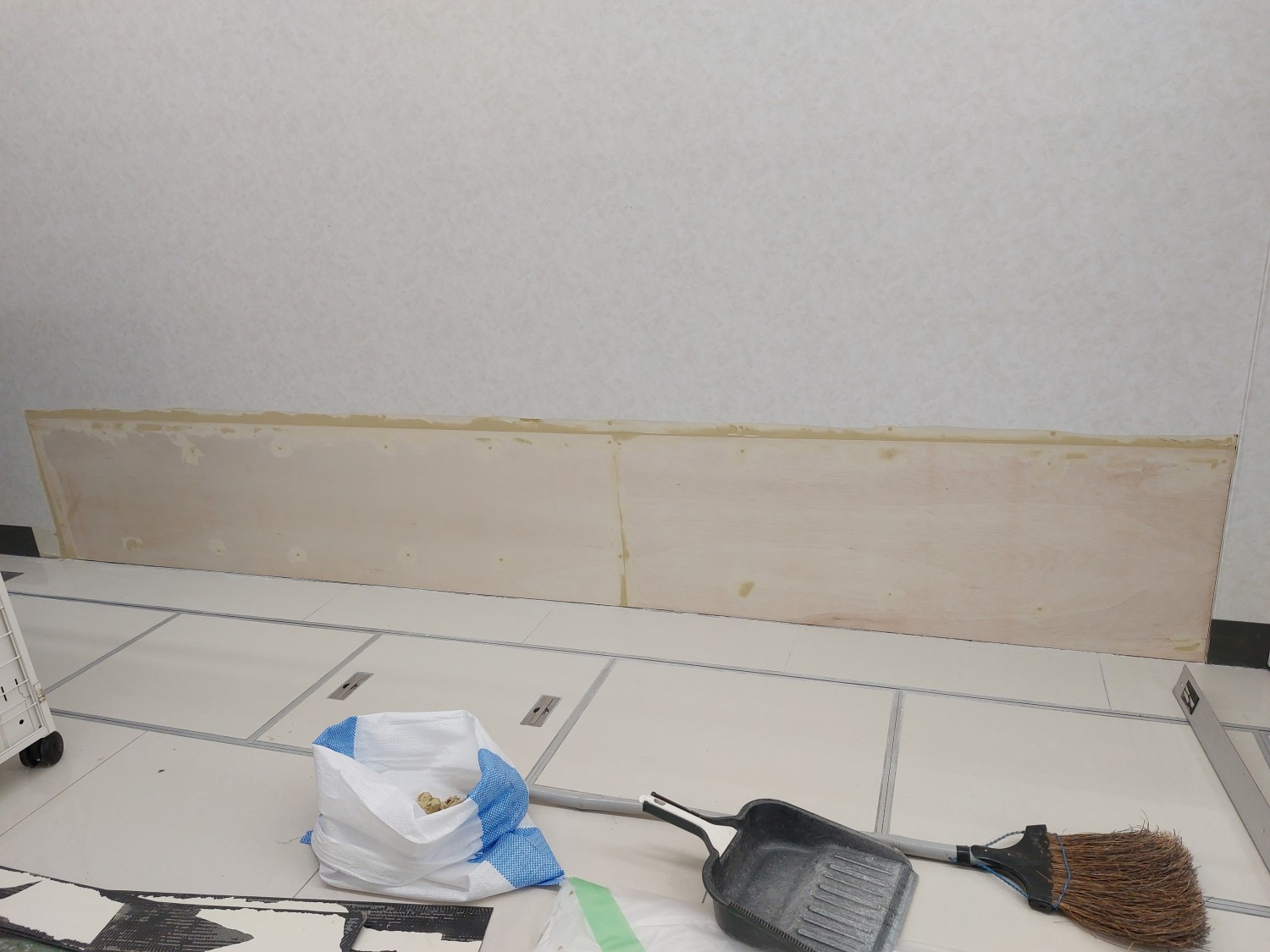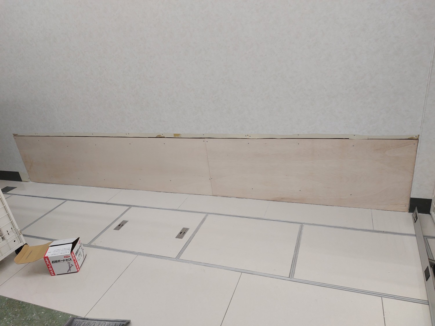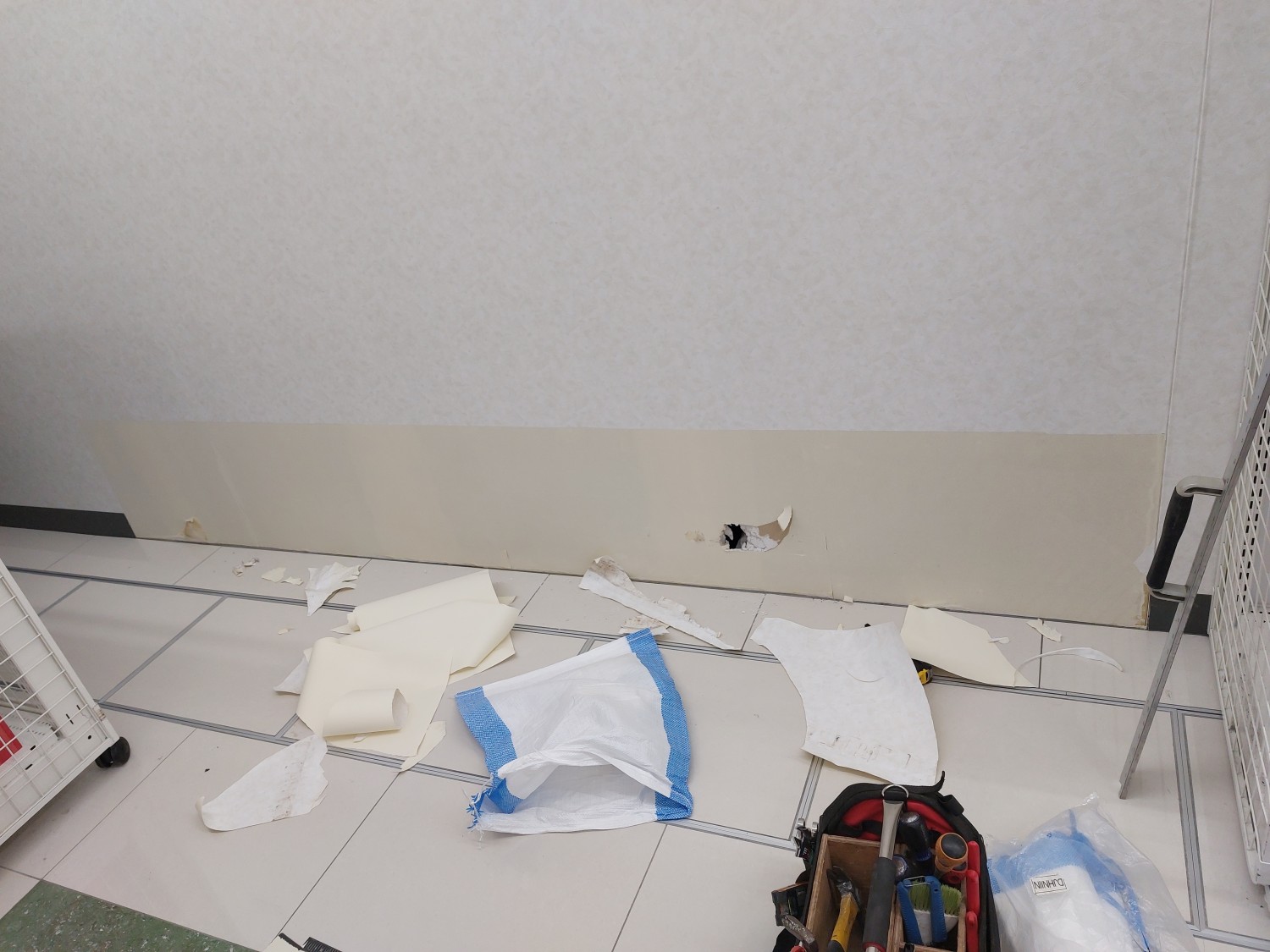 室内壁の石膏ボードに穴が開いていましたので、石膏ボードを切り取りコンパネに張り替えて補強をして、隙間やビスの頭をパテにて埋めて綺麗に表面をならしてから、同じ型番のクロスを張りました。