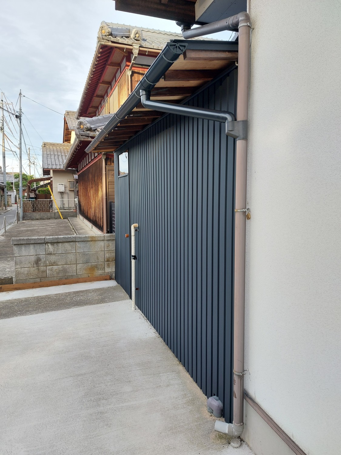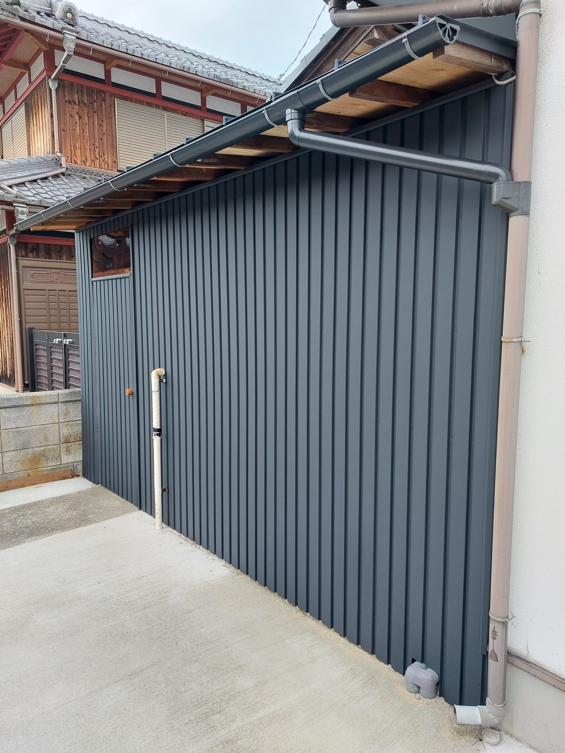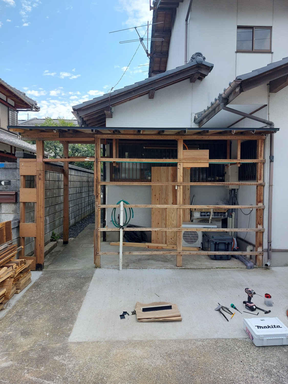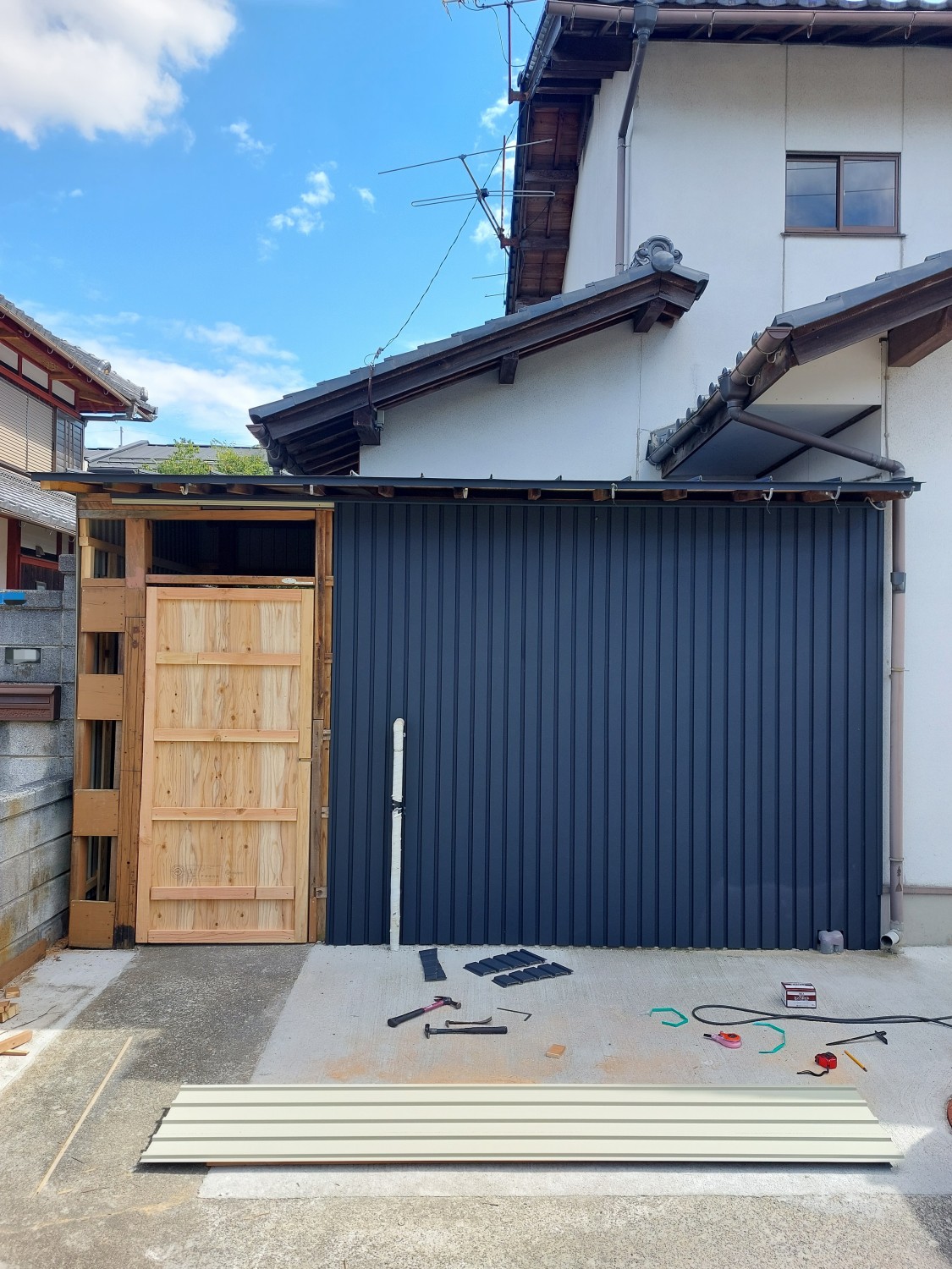 こちら側は、トタンの解体と胴縁(木棒)の追加をおこない、その後ガルバリウム鋼板を張りました。