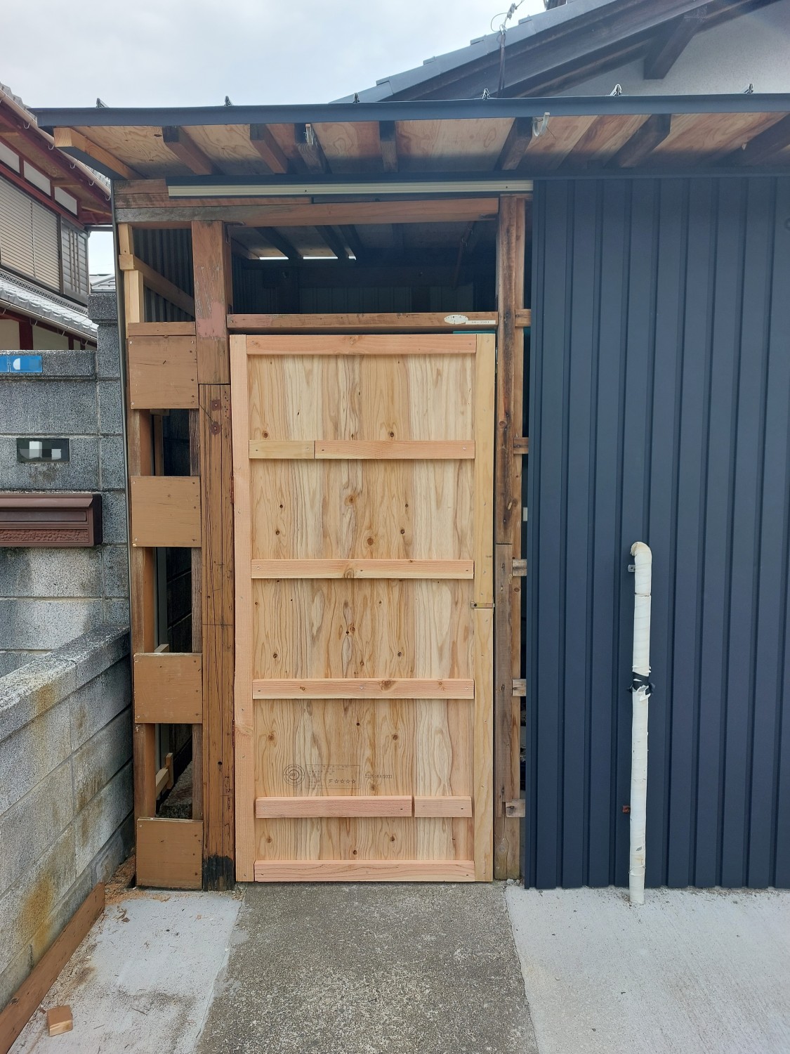 ガルバリウム鋼板を張れるように、胴縁兼ドアの補強となるように施工しました。