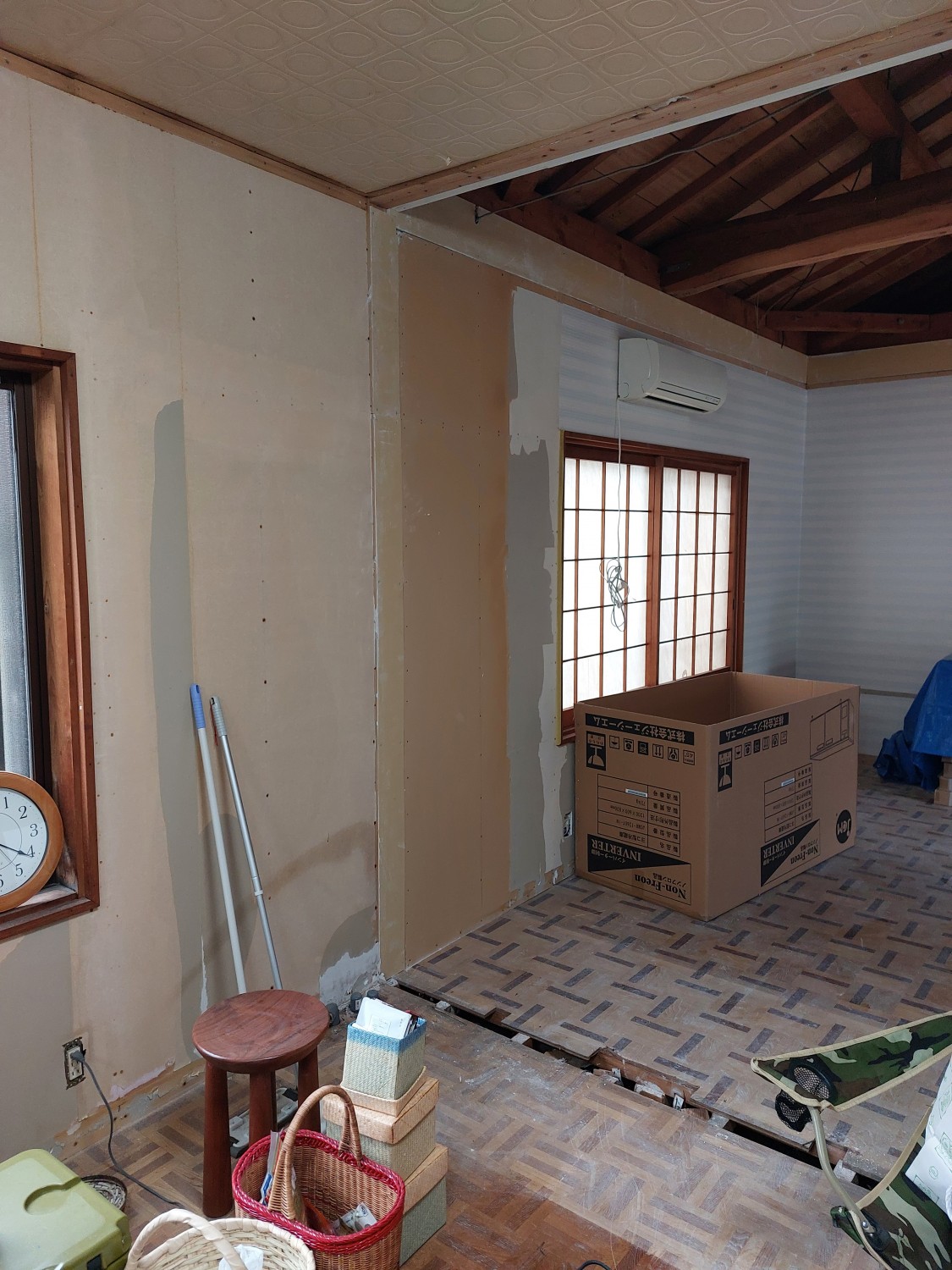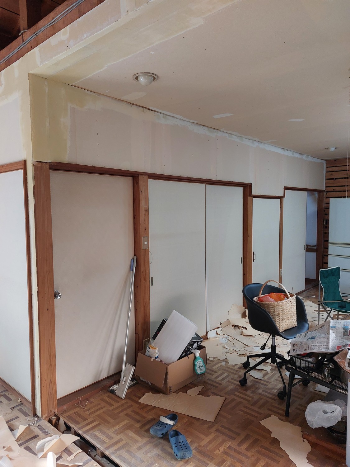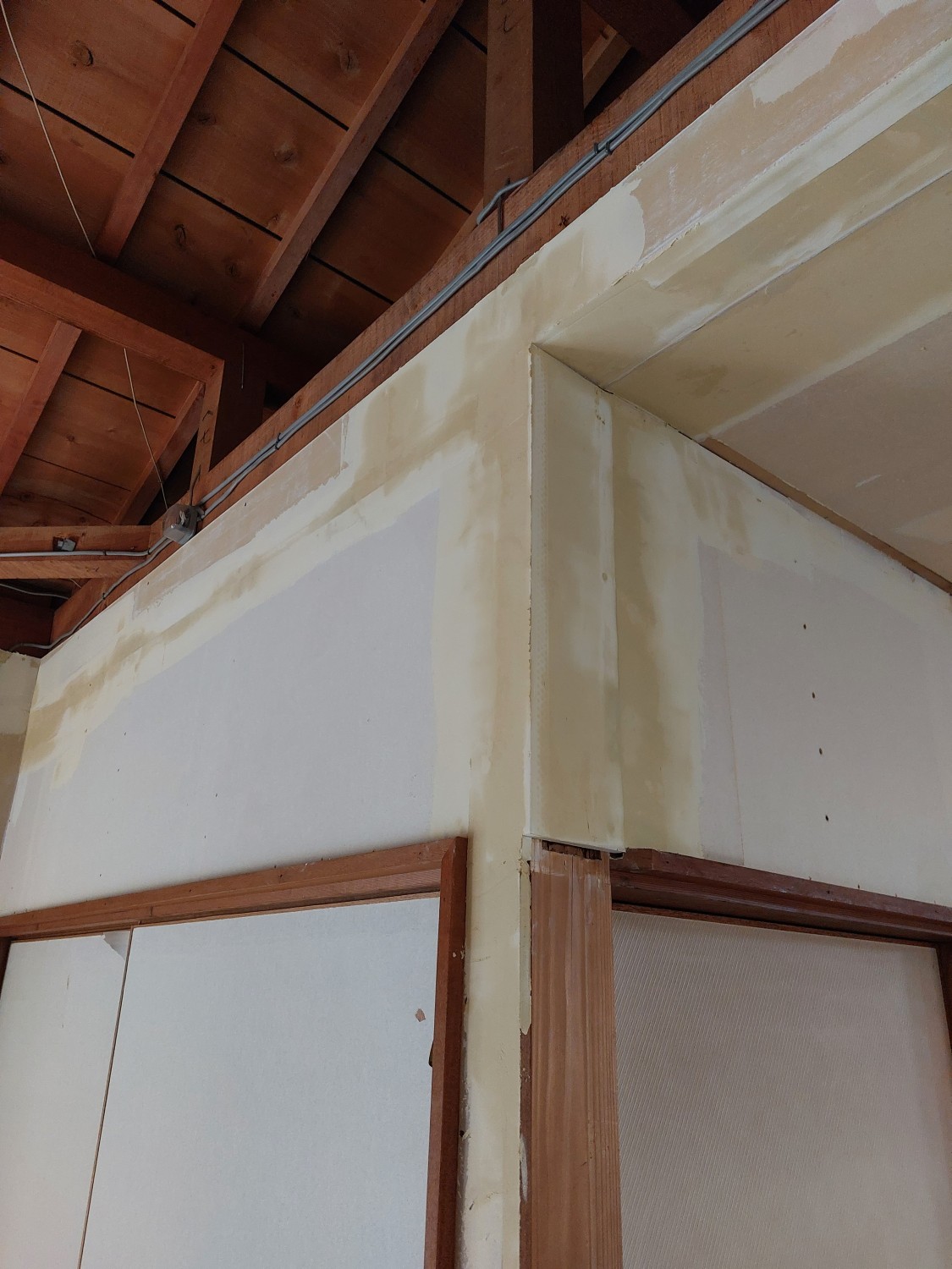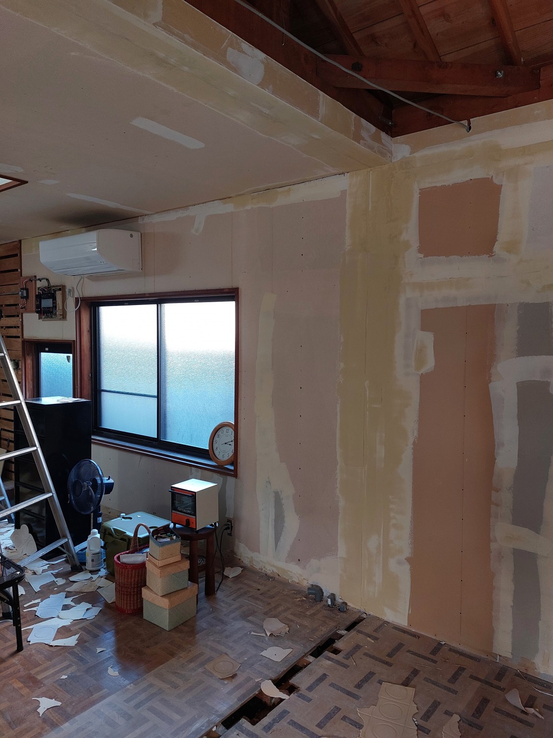 クロスを張る為に、既存のクロスをめくってからパテにて凸凹をならしました。