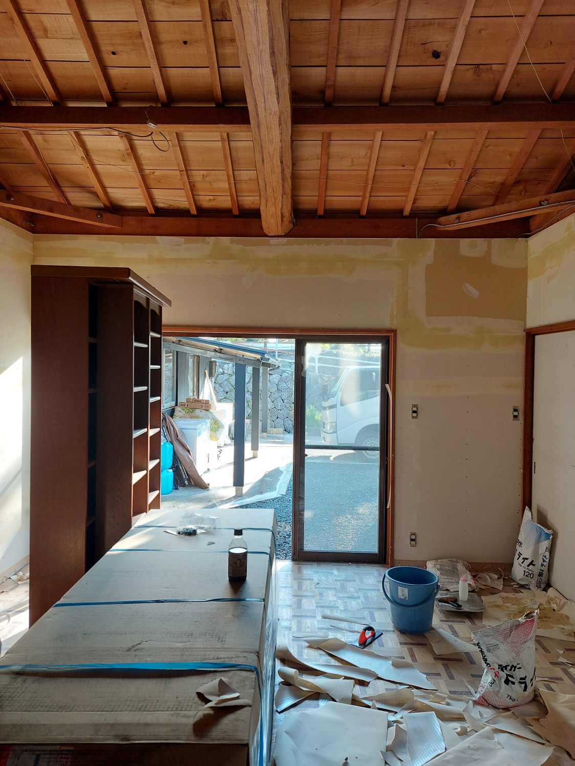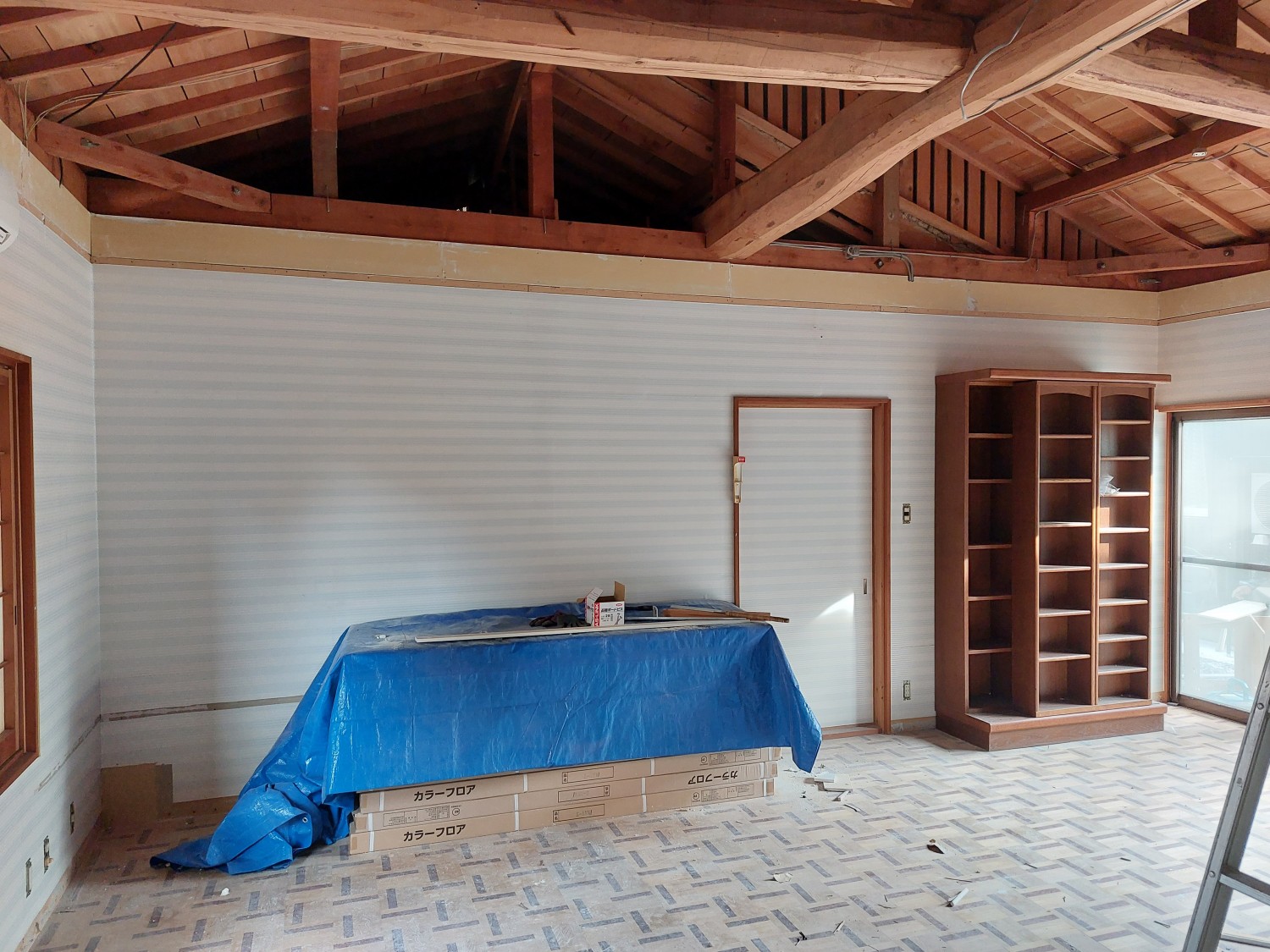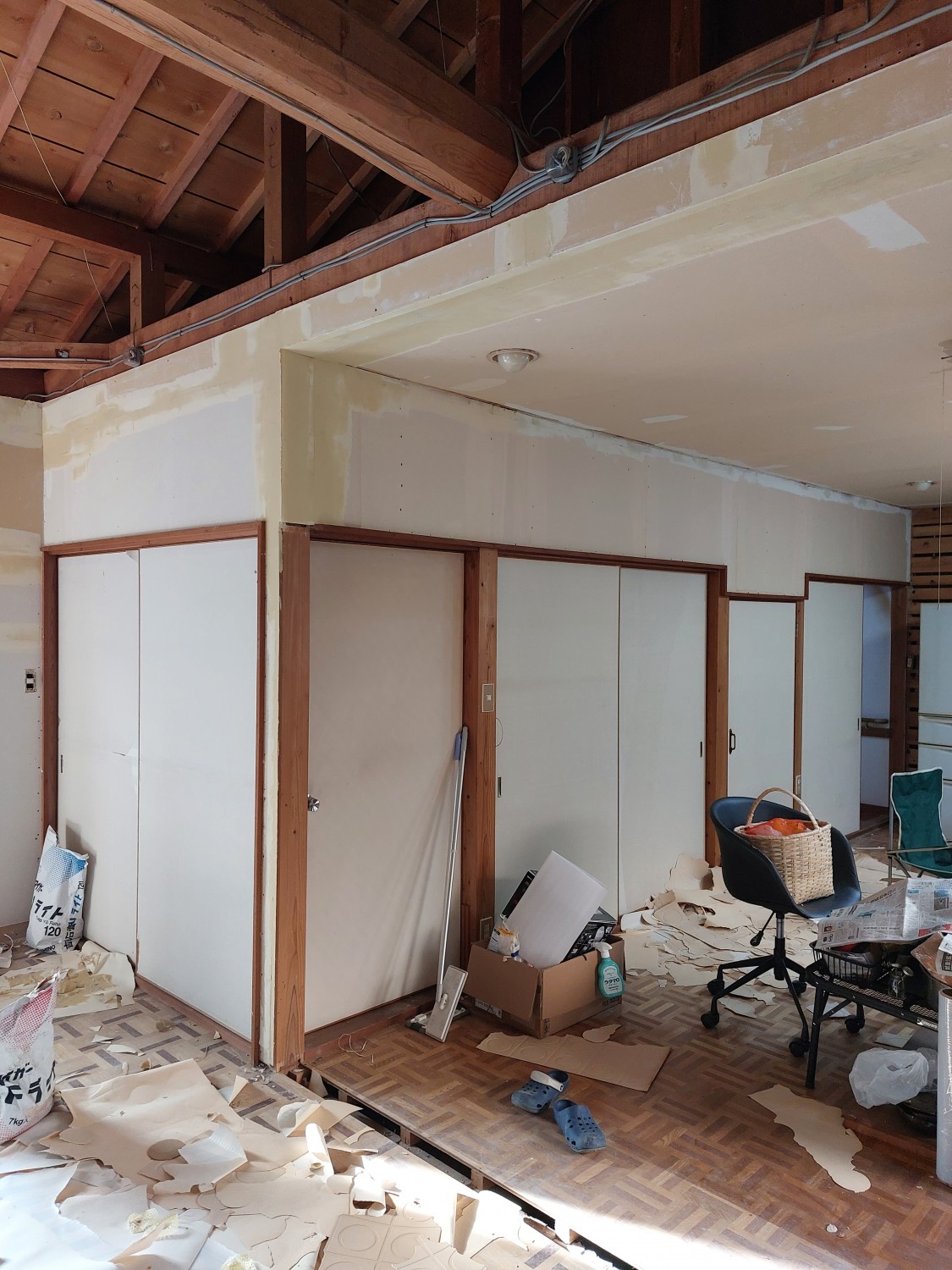 クロスを張る為に、既存のクロスをめくってからパテにて凸凹をならしました。