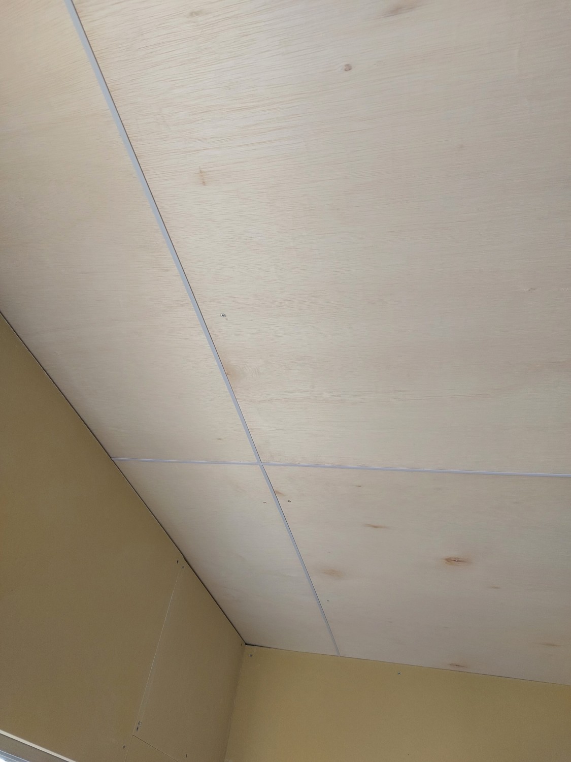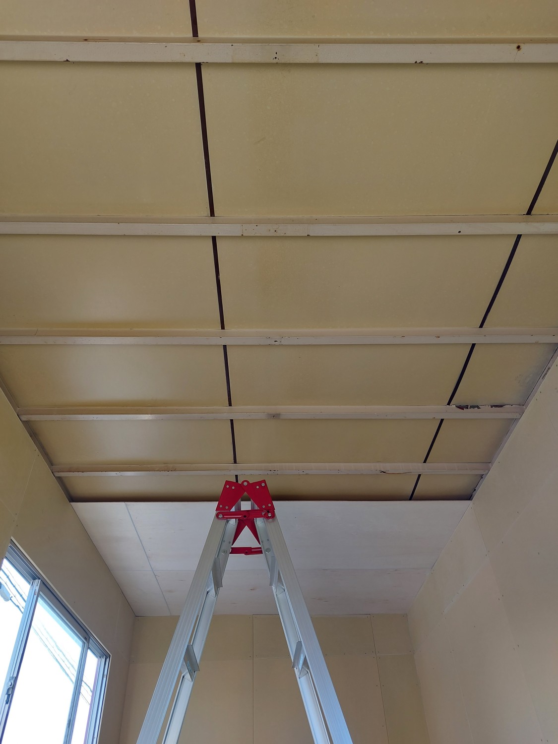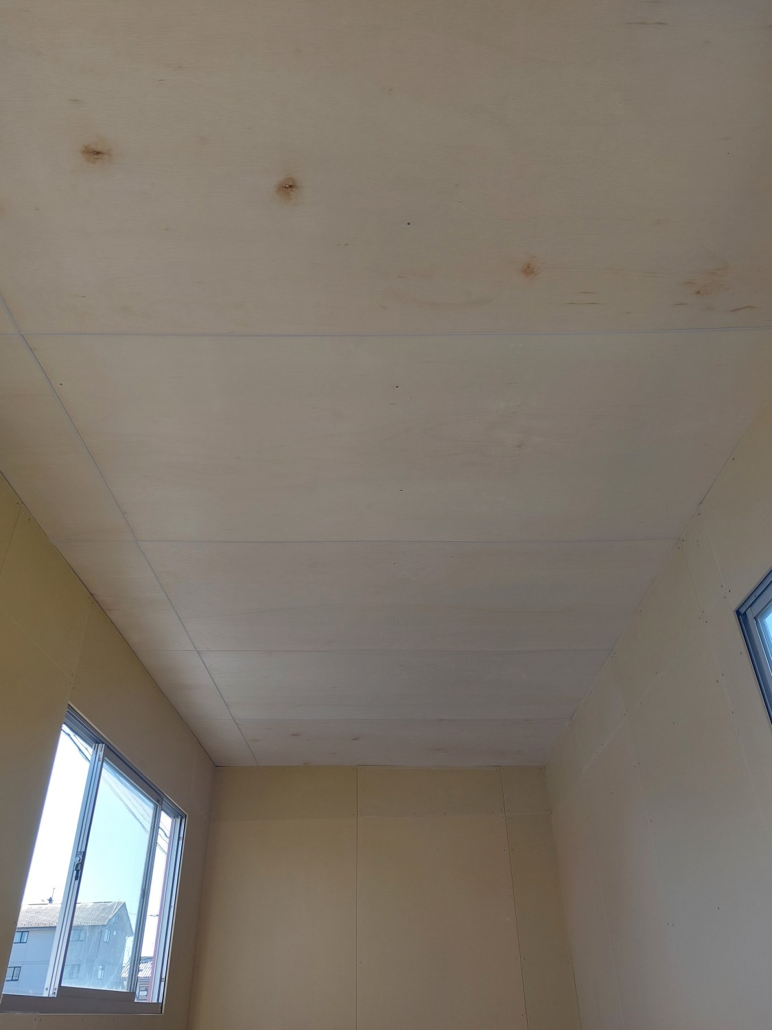 事務所作成にあたり、天井が剝き出しであったため、天井に木板を張りました。