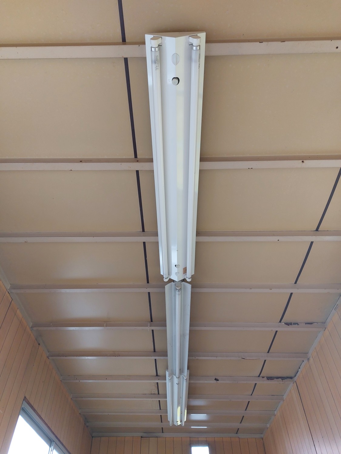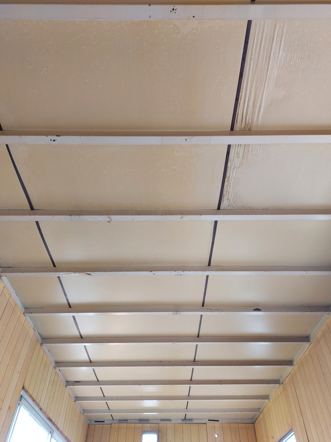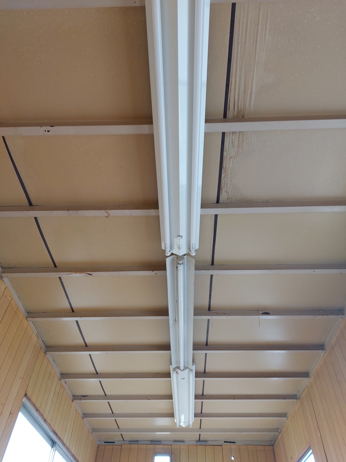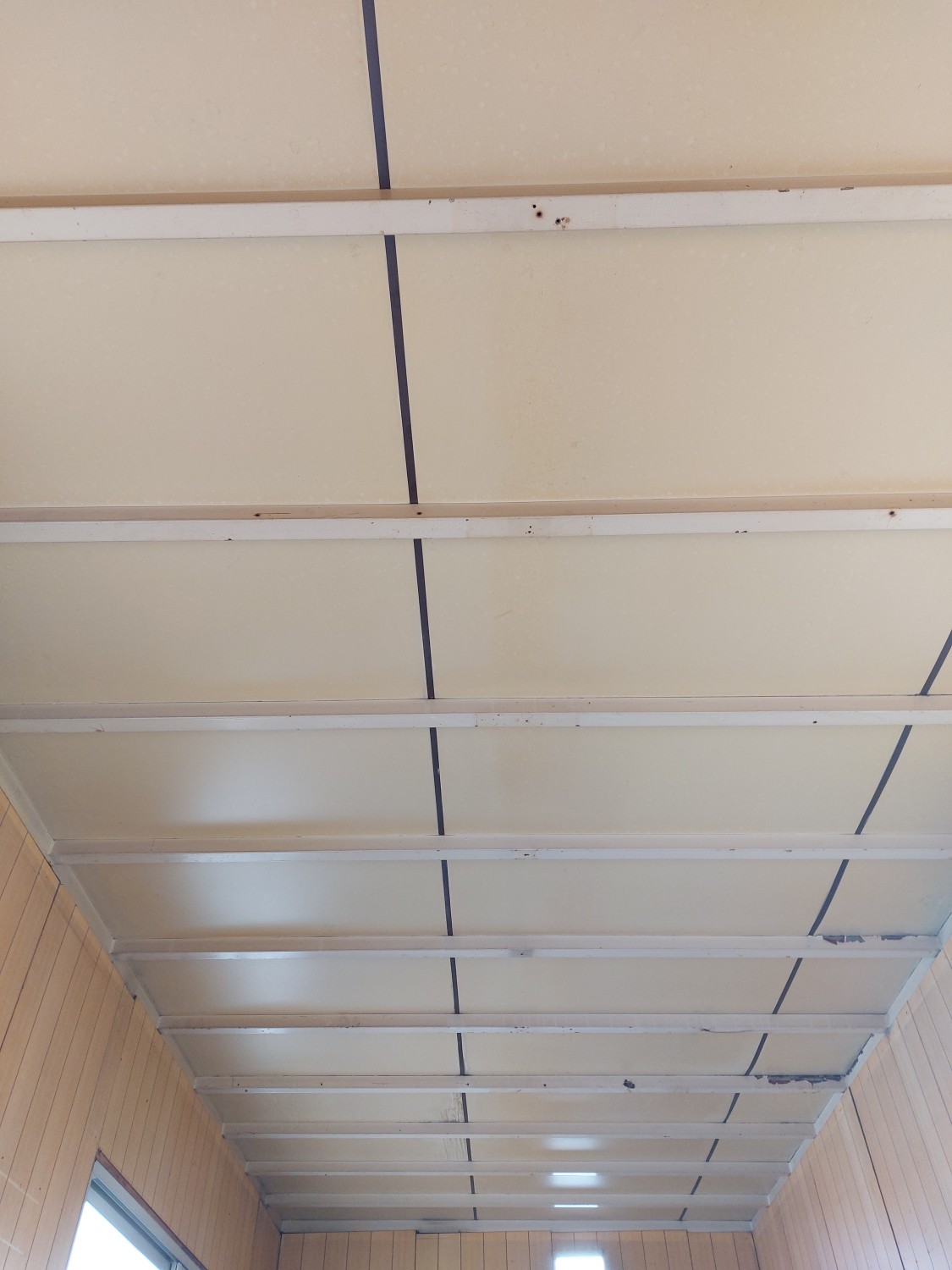 事務所作成にあたり、天井が剝き出しであったため、天井に木板を張りました。