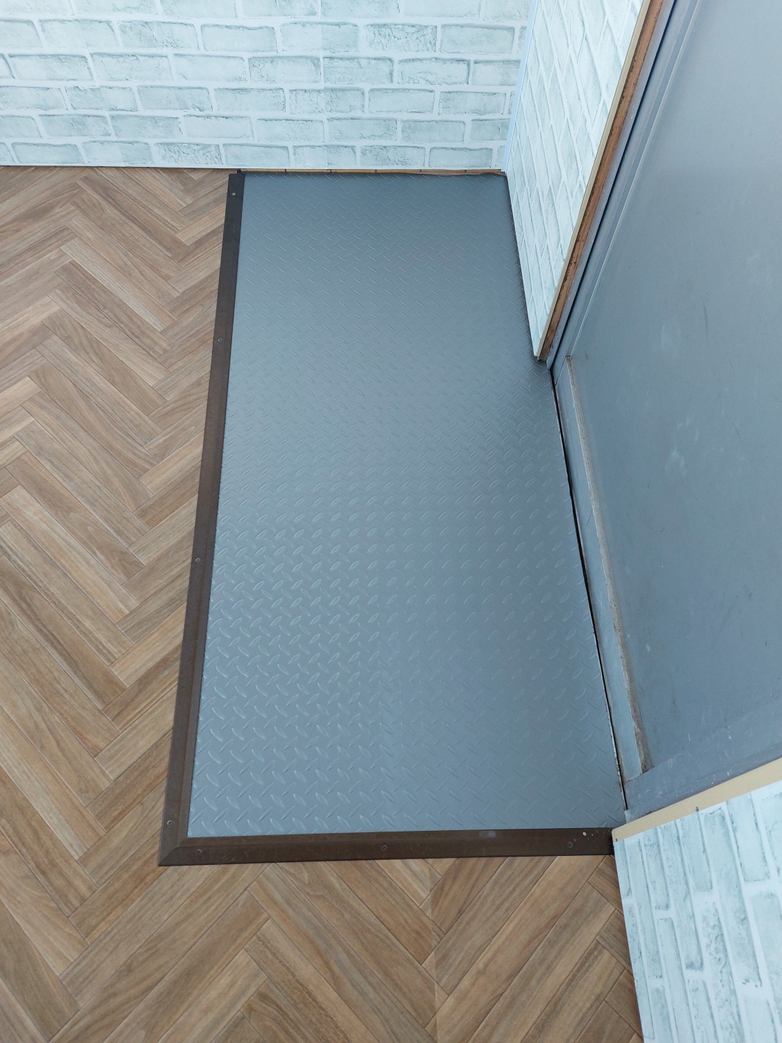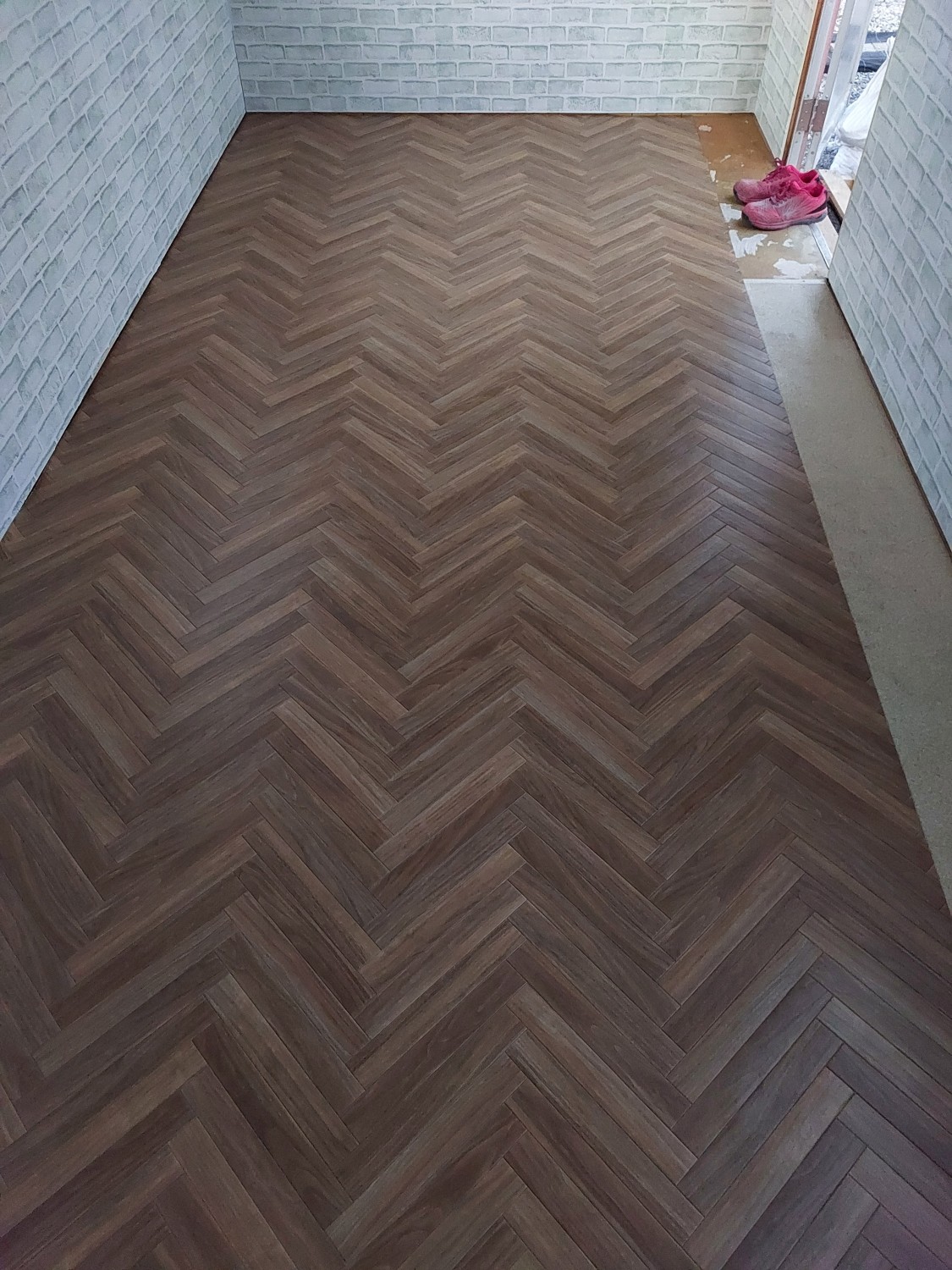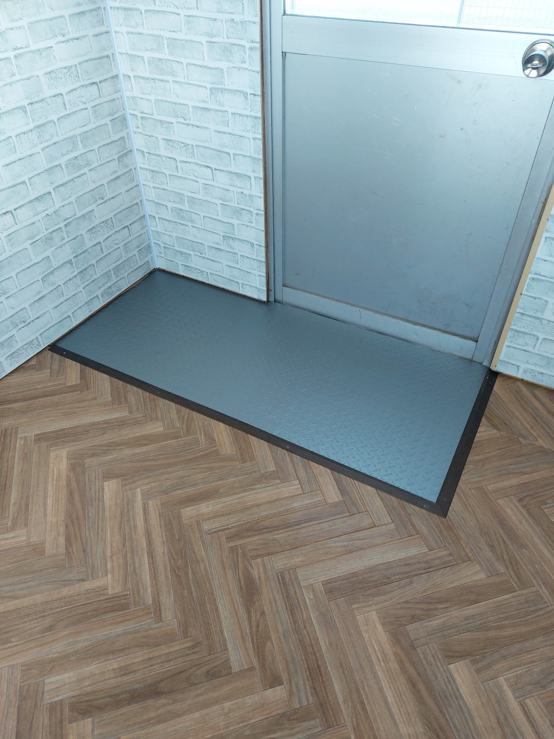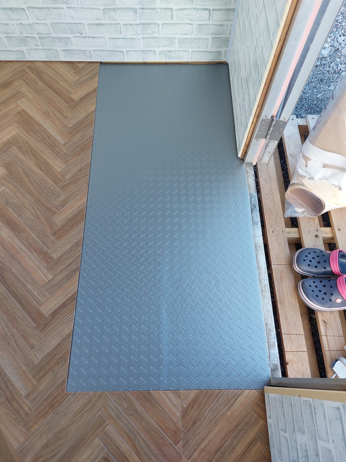 玄関部分は防水性のクッションフロアを敷いて、靴で上がれる玄関部分を作成しました。