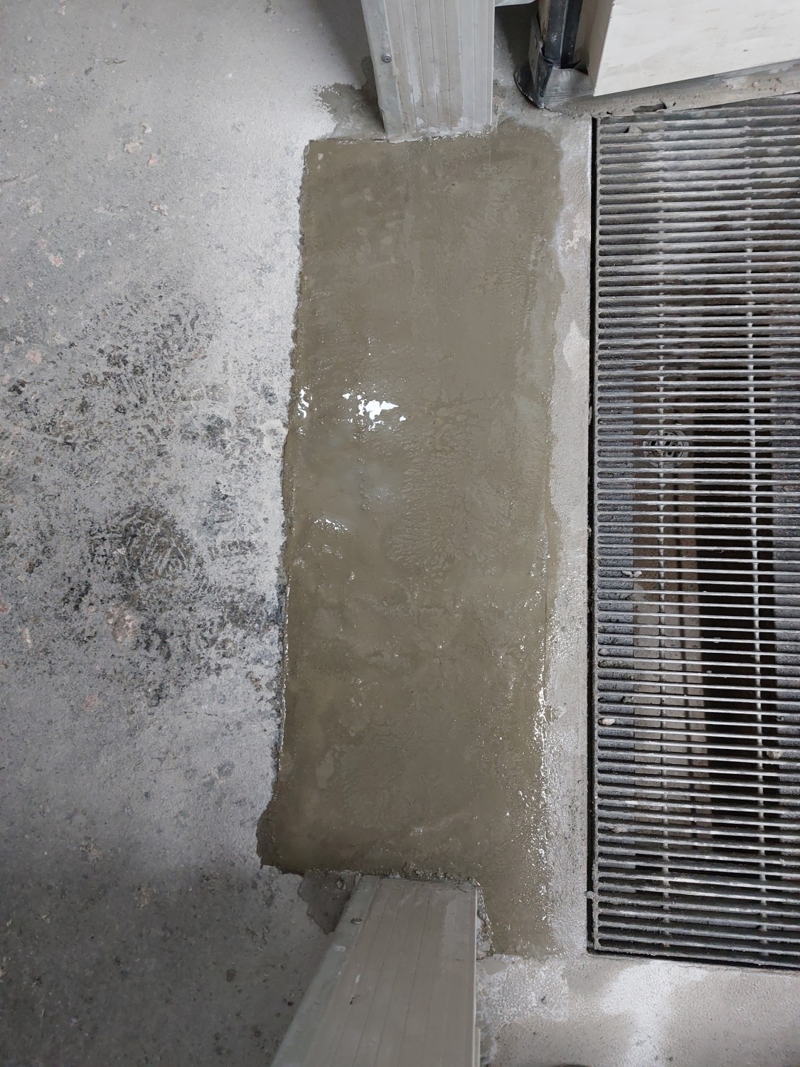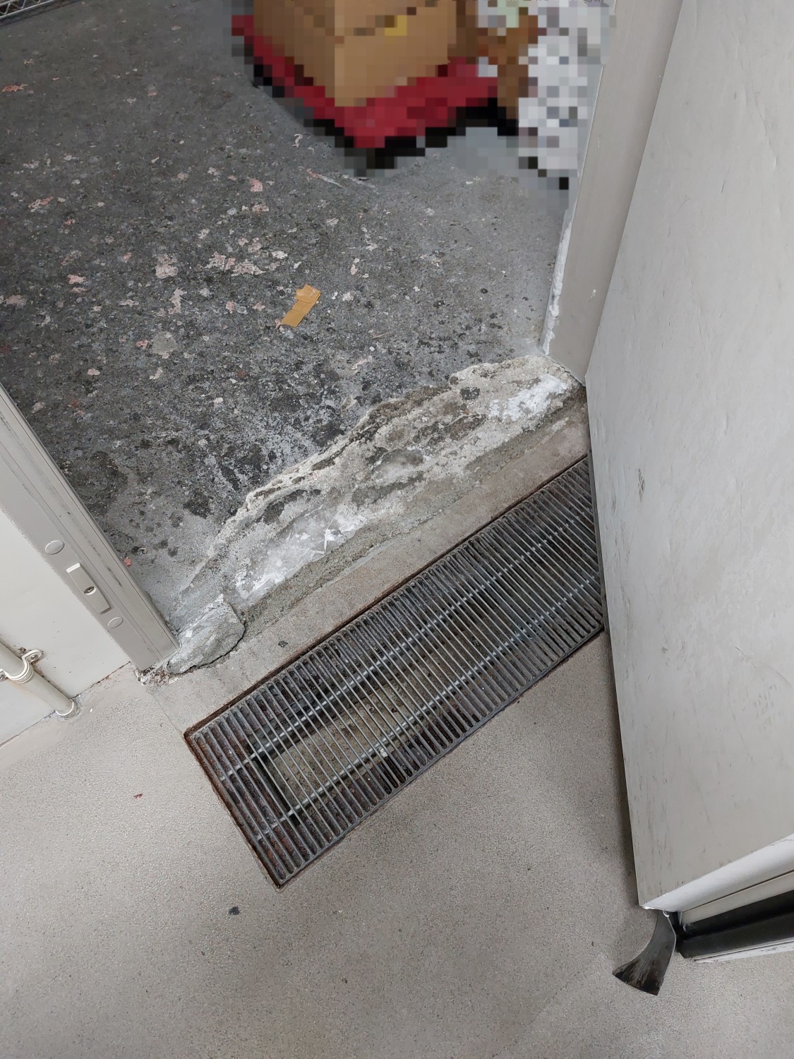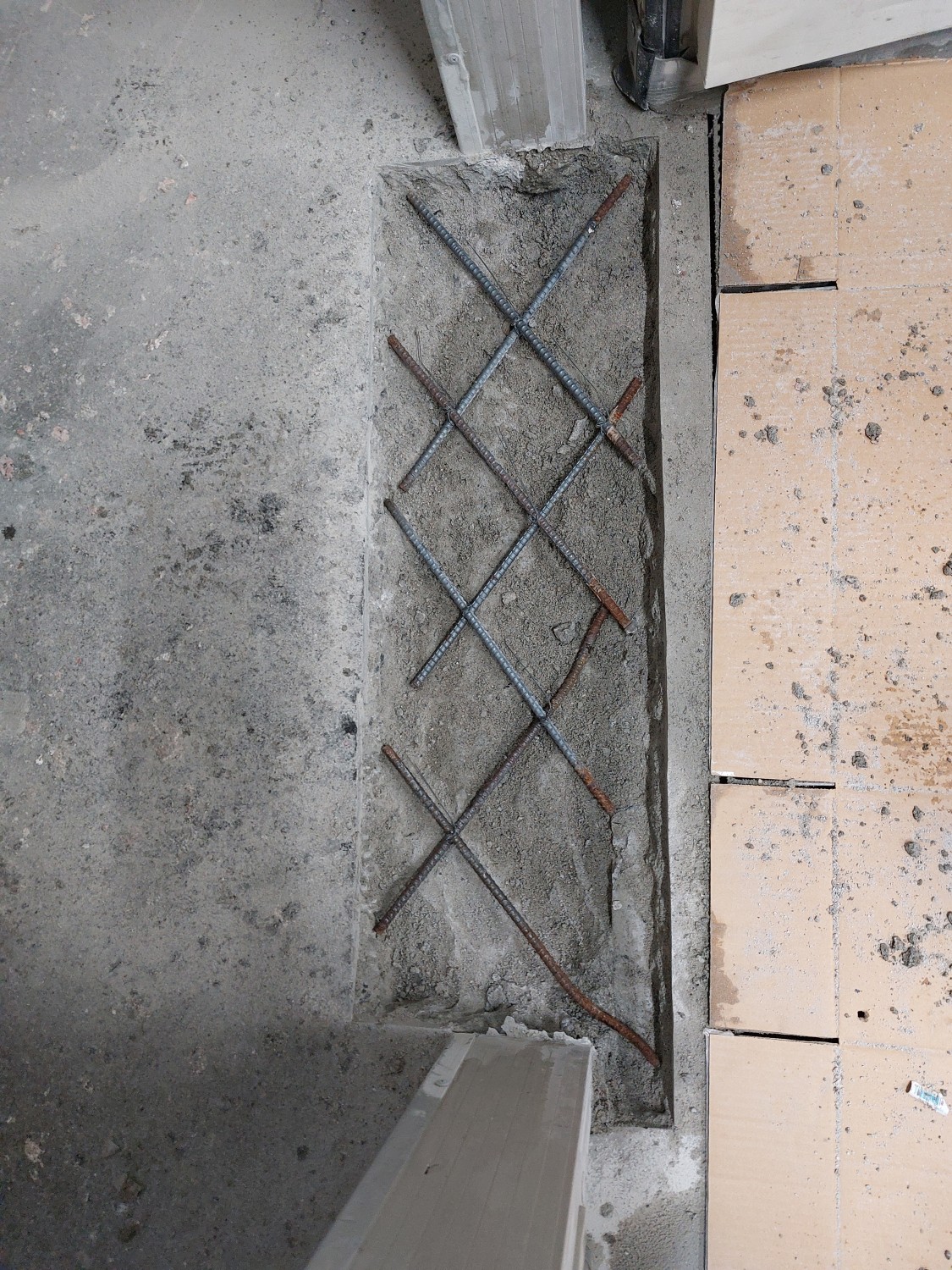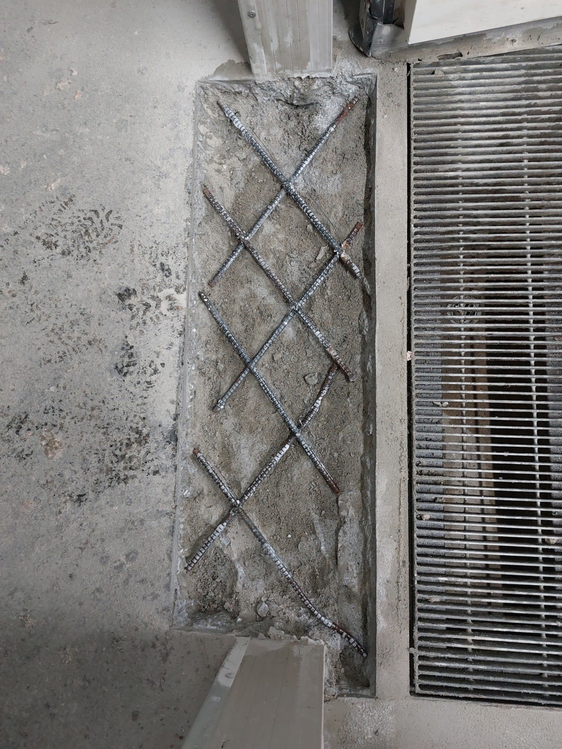 土間床が剝がれていましたので、カッターにて切込をおこないその後ハツリをおこないまして、ハツリ時に脆かった為に鉄筋を編み込んで入れて、モルタルにて補修をおこないました。