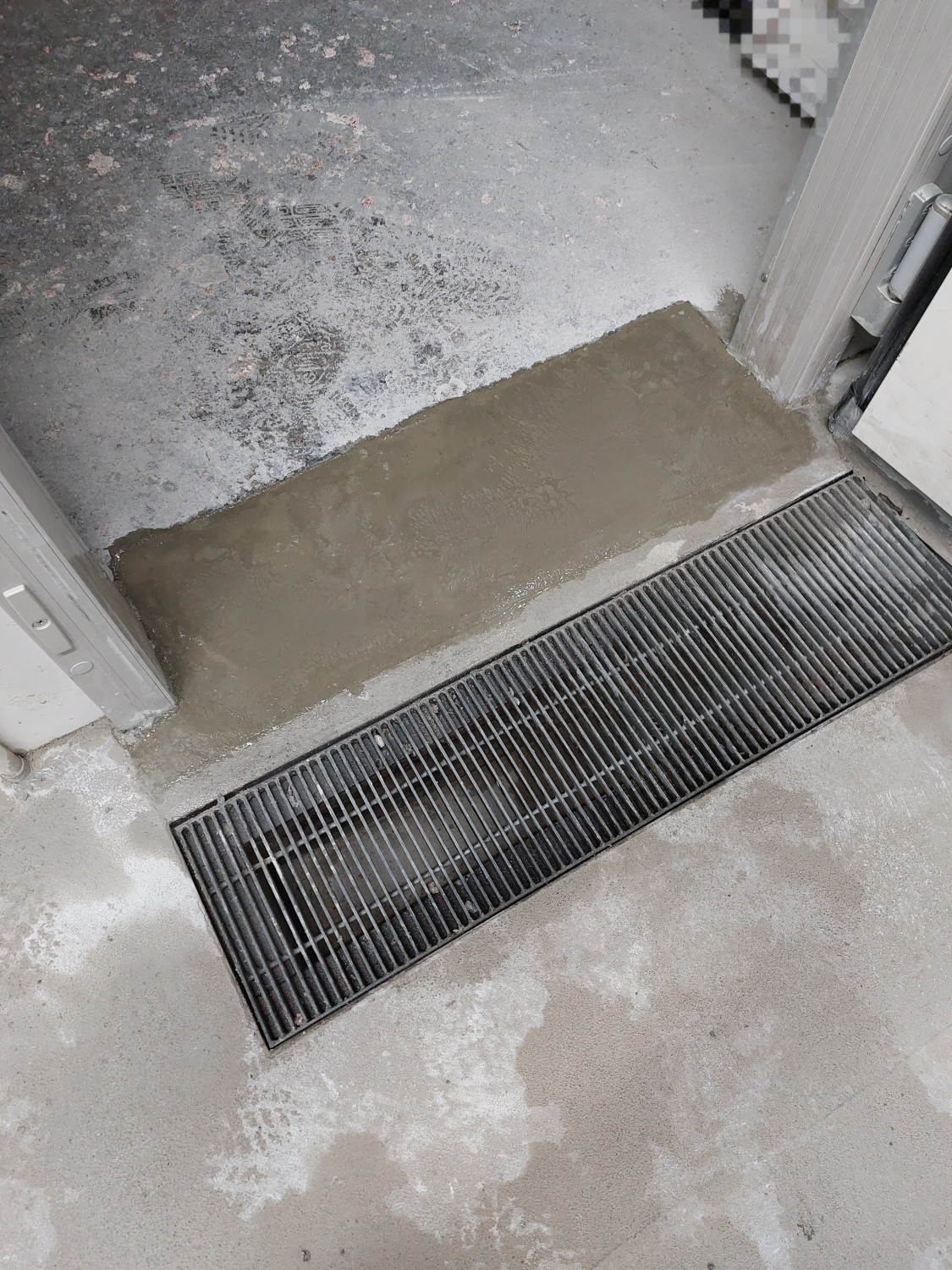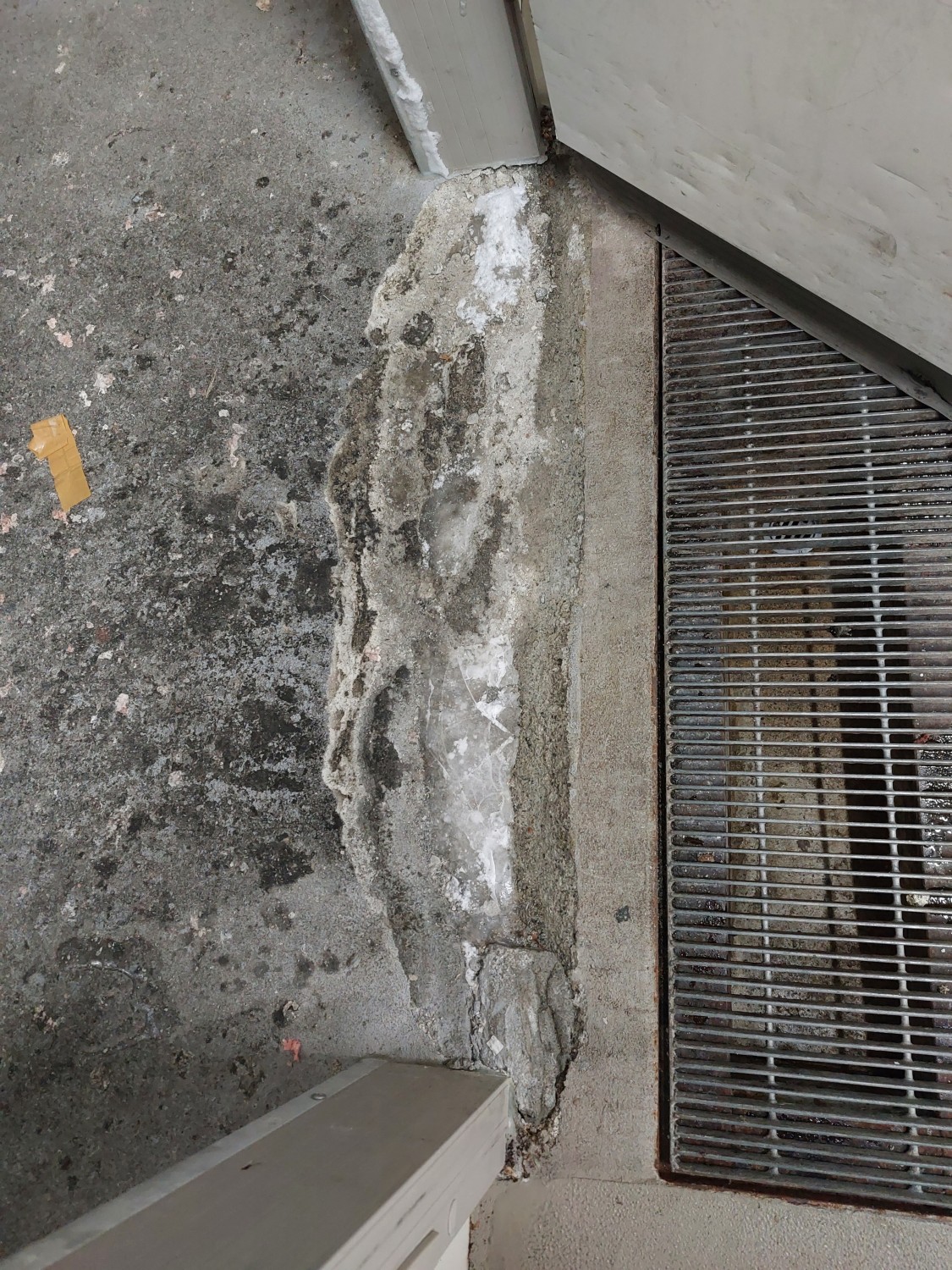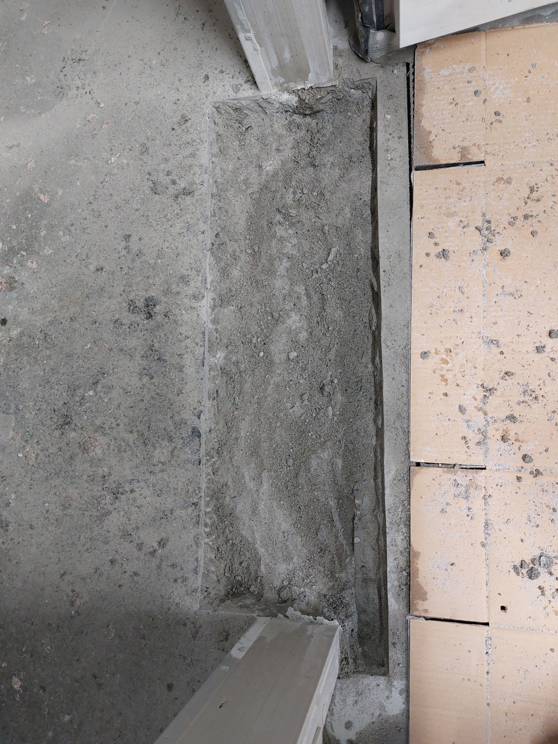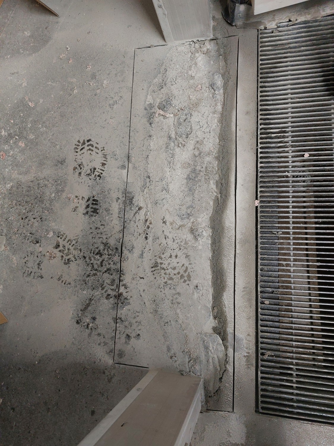 土間床が剝がれていましたので、カッターにて切込をおこないその後ハツリをおこないまして、ハツリ時に脆かった為に鉄筋を編み込んで入れて、モルタルにて補修をおこないました。
