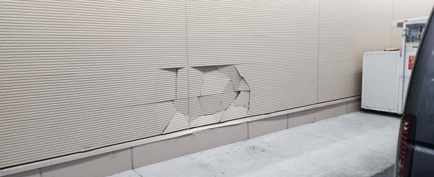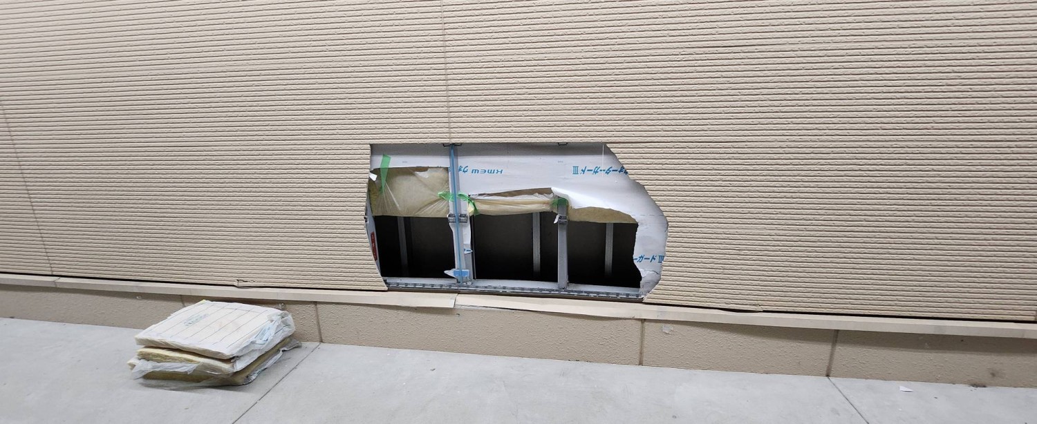壁の損傷しておりますボード部分を撤去し、応急処置としましてコンパネ張りにて補修をおこないました。
