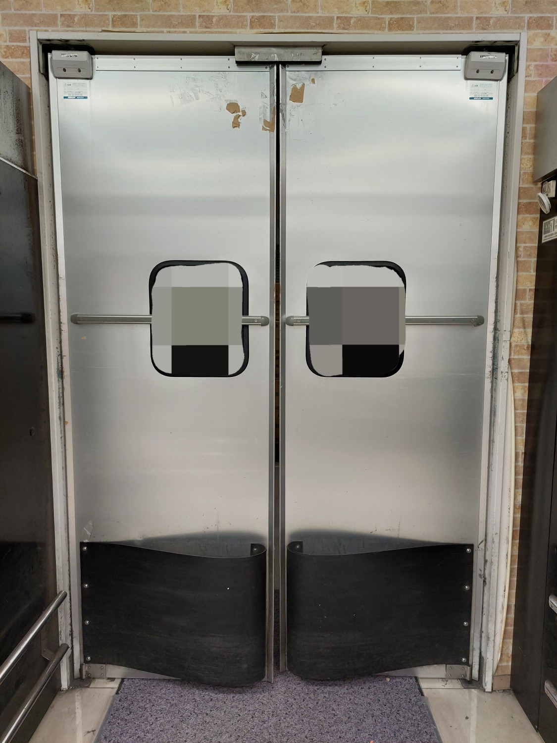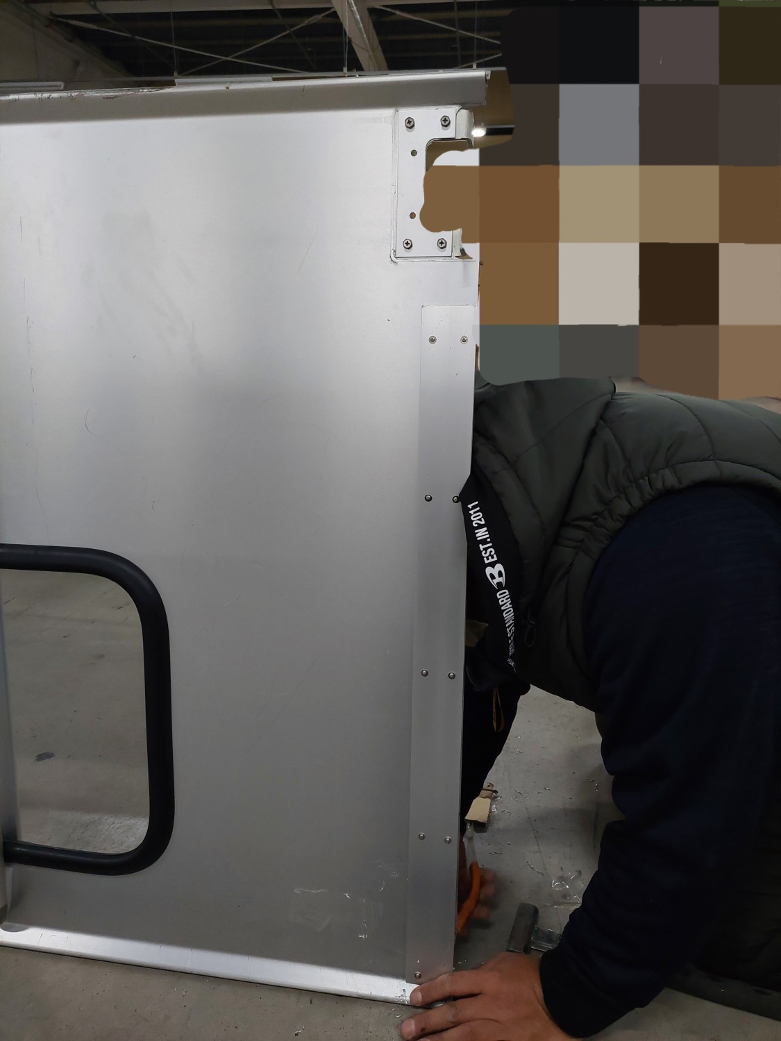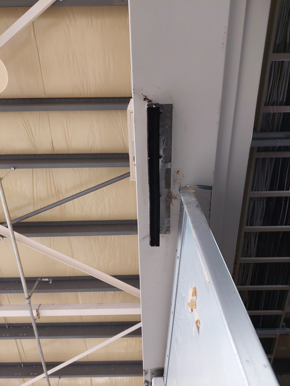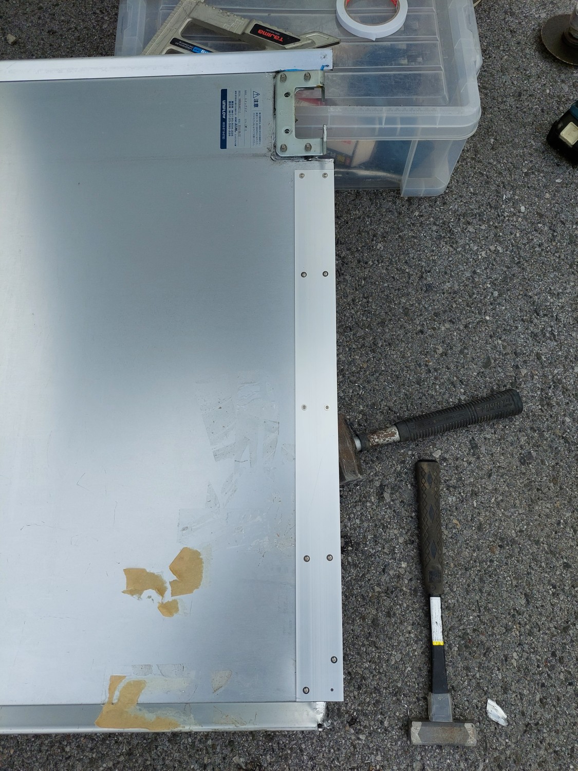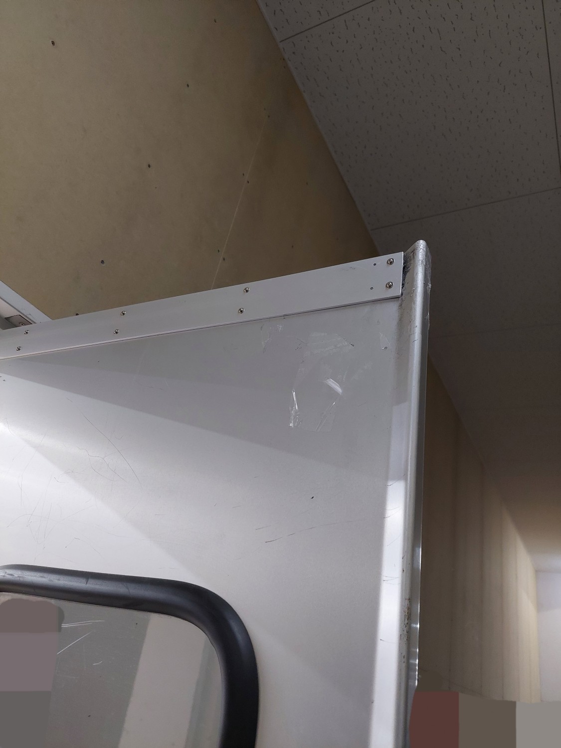 スイングドアが強風にてストッパーを超えて開いたため、上部が損傷を受けましたのでスイングドアの上部を応急処置(変形修復)及び補強を施しました。