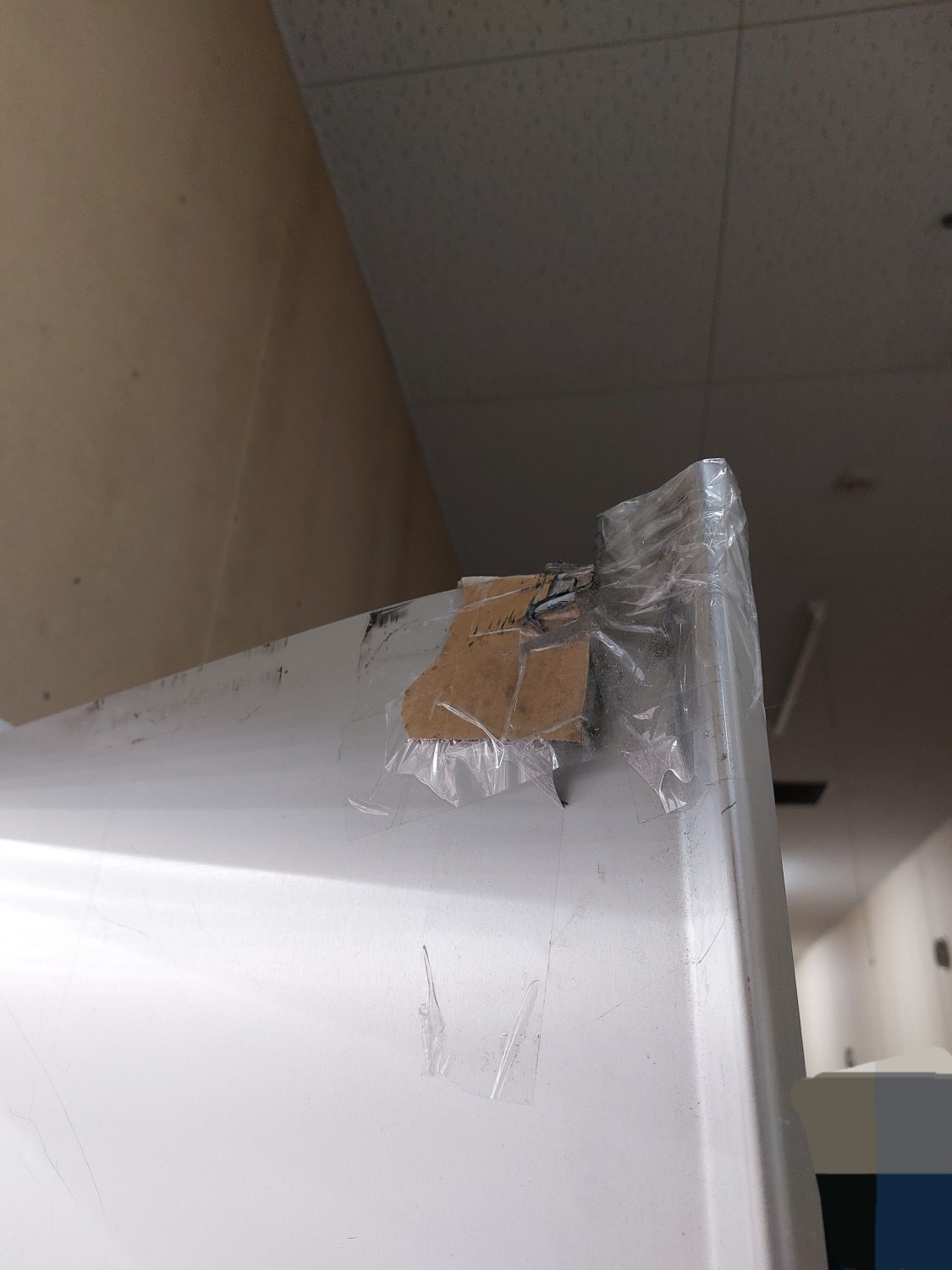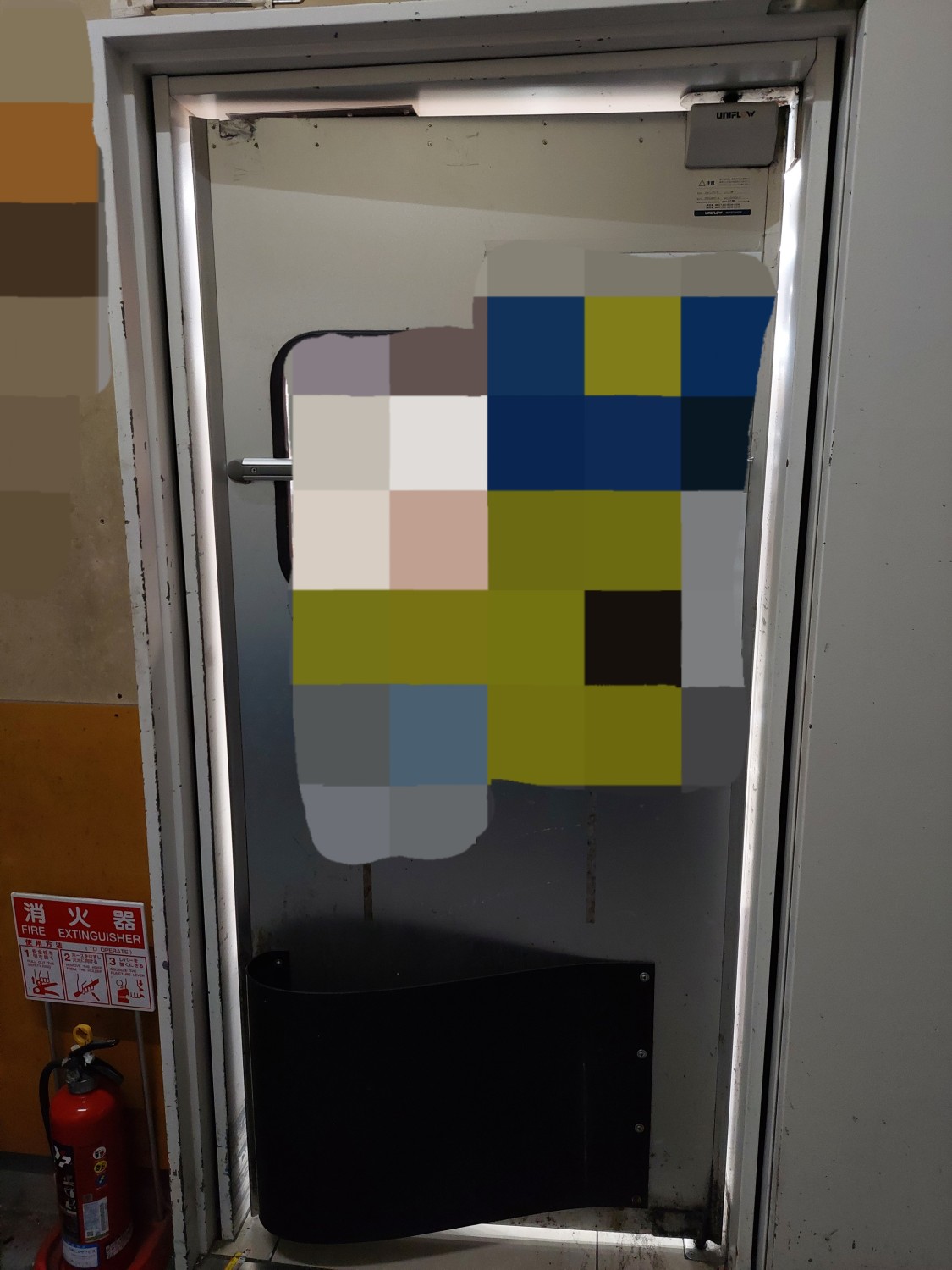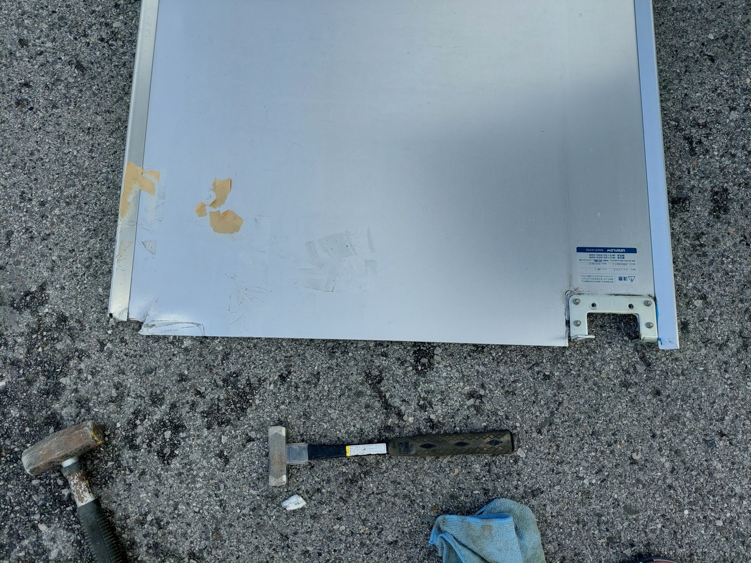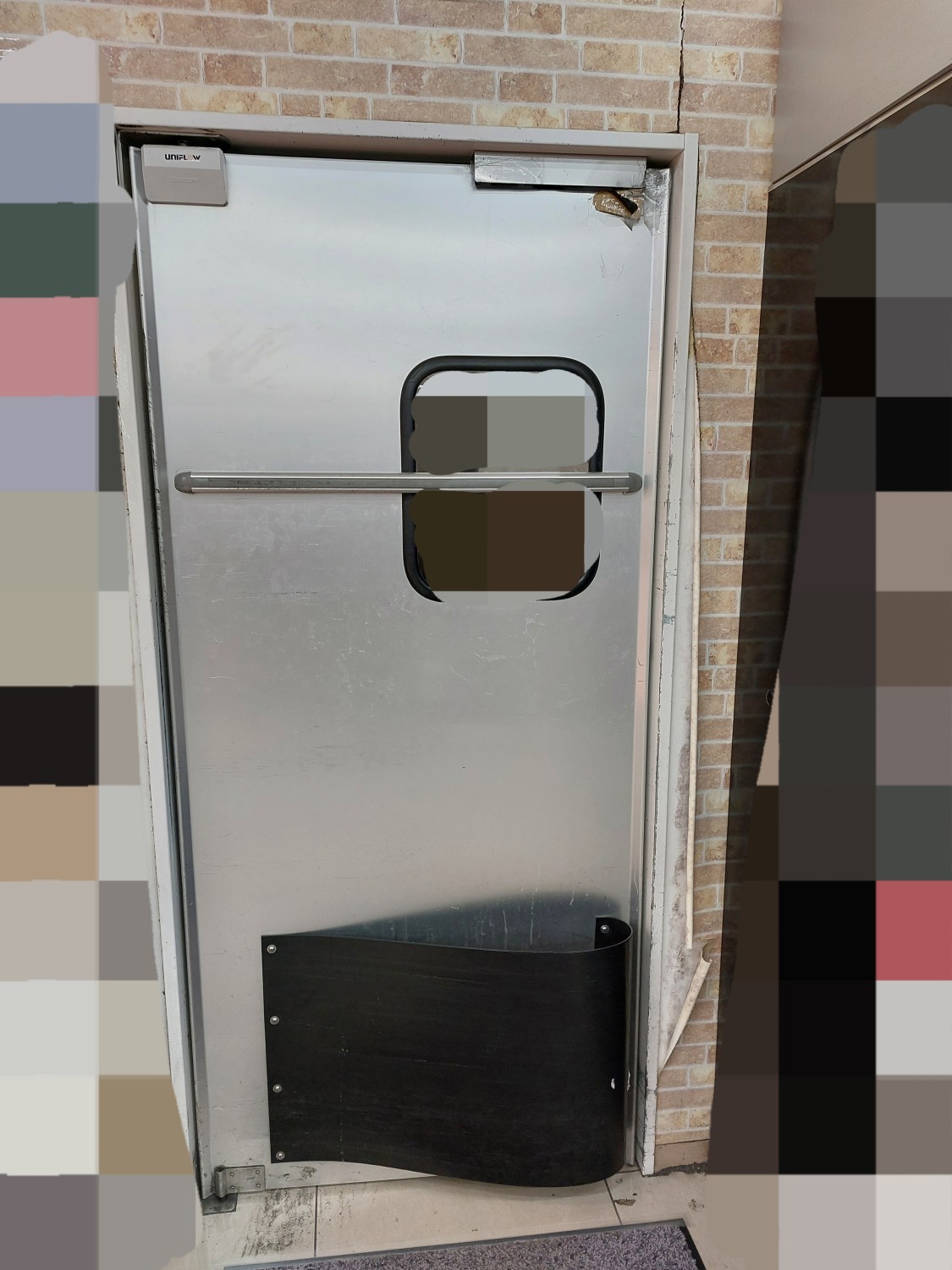 スイングドアが強風にてストッパーを超えて開いたため、上部が損傷を受けましたのでスイングドアの上部を応急処置(変形修復)及び補強を施しました。
