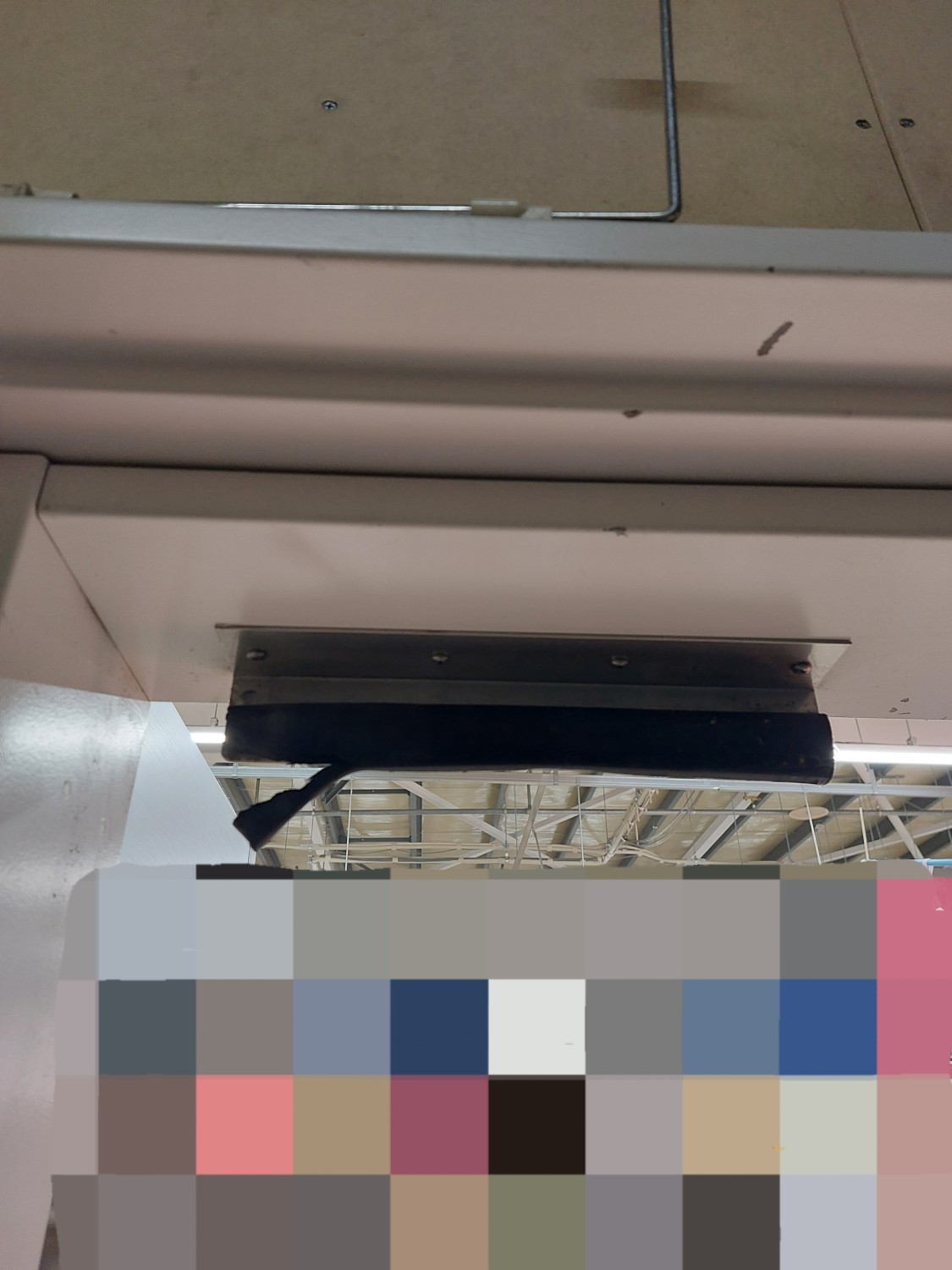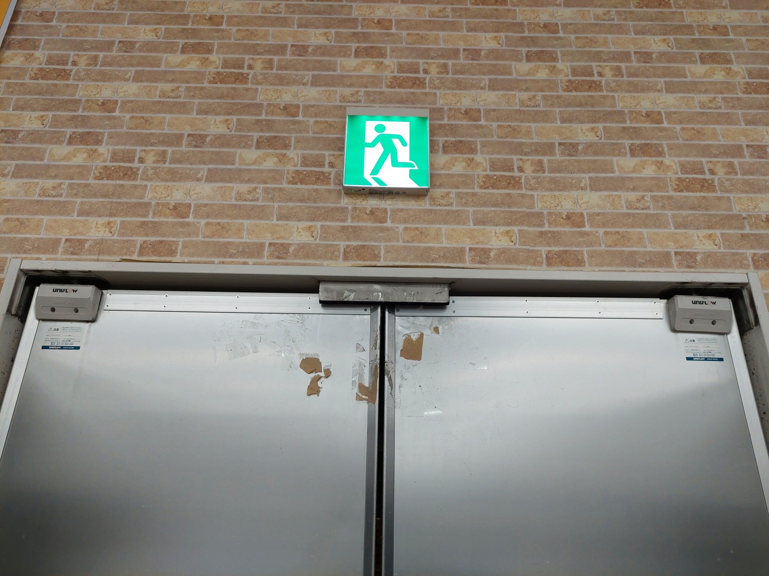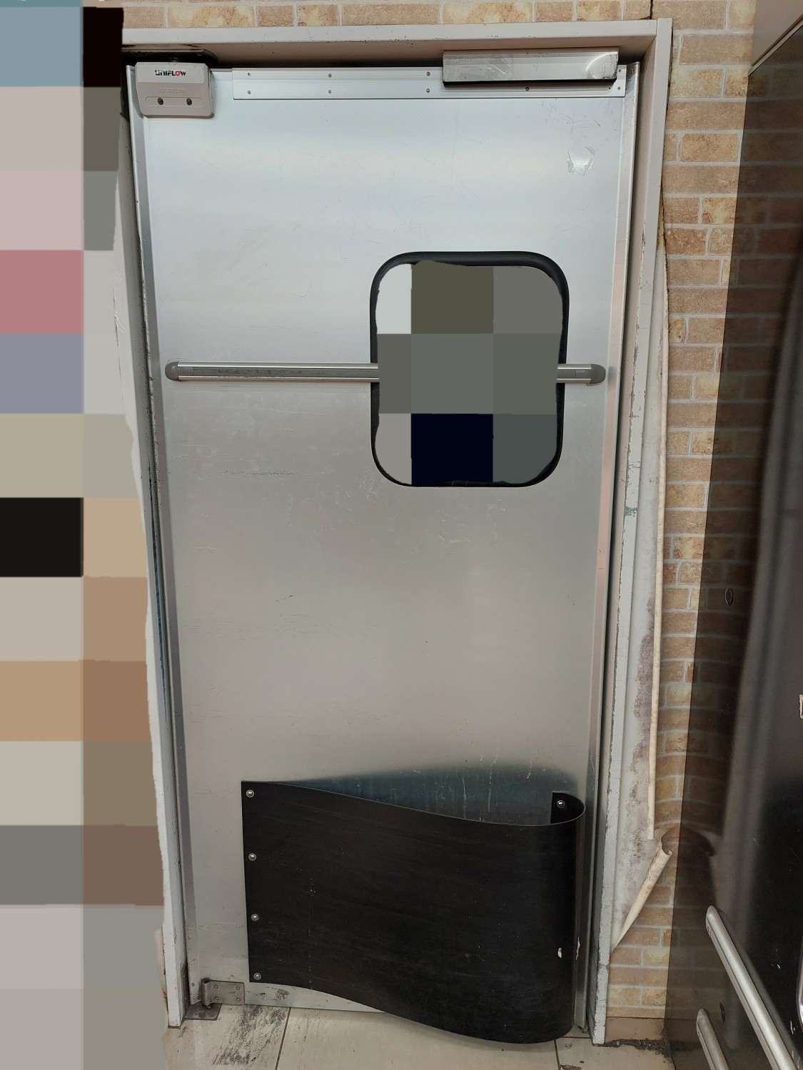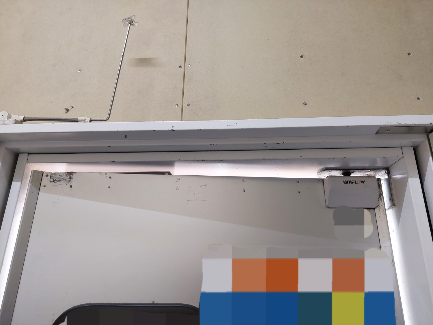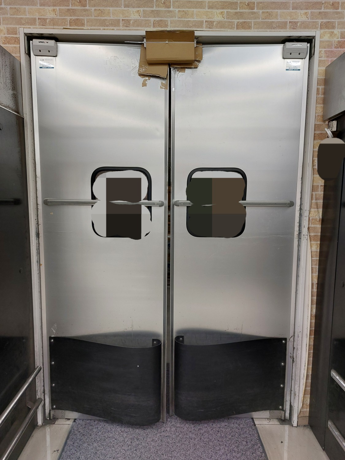スイングドアが強風にてストッパーを超えて開いたため、上部が損傷を受けましたのでスイングドアの上部を応急処置(変形修復)及び補強を施しました。