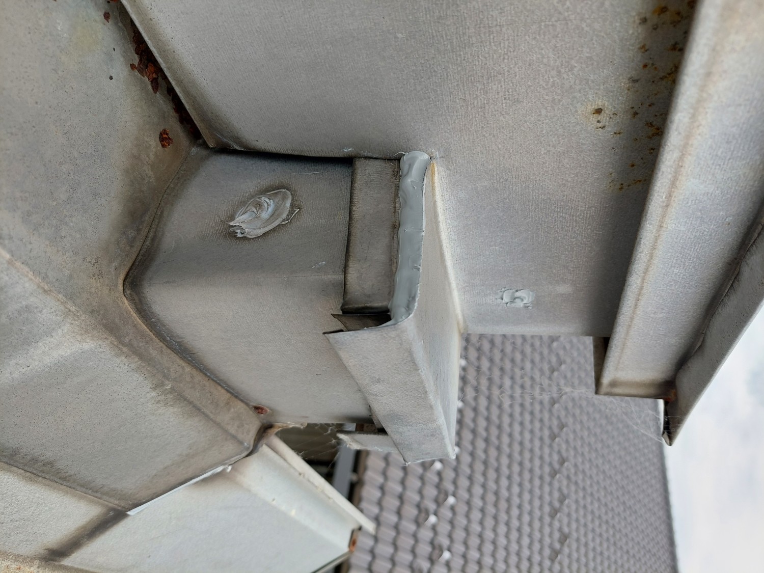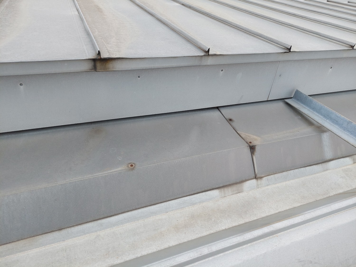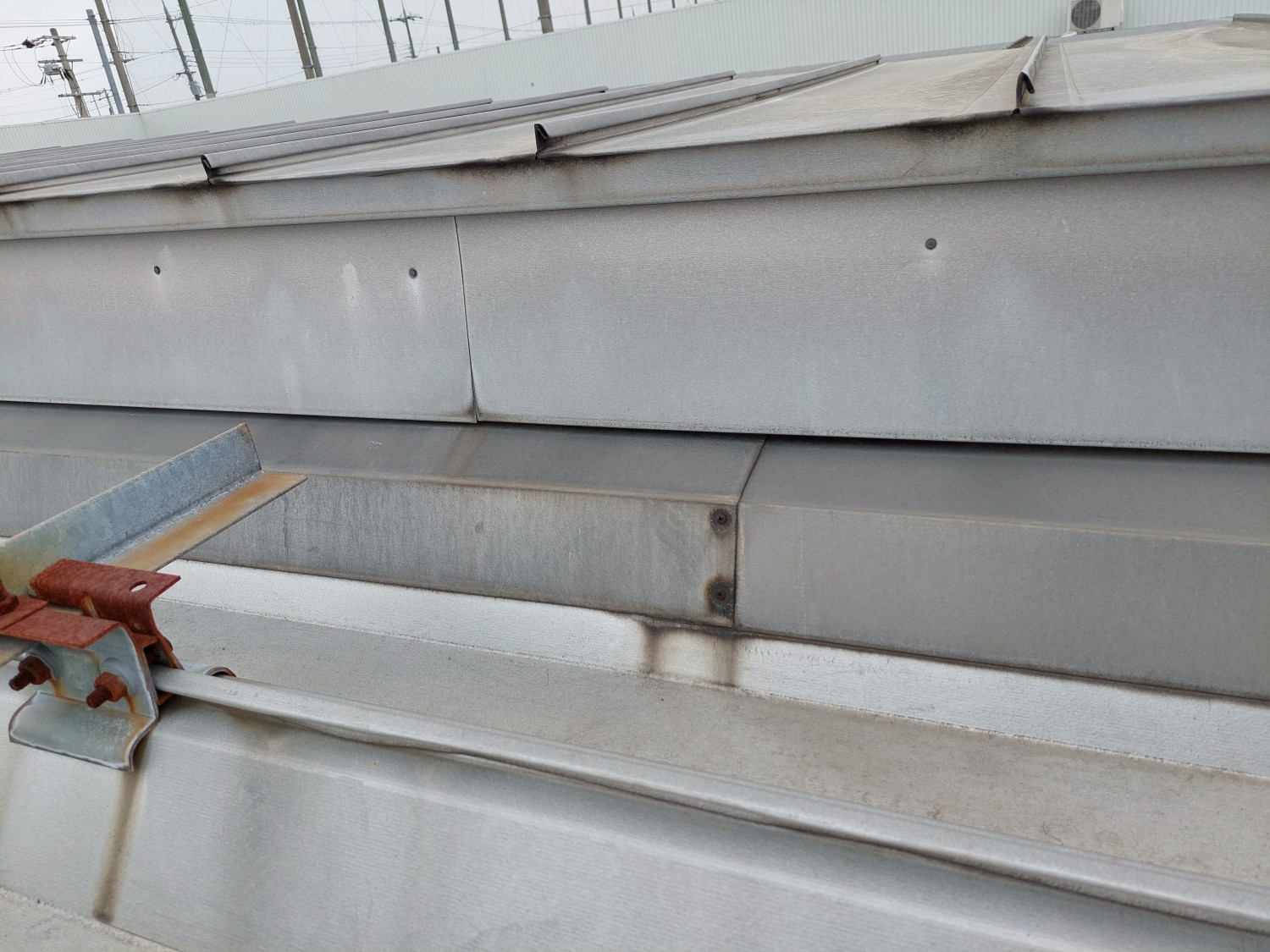 天井から雨漏りがありましたので、屋根を確認しましたところ金属屋根の取り合い部であったため、その箇所の繋ぎ目・ビス・被せ部等をシーリング補修しました。