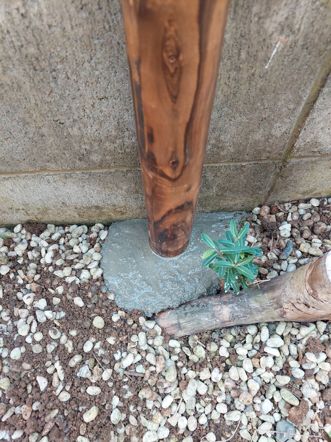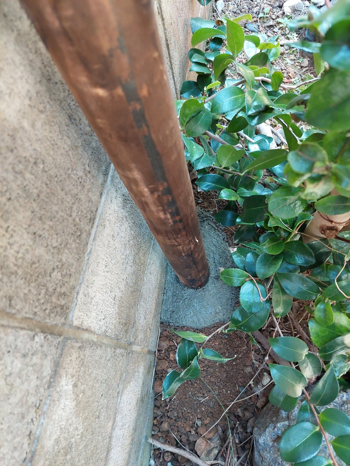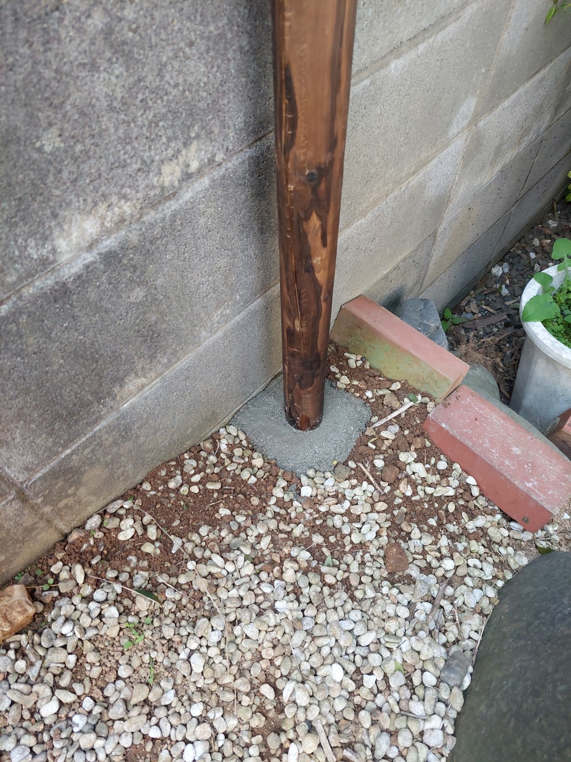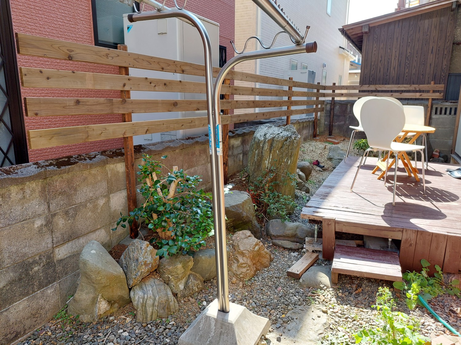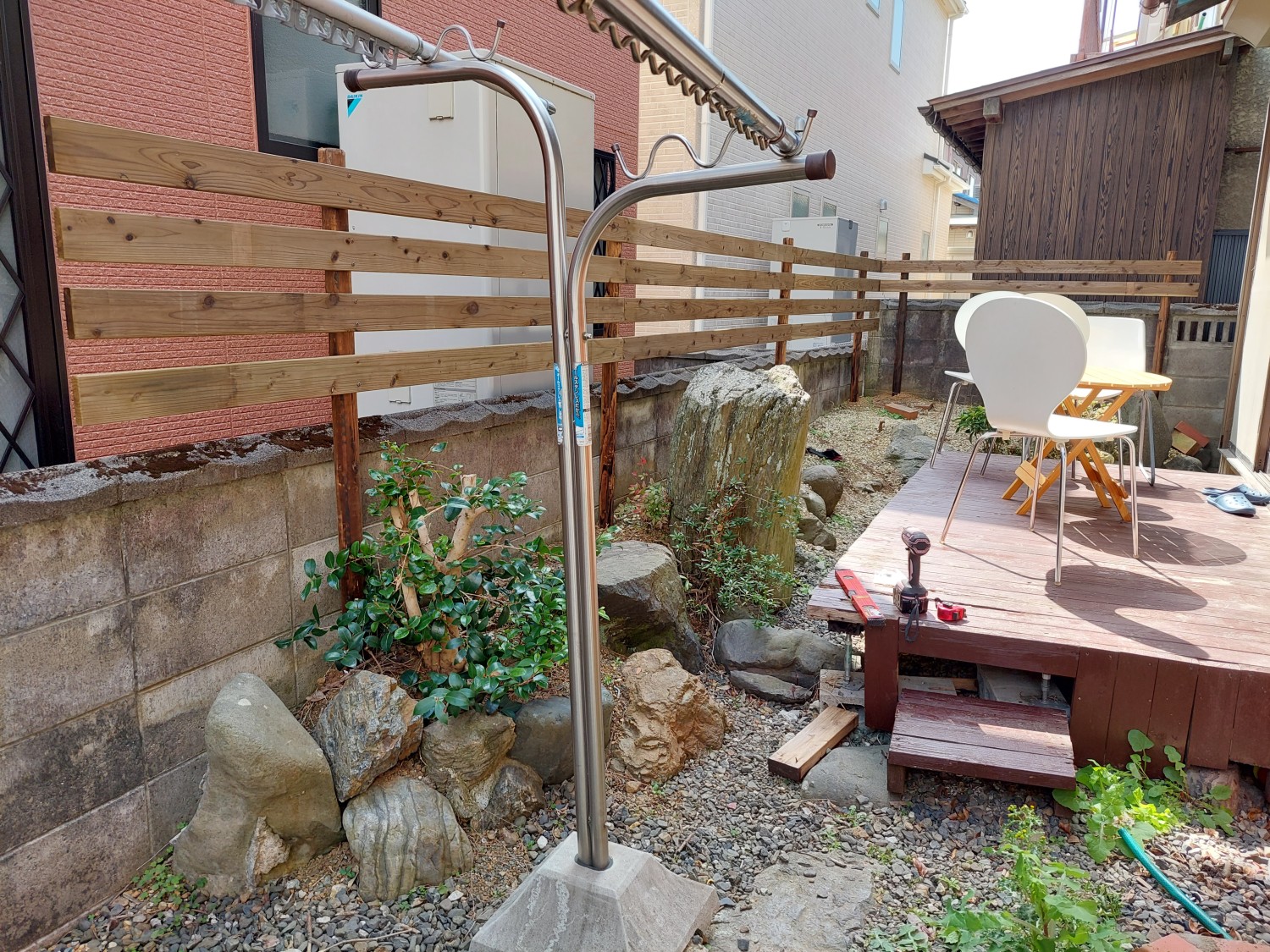 お庭のブロック塀の上からペットの犬が外へ出ないように、ブロックから上の部分にフェンスを設置しました。