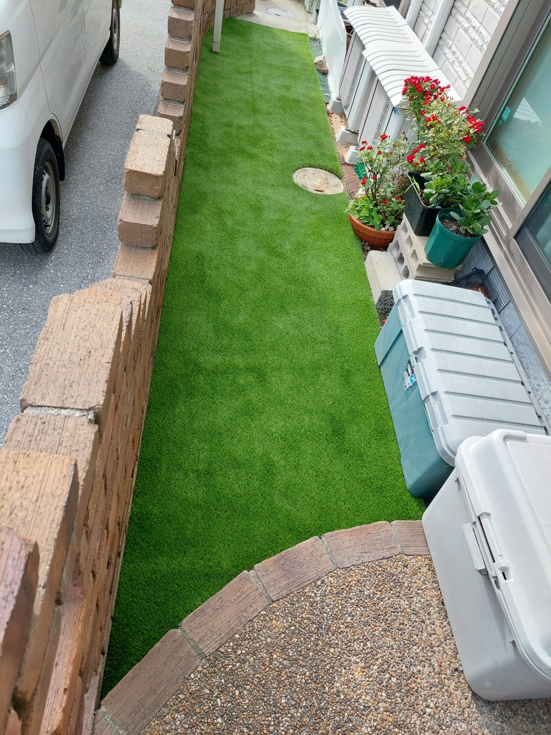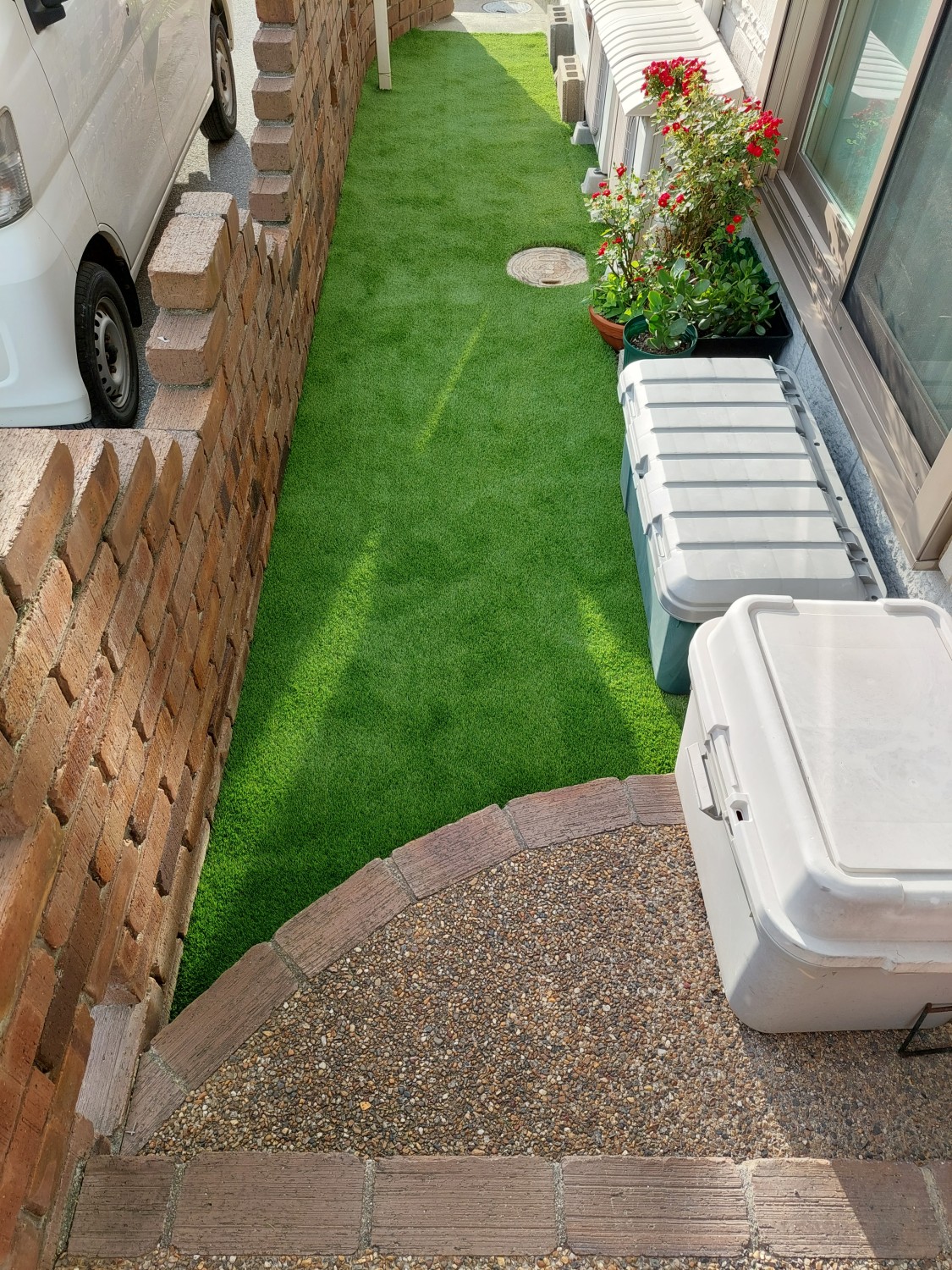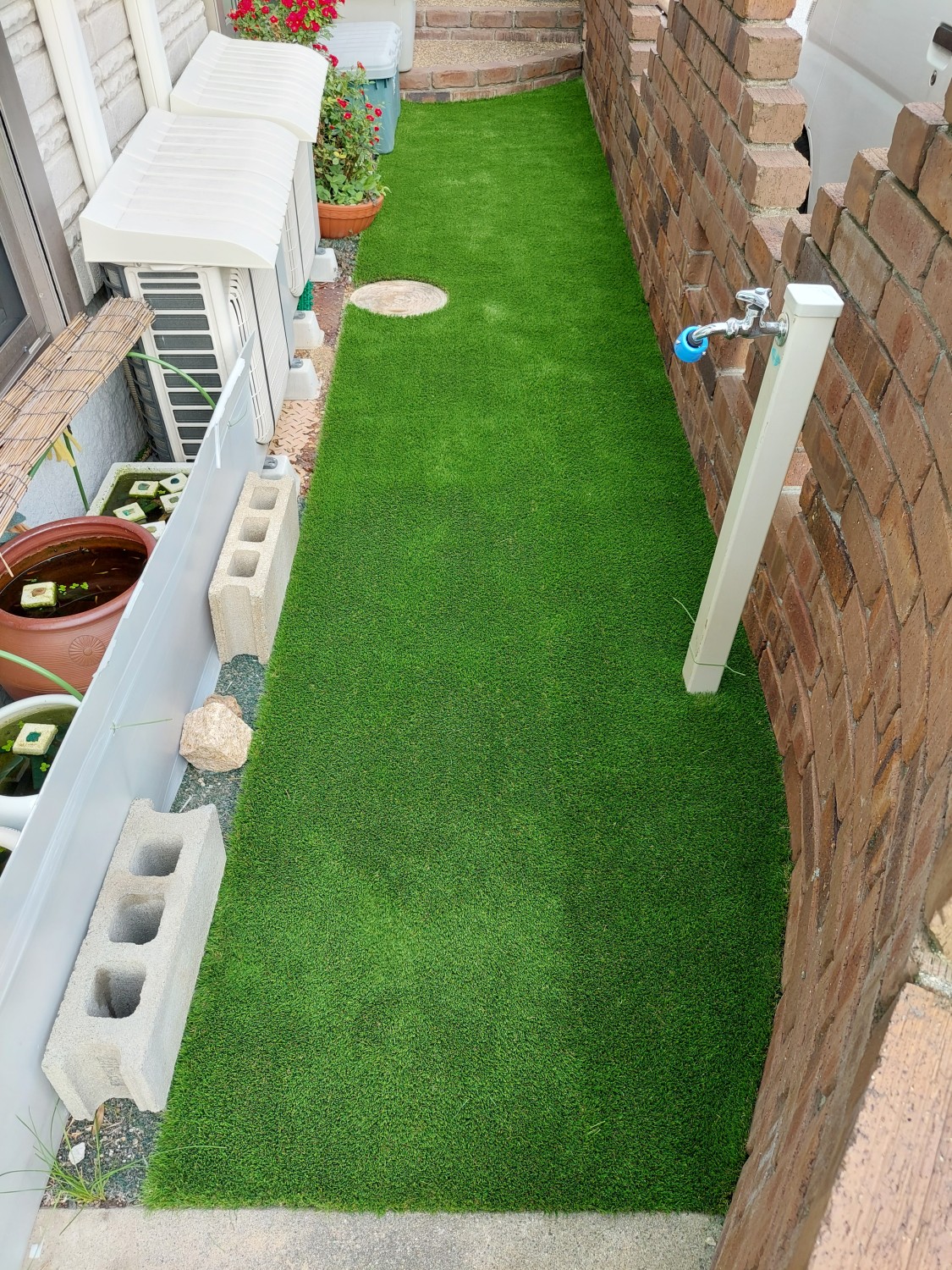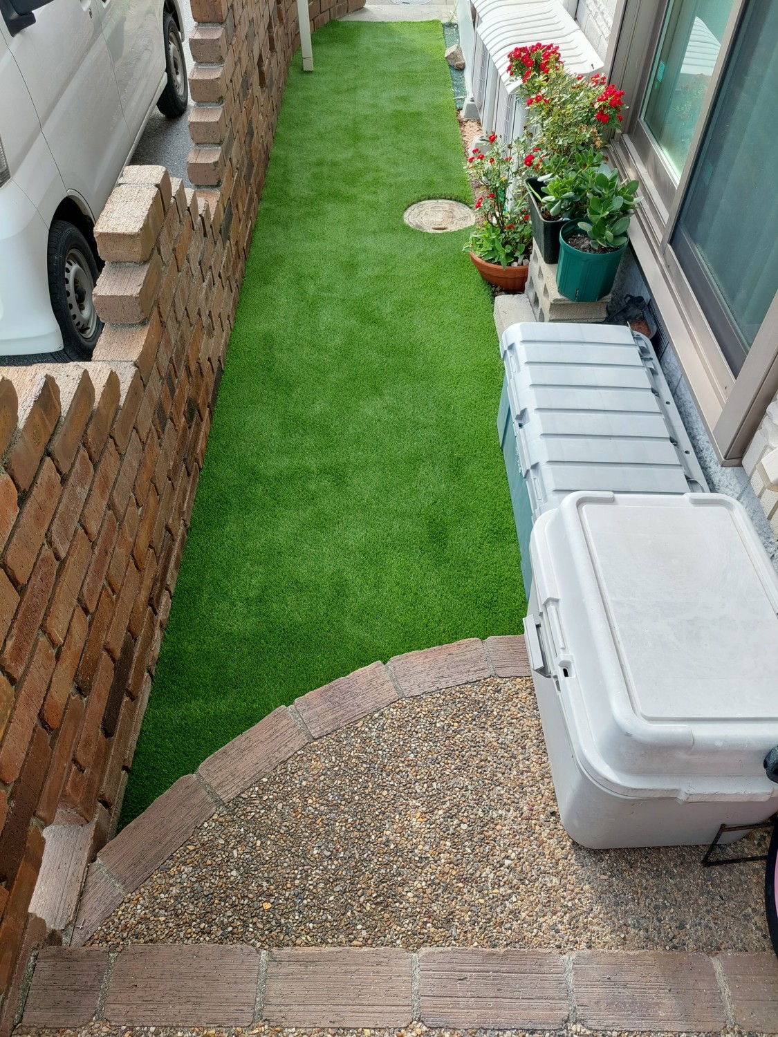 既存の人工芝がヘタっていましたので、防草シート性能を含んだ一体型になっている人工芝を敷きました。