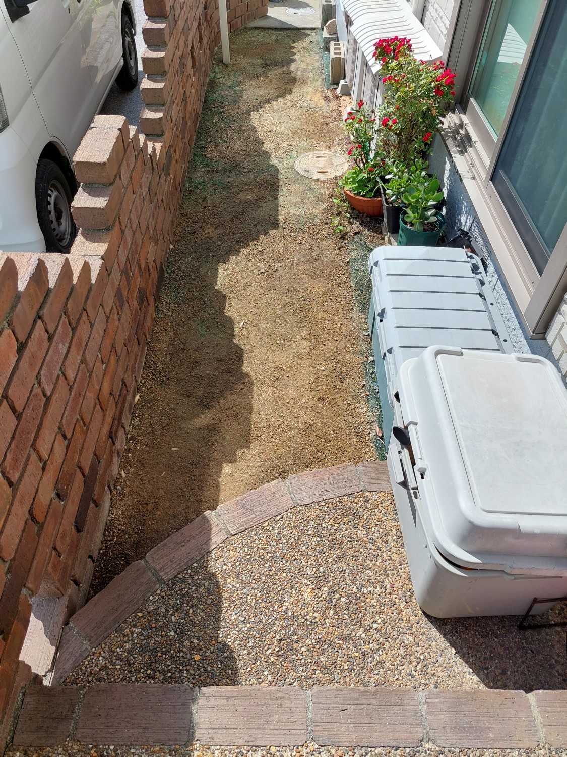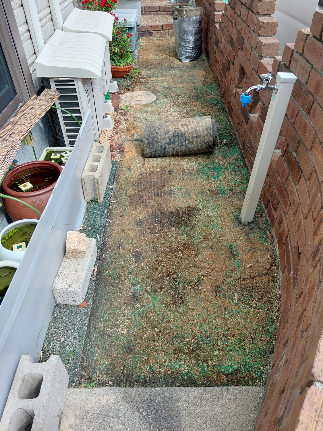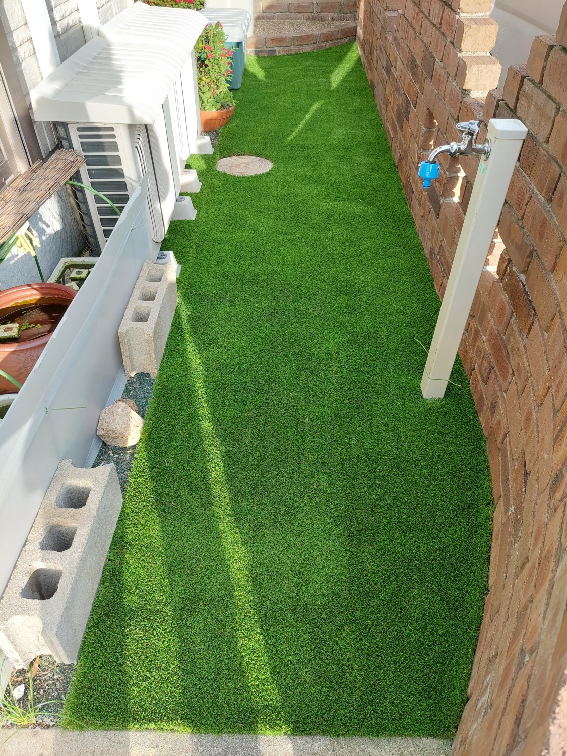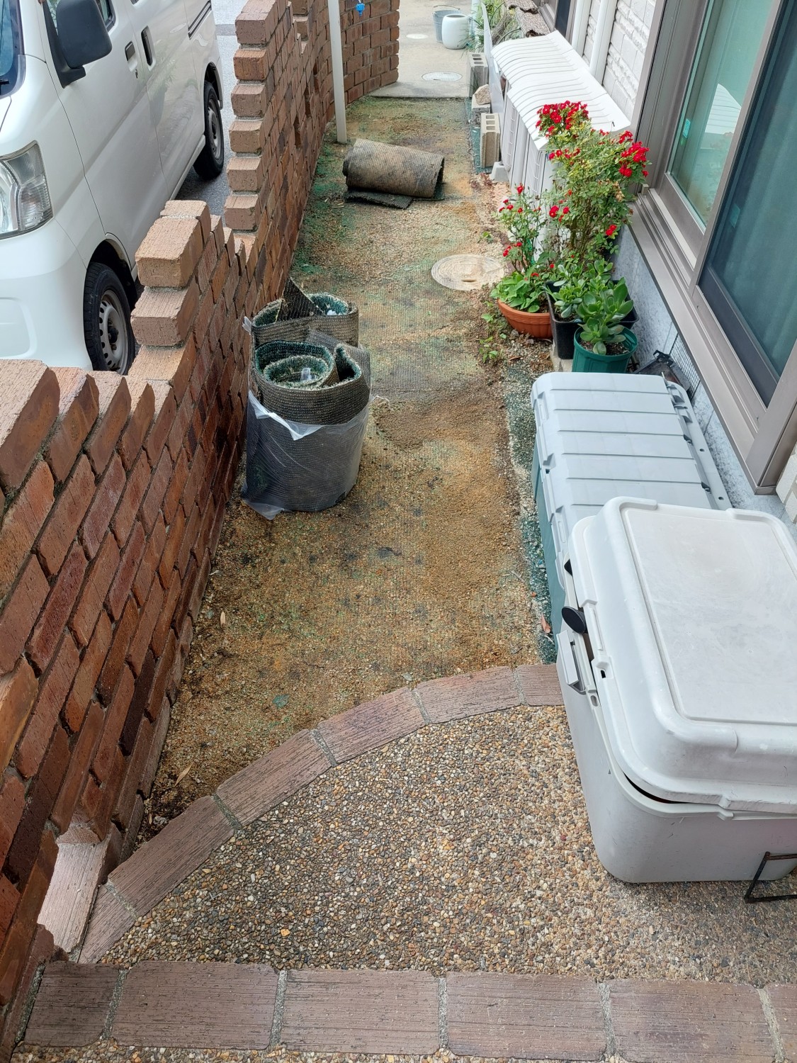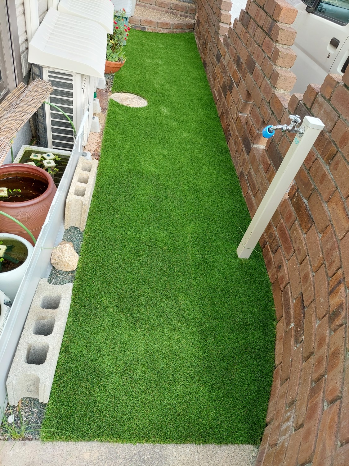 既存の人工芝がヘタっていましたので、防草シート性能を含んだ一体型になっている人工芝を敷きました。