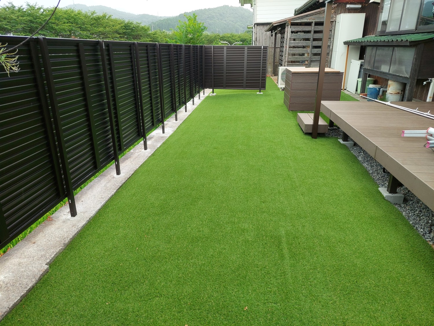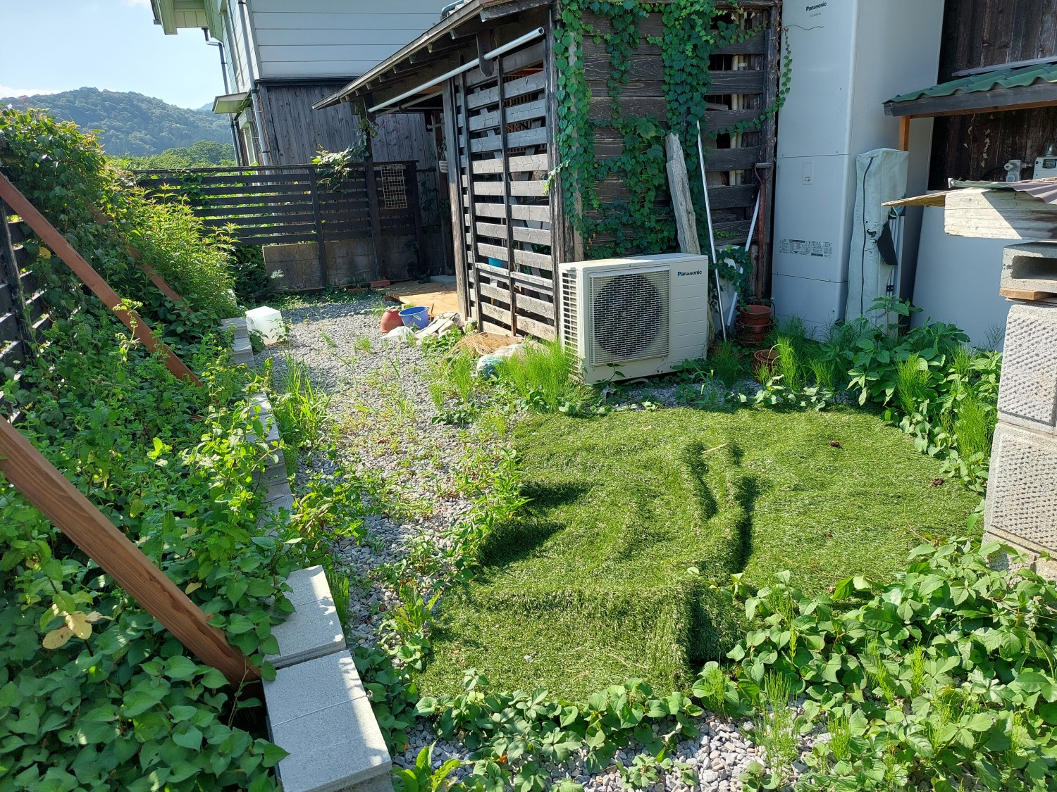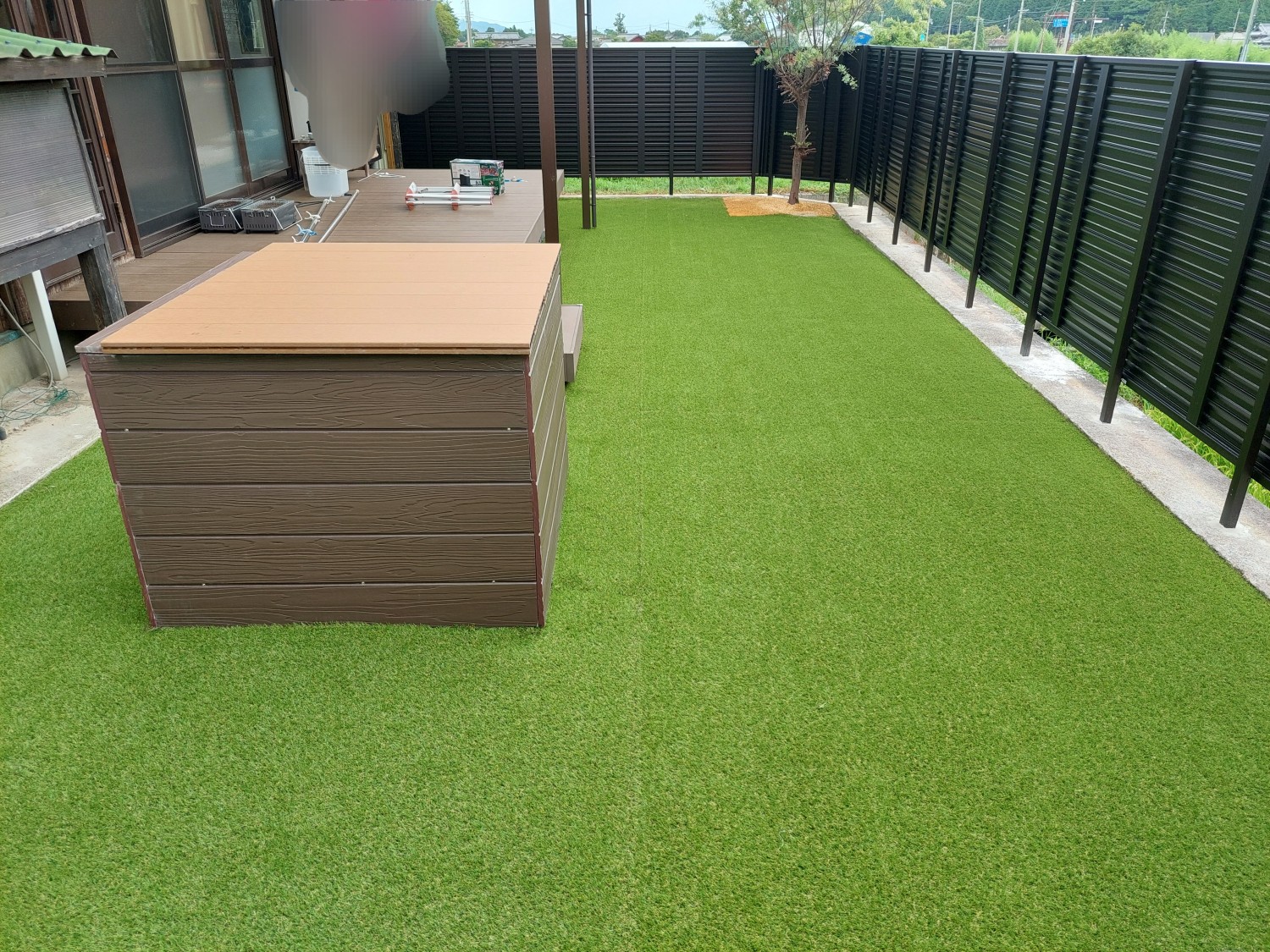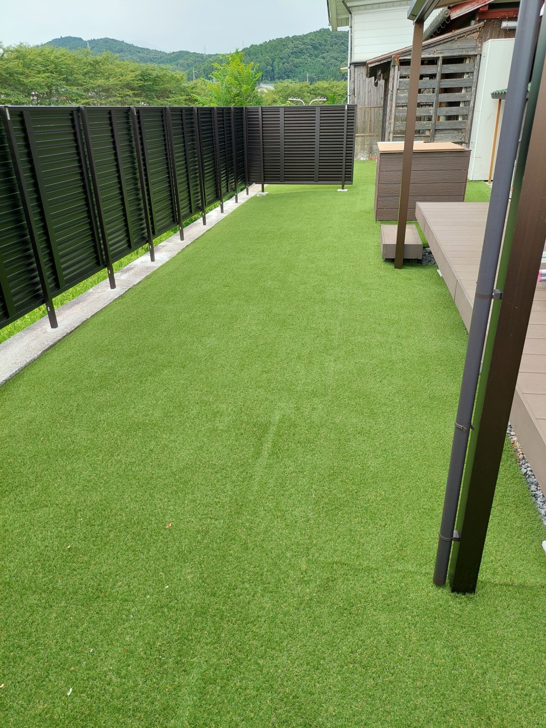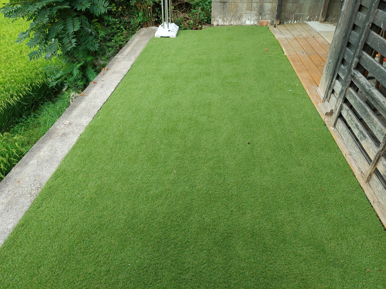 整地してから防草シートを敷き詰めて、人工芝を敷きました。