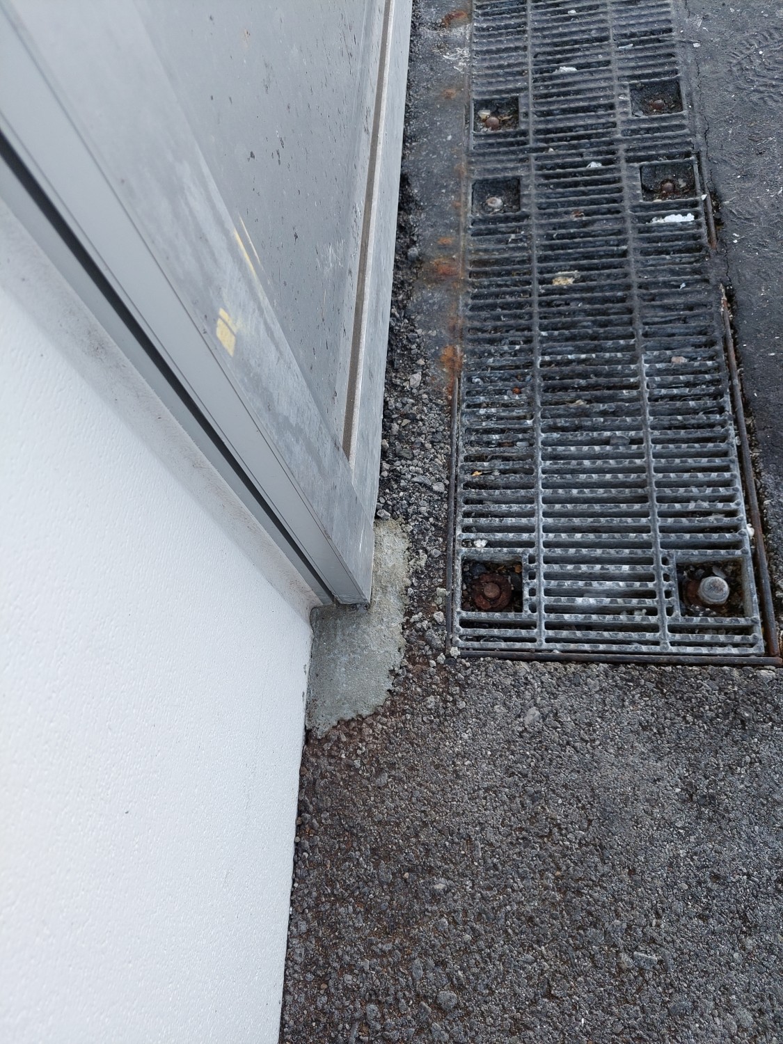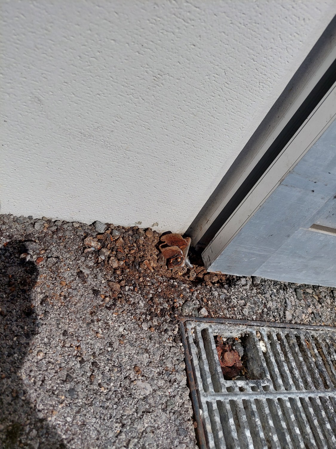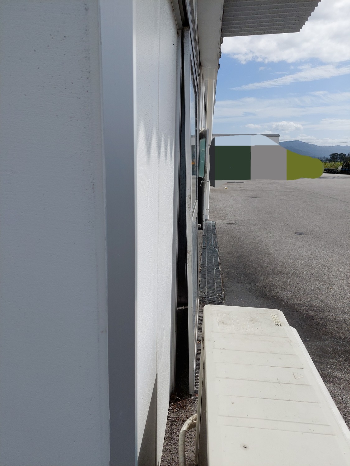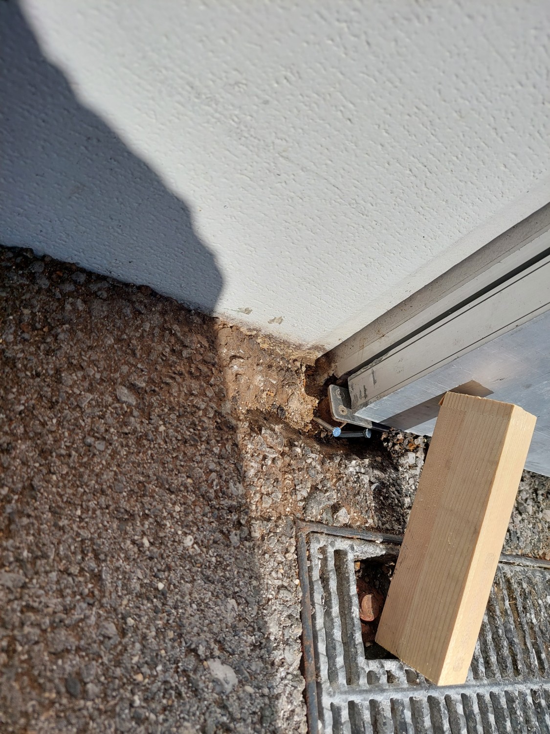 スライドドアの下部にあるレールに沿う突起状の金具が、負荷によりアスファルトがめくれ、外れたためにスライドドアが宙ぶらりの状態となっていました。