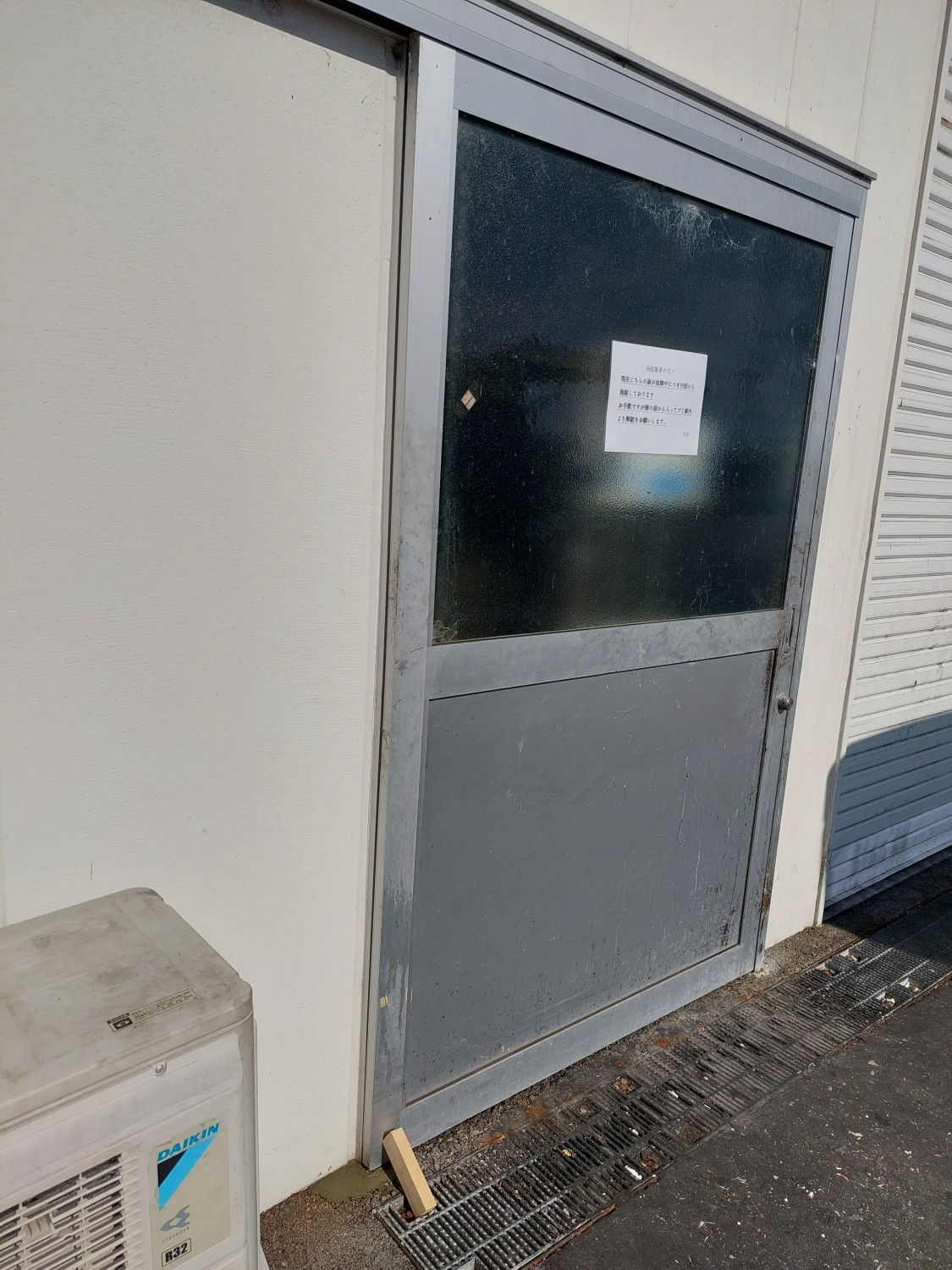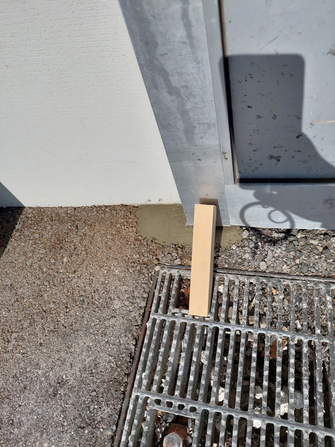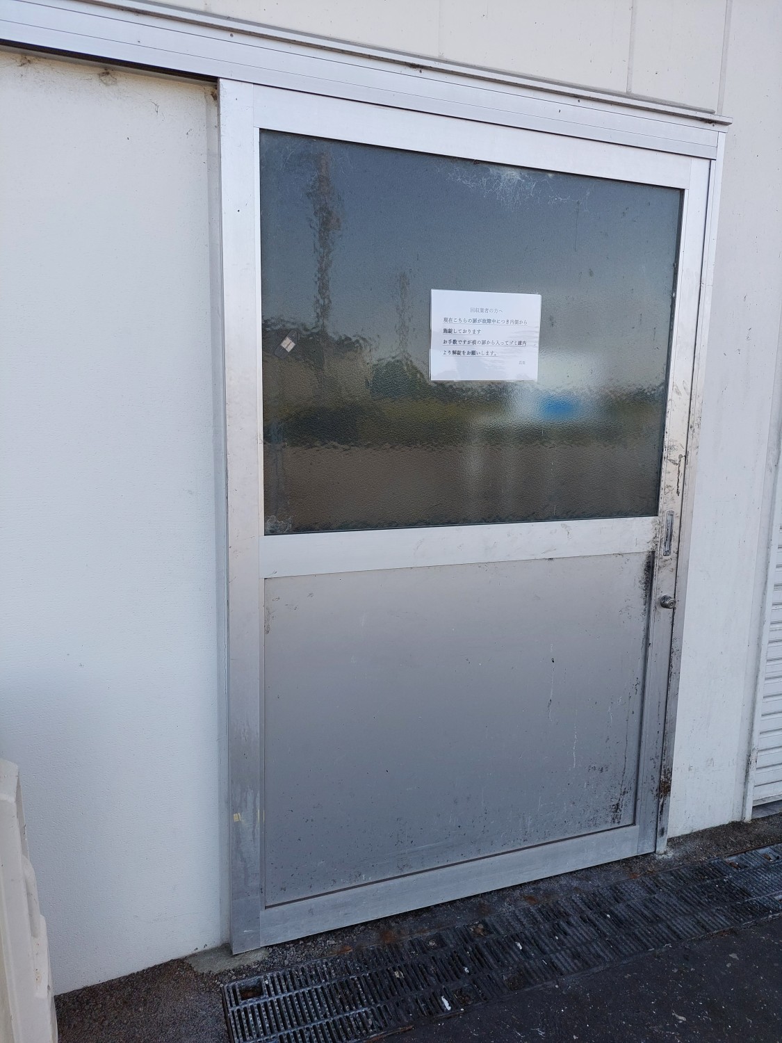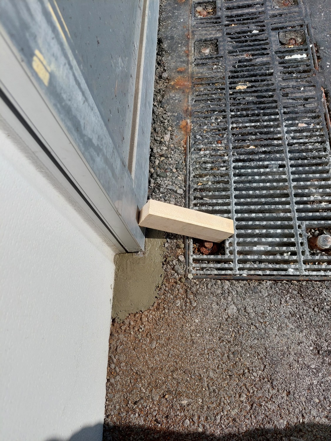スライドドアの下部にあるレールに沿う突起状の金具が、負荷によりアスファルトがめくれ、外れたためにスライドドアが宙ぶらりの状態となっていました。