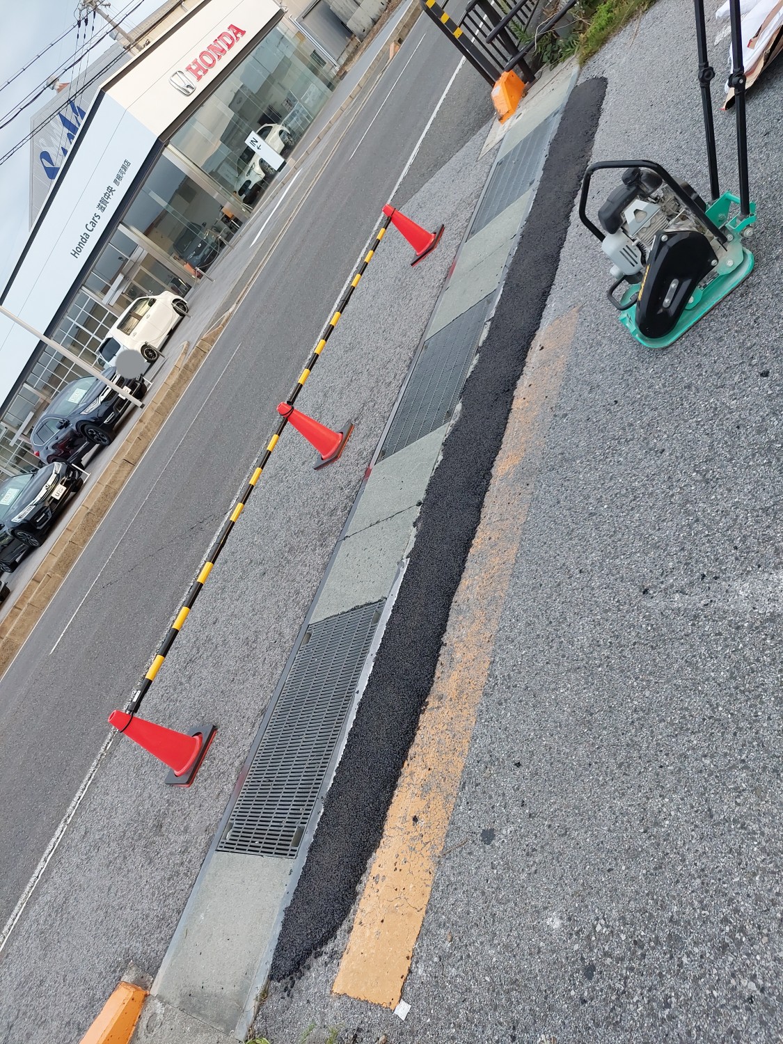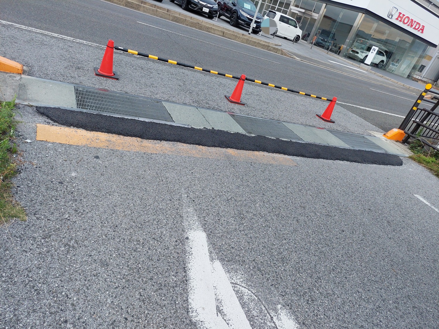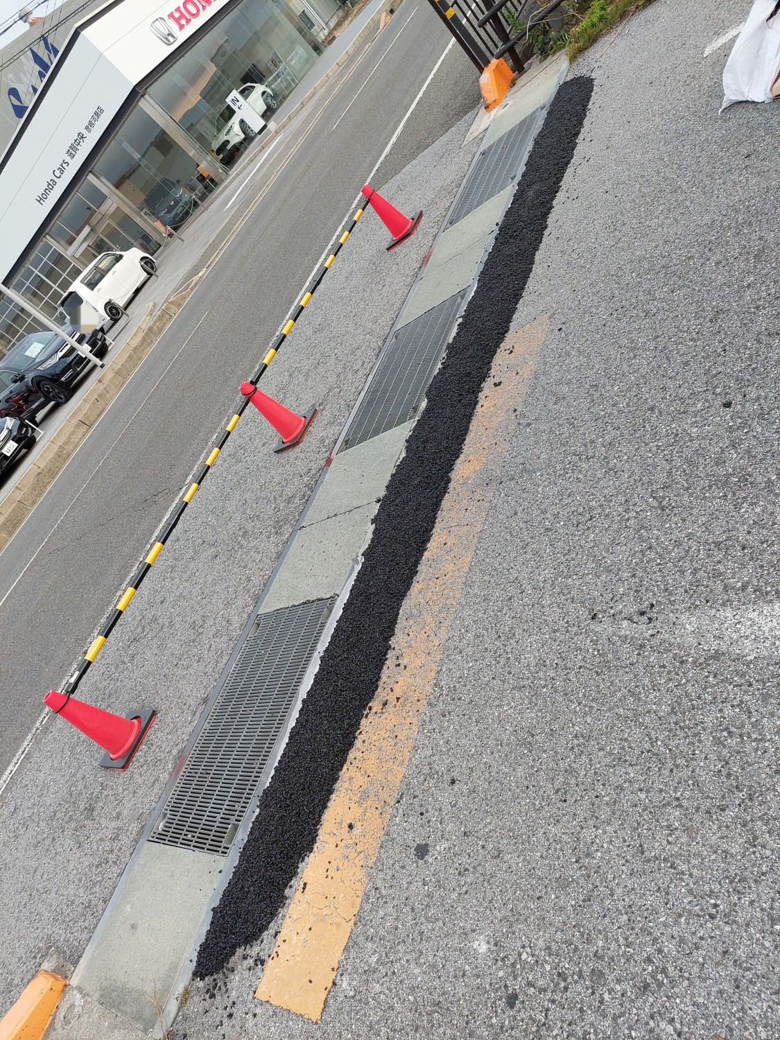 アスファルトが下がり、U字溝との境目に段差が生じていたので、アスファルトにてハンチを作り勾配をとって、段差の解消処置をおこないました。