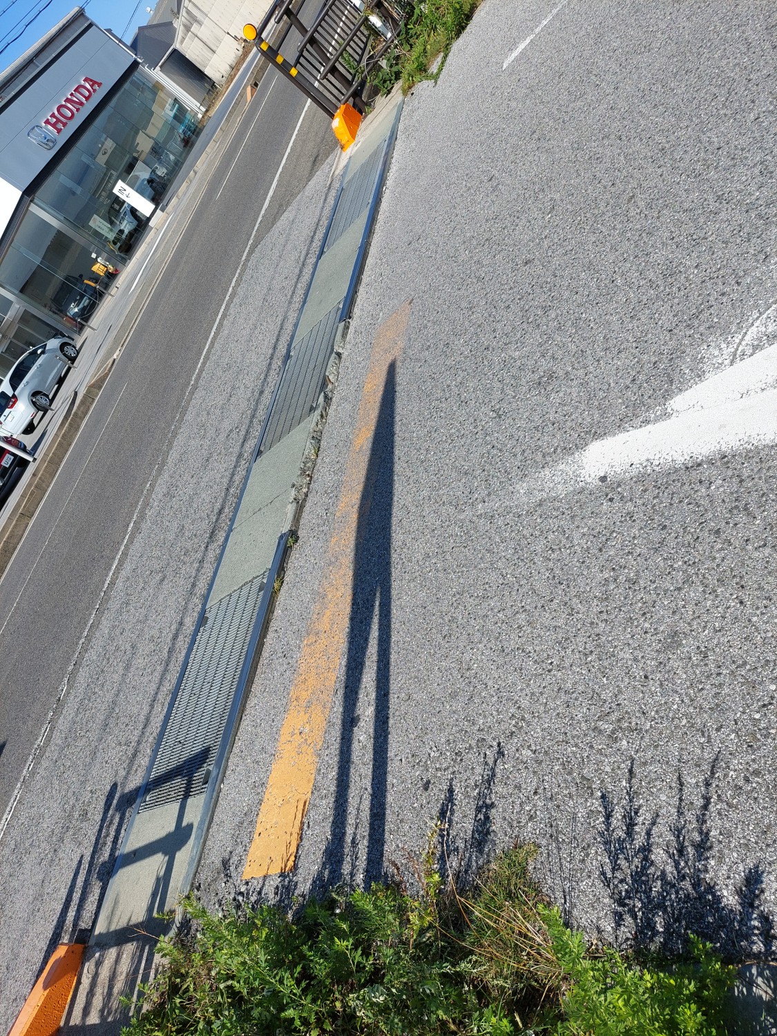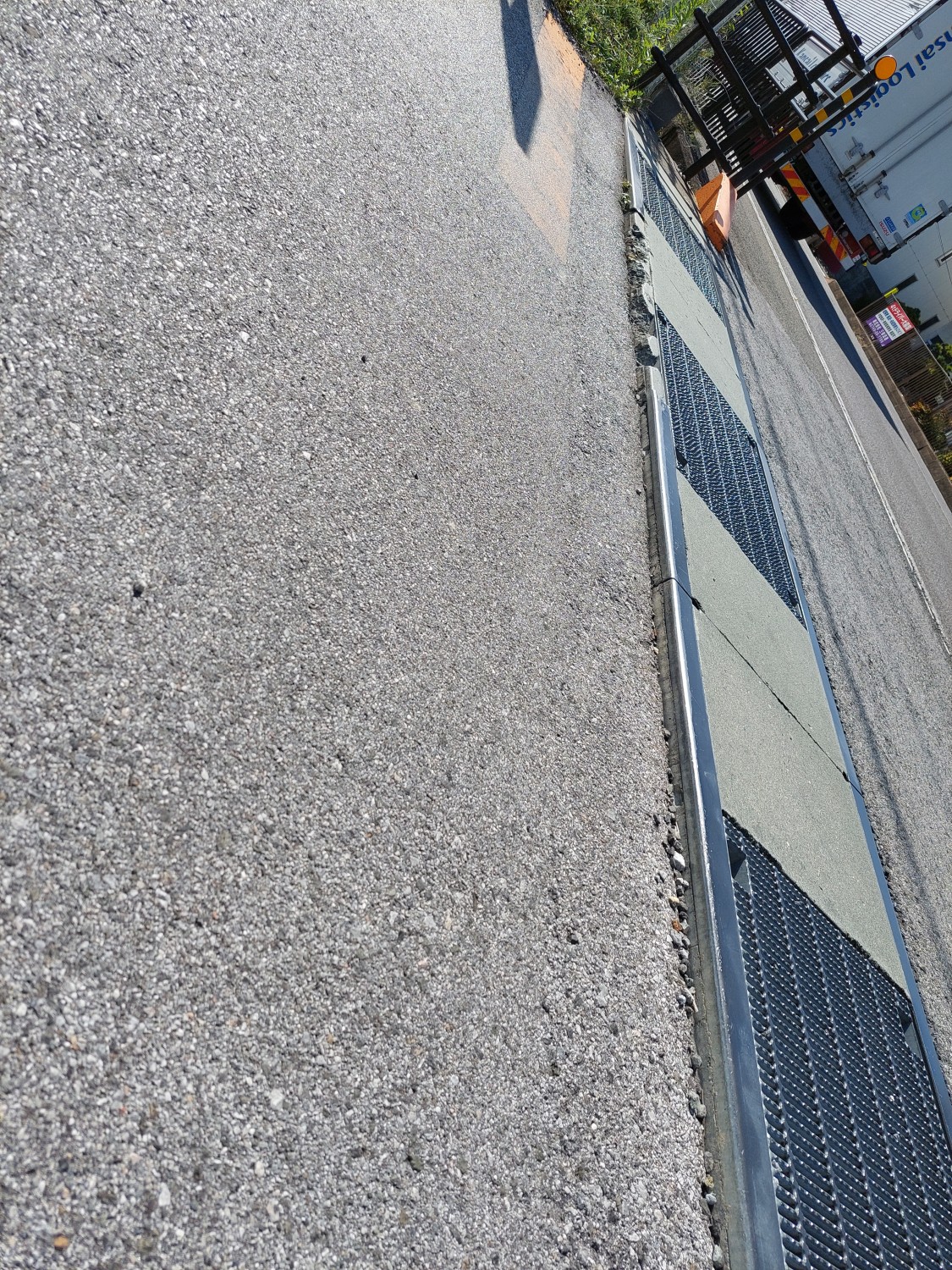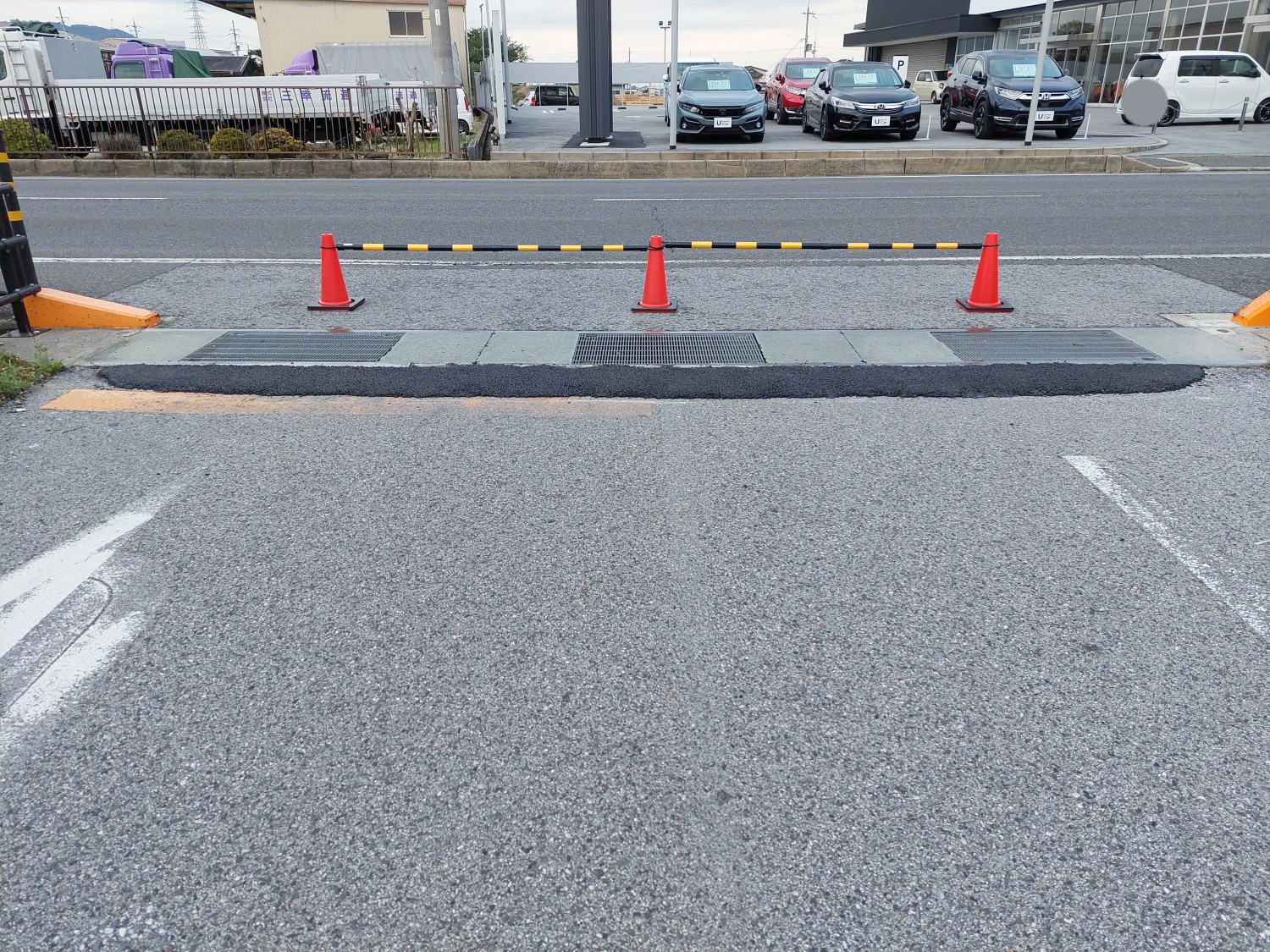 アスファルトが下がり、U字溝との境目に段差が生じていたので、アスファルトにてハンチを作り勾配をとって、段差の解消処置をおこないました。