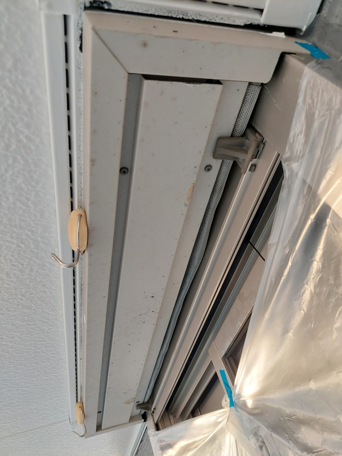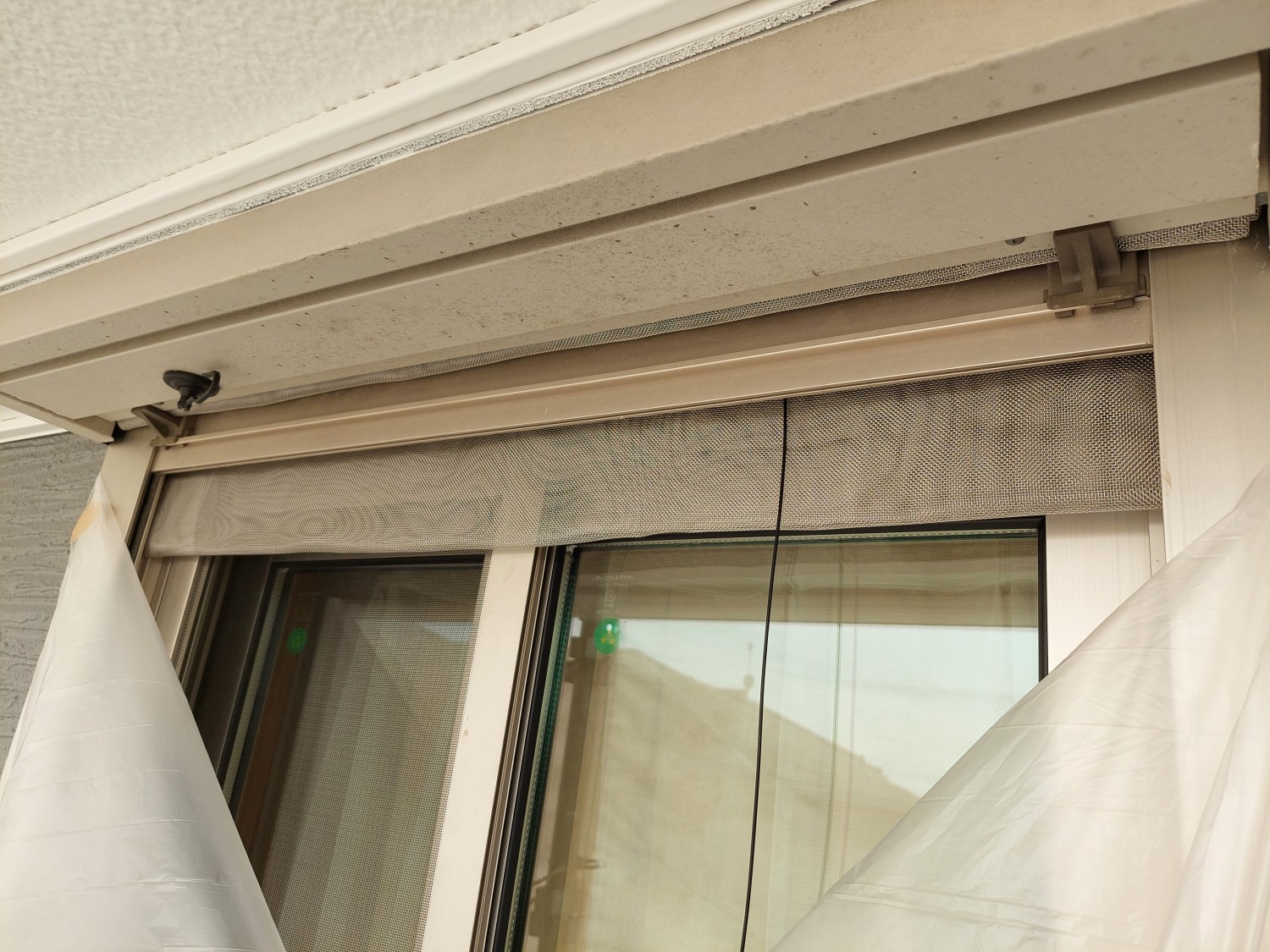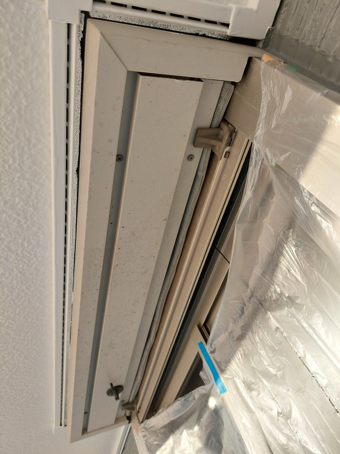 2階の窓2ヶ所のシャッターBOXの中に、コウモリが出入りするとのことでしたので、入らないようにと食いちぎらないように、金網のメッシュにてシャッター部の前と後ろの両方の隙間を、中で広がるように詰めて埋めました。