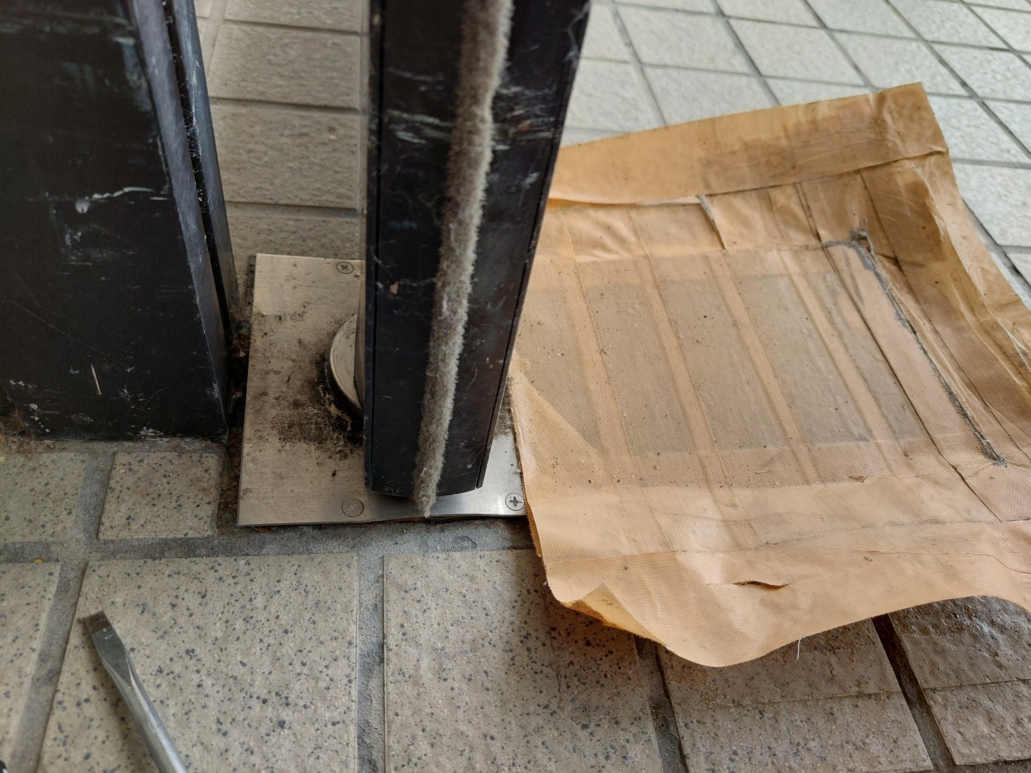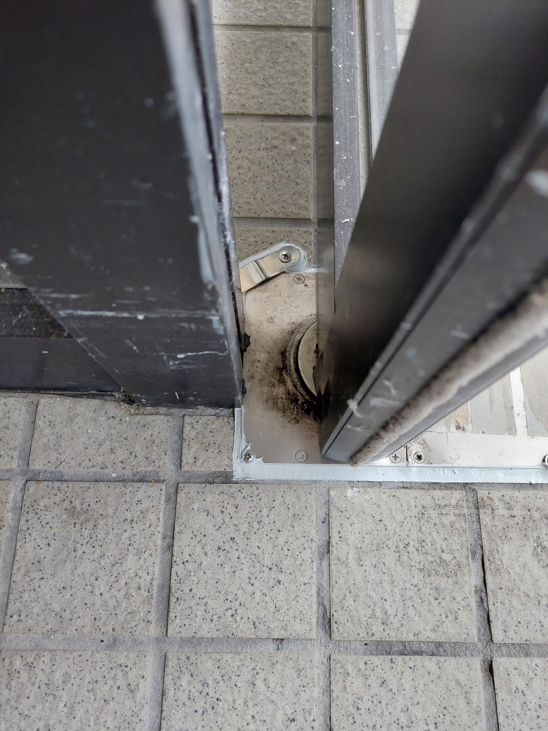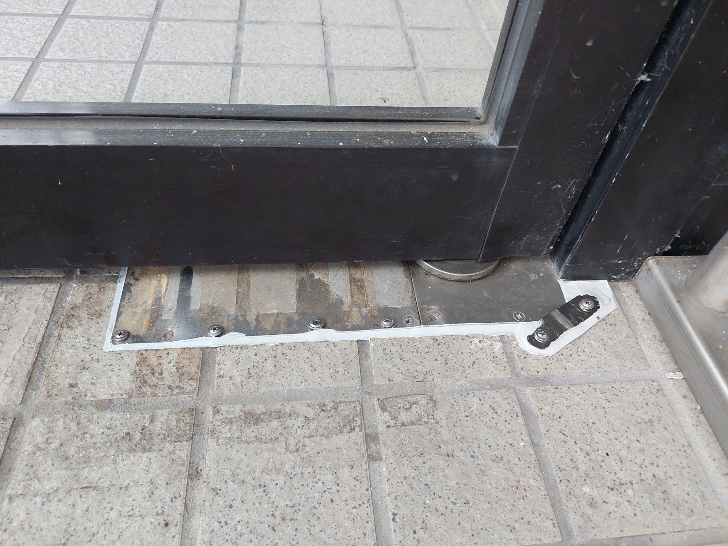 ドア下のヒンジ蓋が反りあがっていましたので、コンクリートに下穴を開けてビスにて固定しました。
