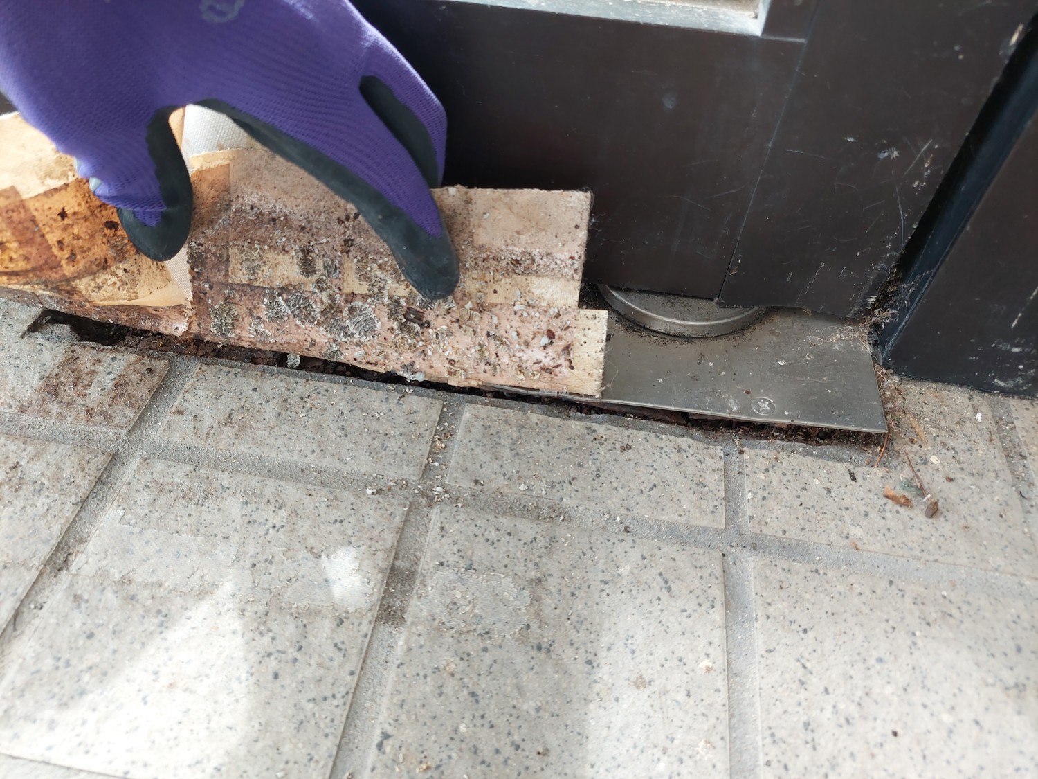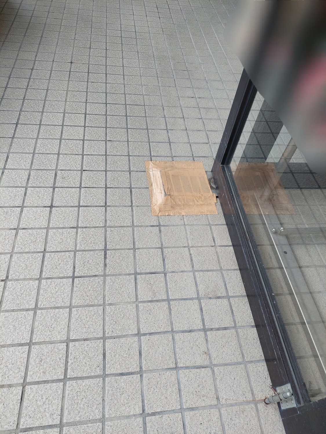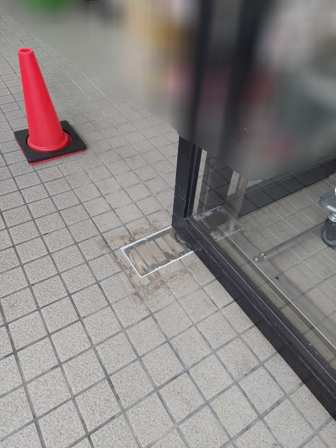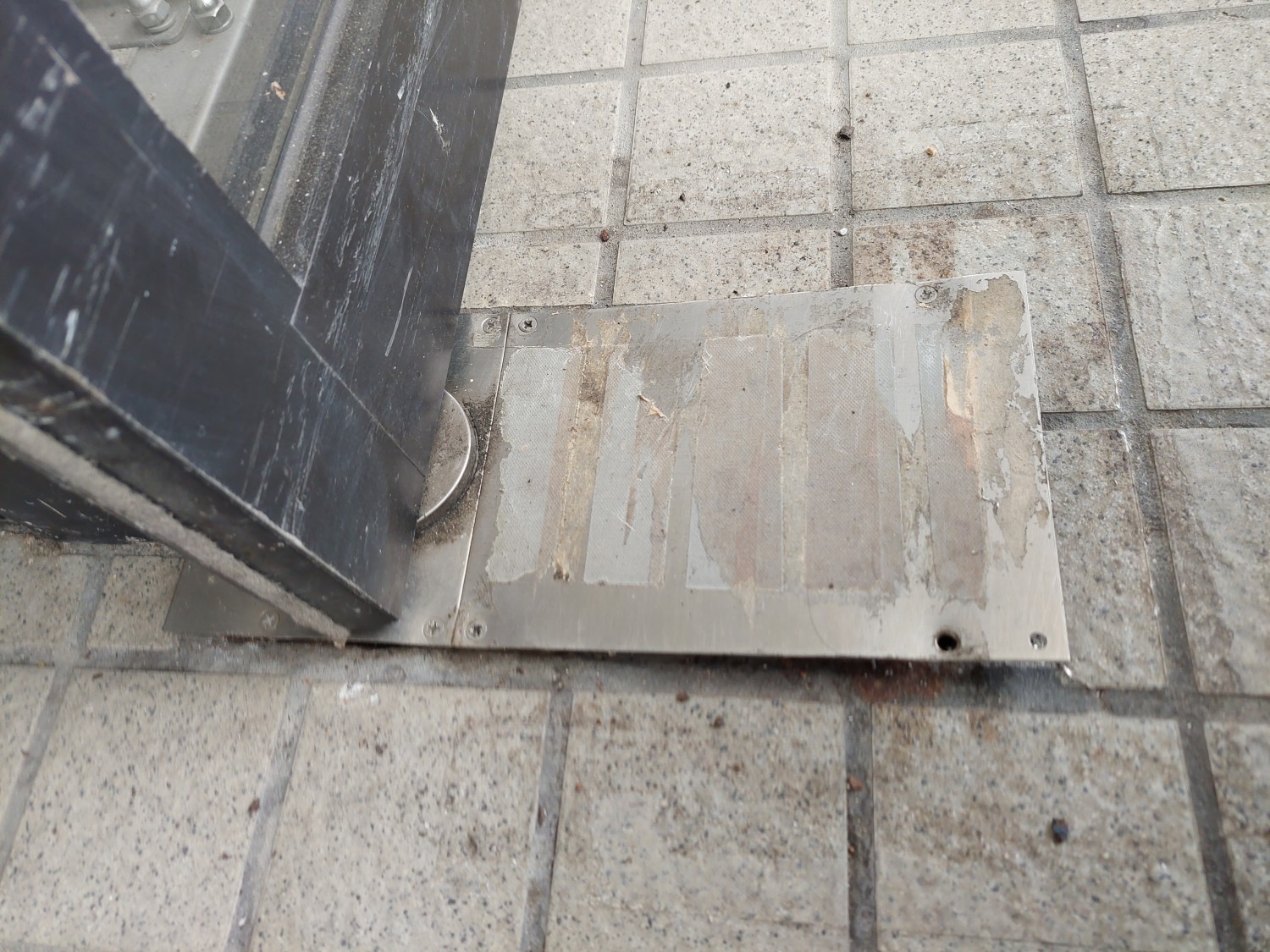 ドア下のヒンジ蓋が反りあがっていましたので、コンクリートに下穴を開けてビスにて固定しました。