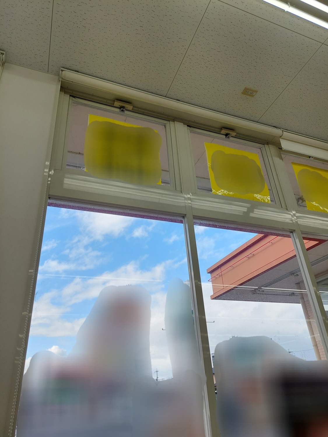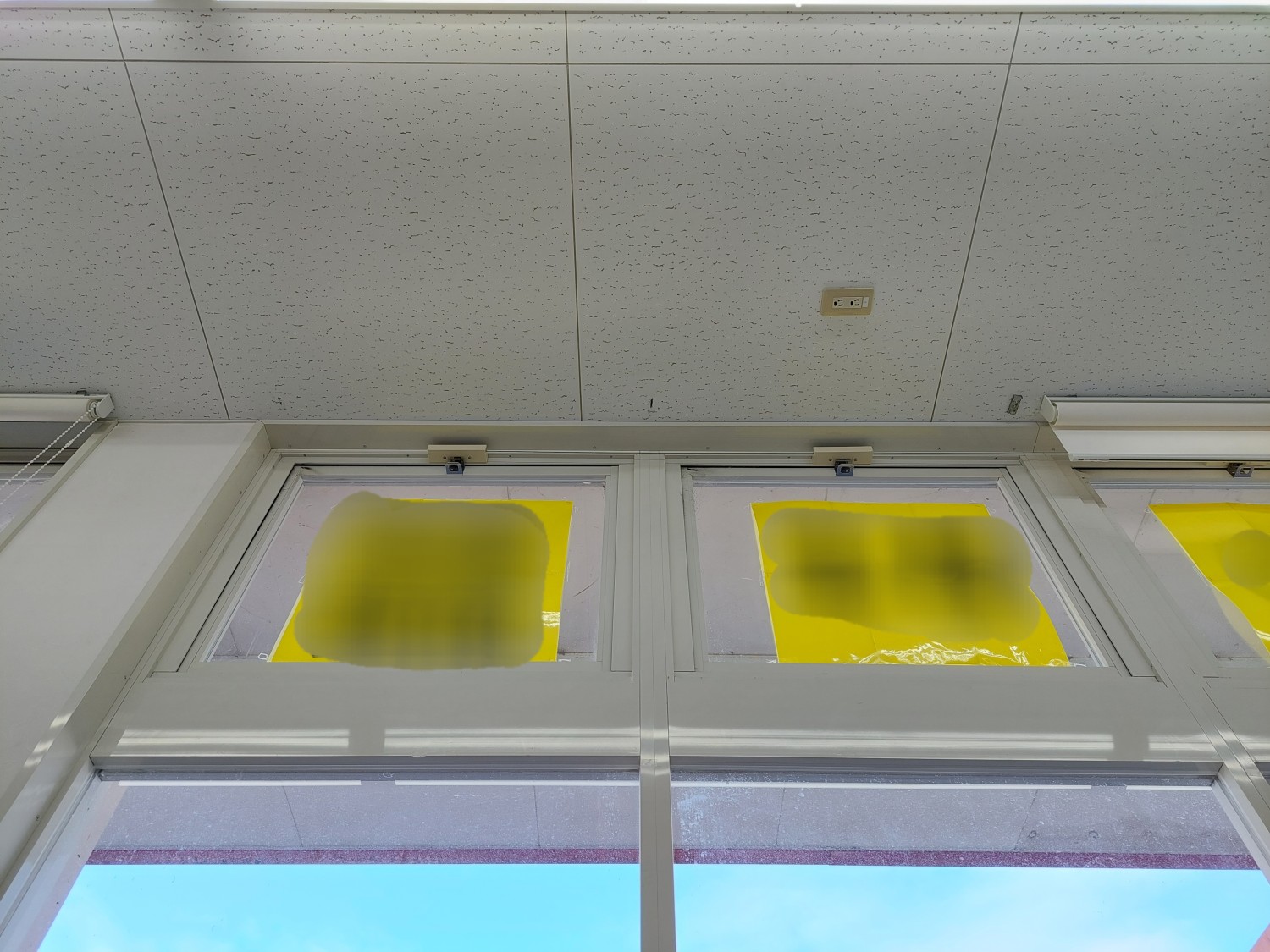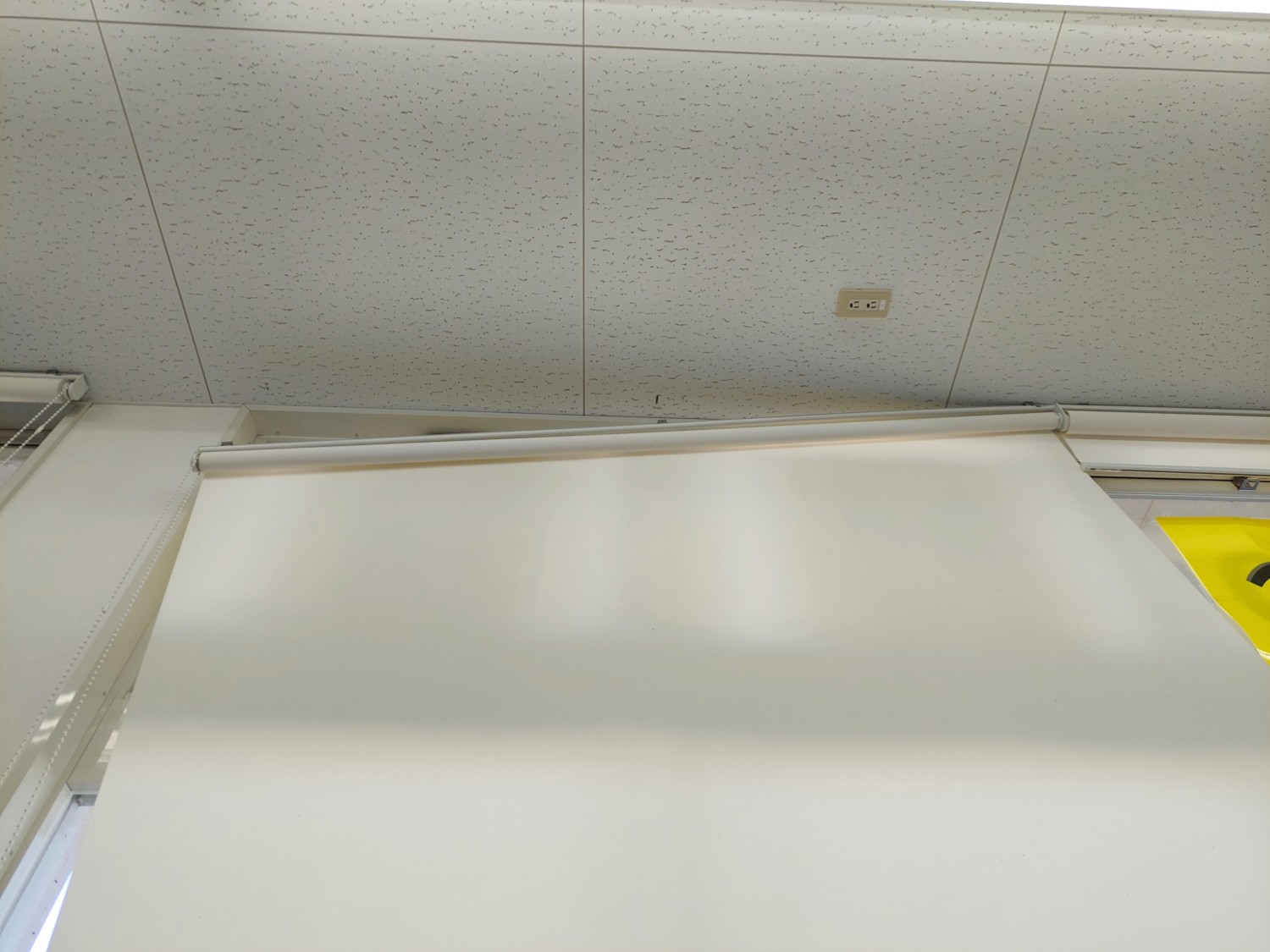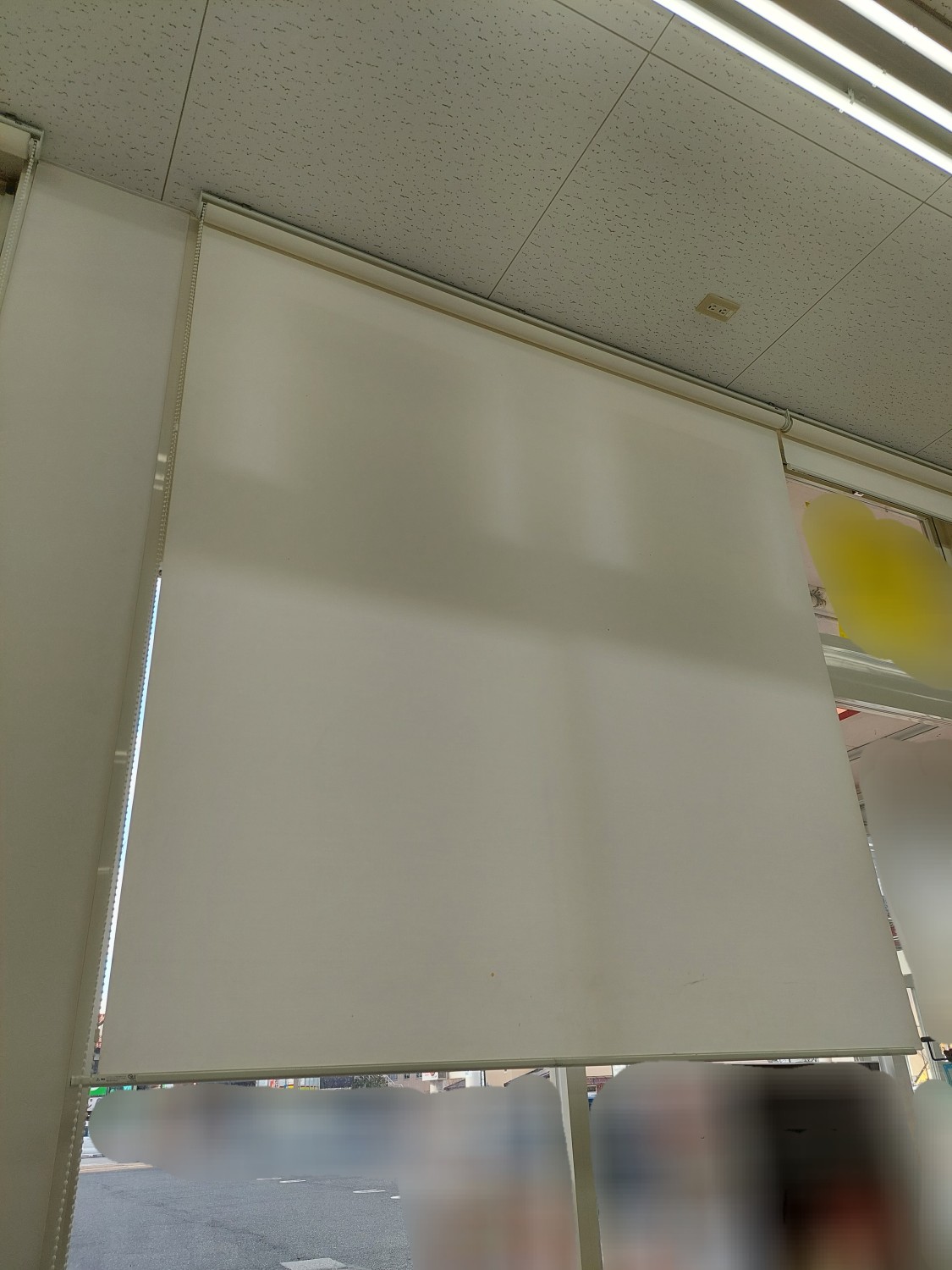 ロールスクリーンの取り付け金具が外れて落下寸前で止まっていたので、一度外してから取り付け金具を天井へ付け直し、ロールスクリーン本体を取り付けて復旧しました。