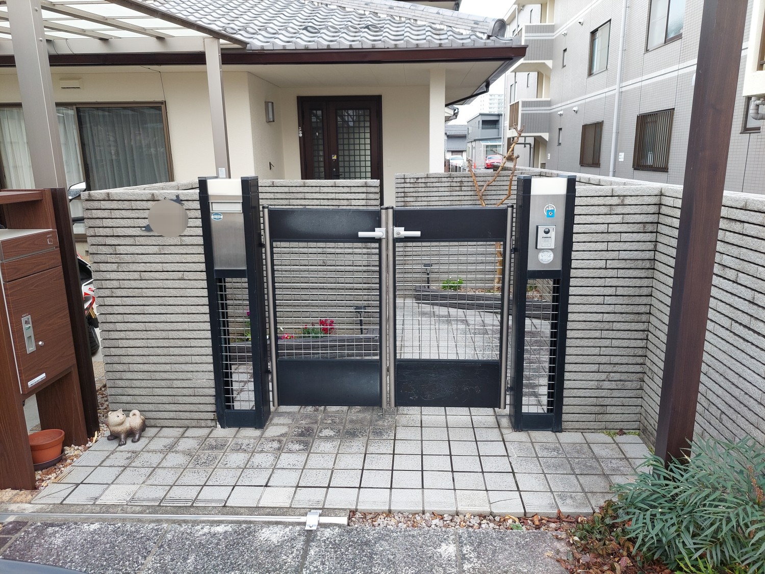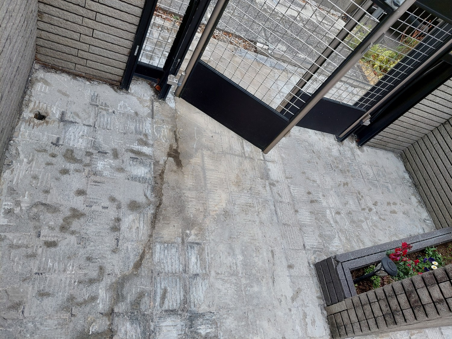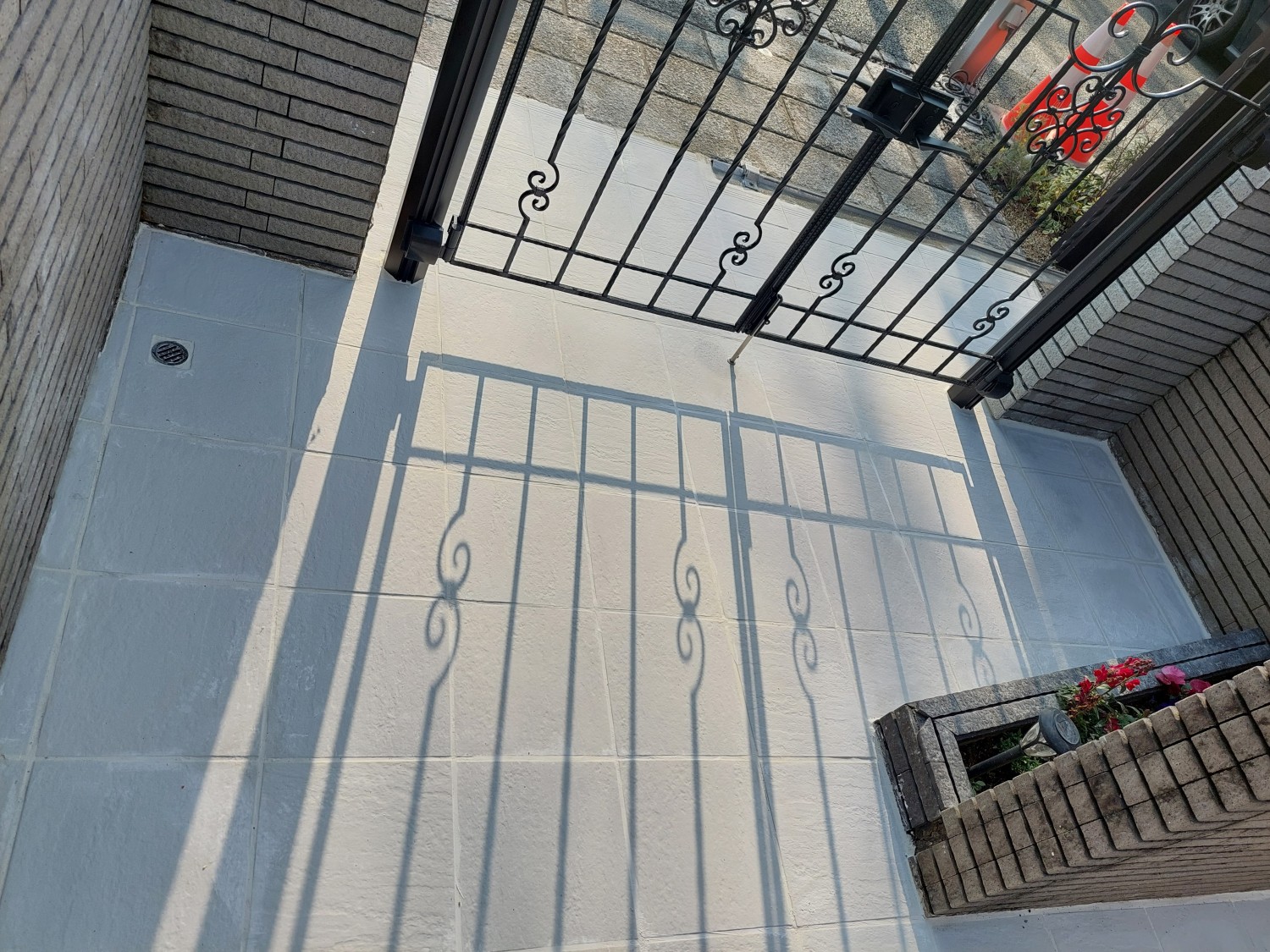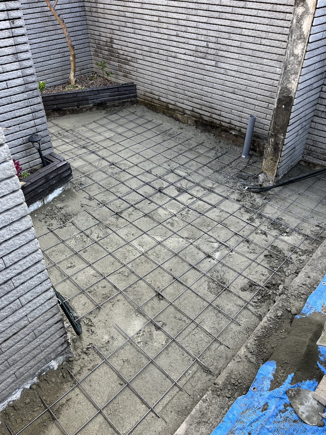 下地のコンクリートをハツリ、メッシュ筋を入れて下地をやり替えて、玄関ポーチと同じタイルを張りました。(表側)