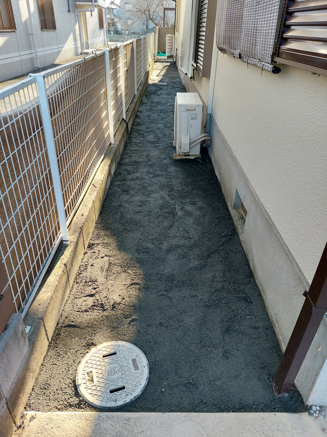 ドッグラン用のため、防草シートと人工芝の間に砂敷きをおこなっております。