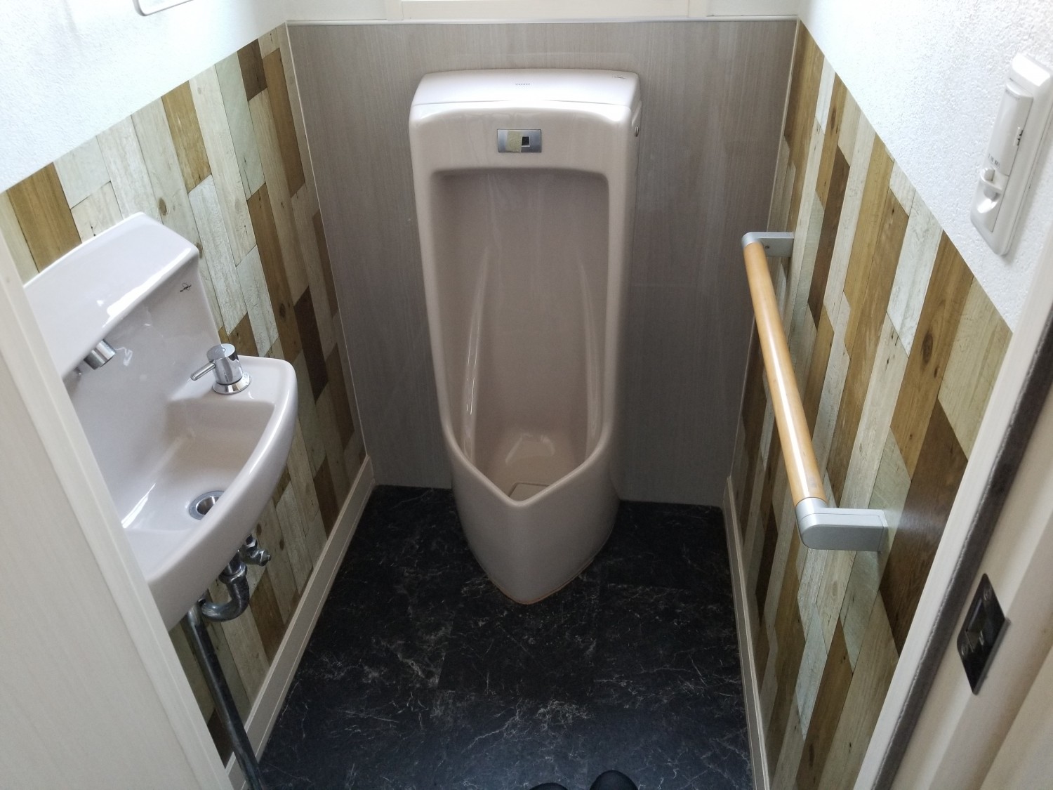 小便器横の飛び跳ねがクロスに染み付かないように、防水効果のあるクロスを貼りました。