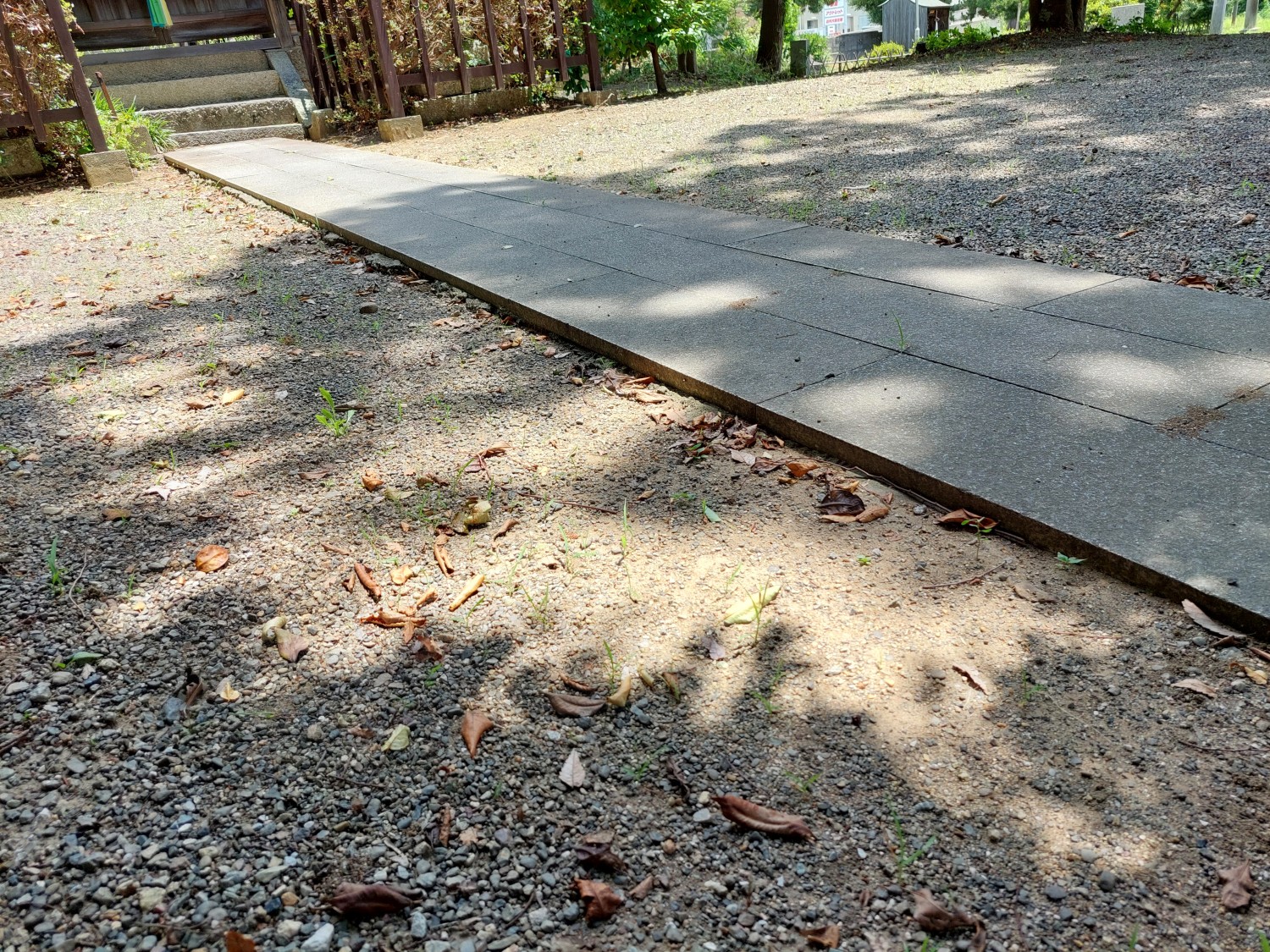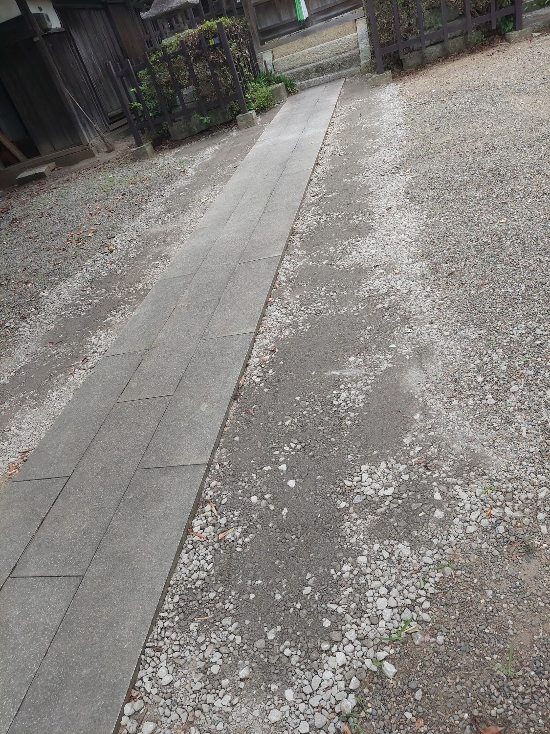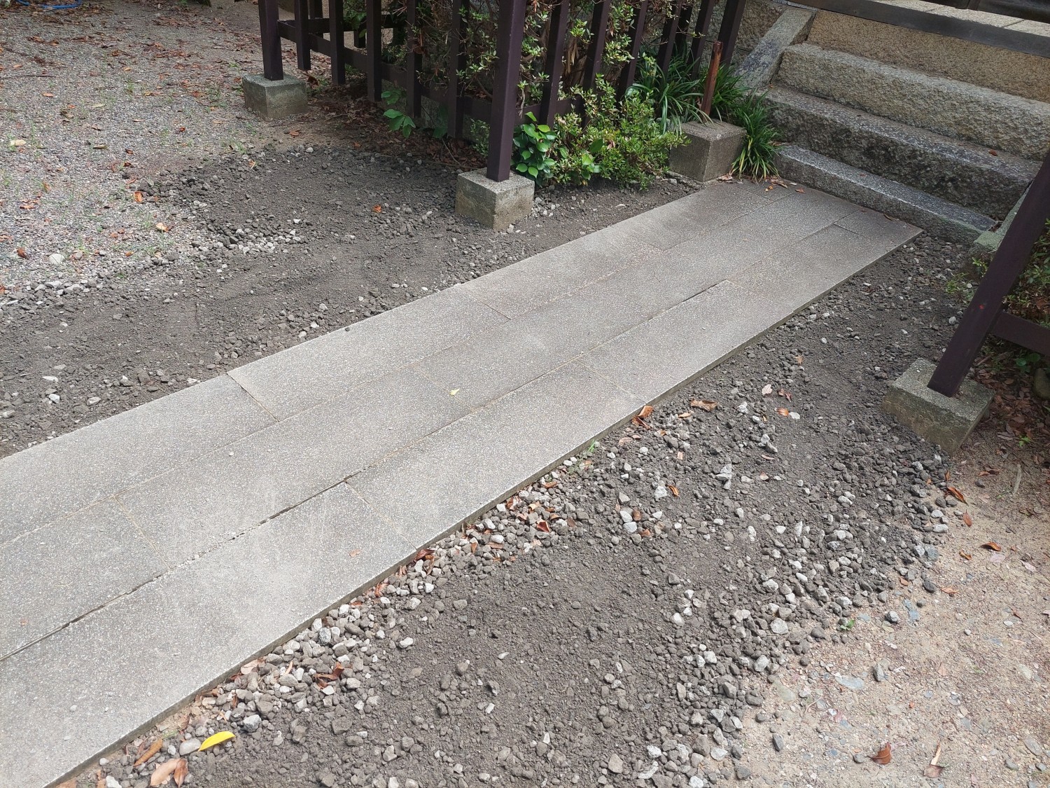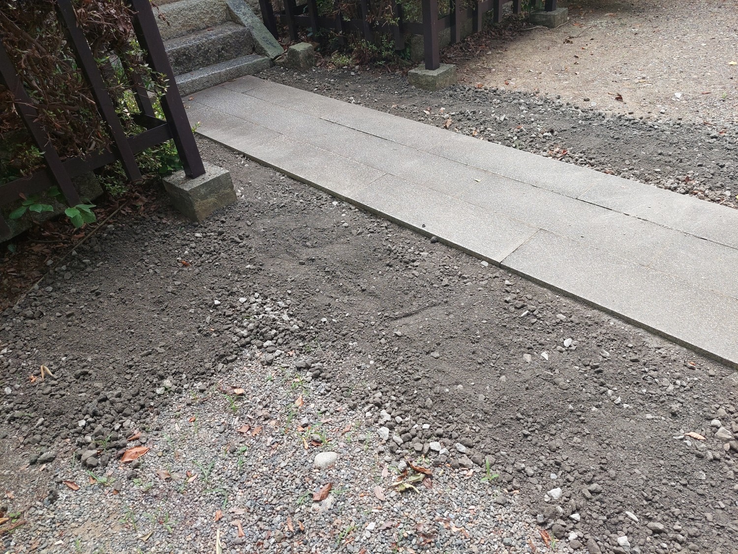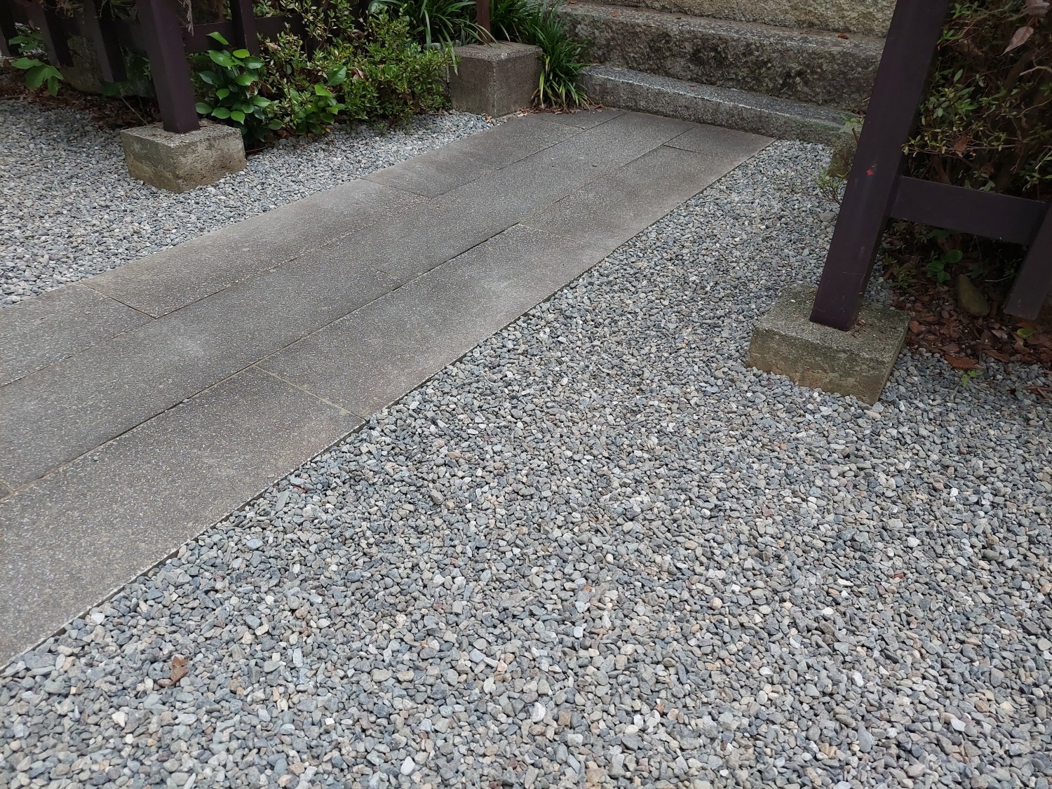 参道廻りが沈んで地が下がっていましたので、砕石敷きをおこない転圧処置を施して、その上にビリ砂利を敷きました。