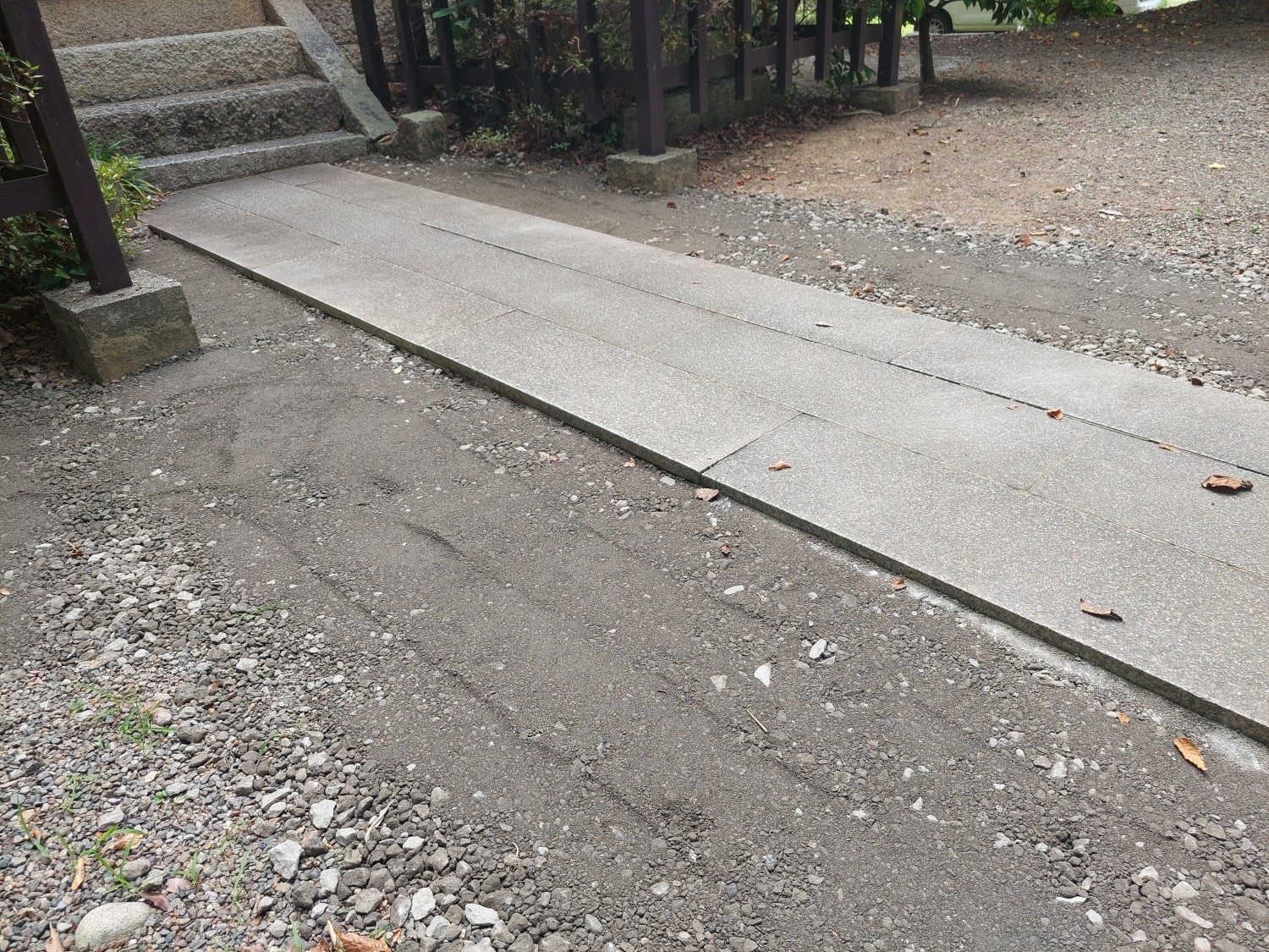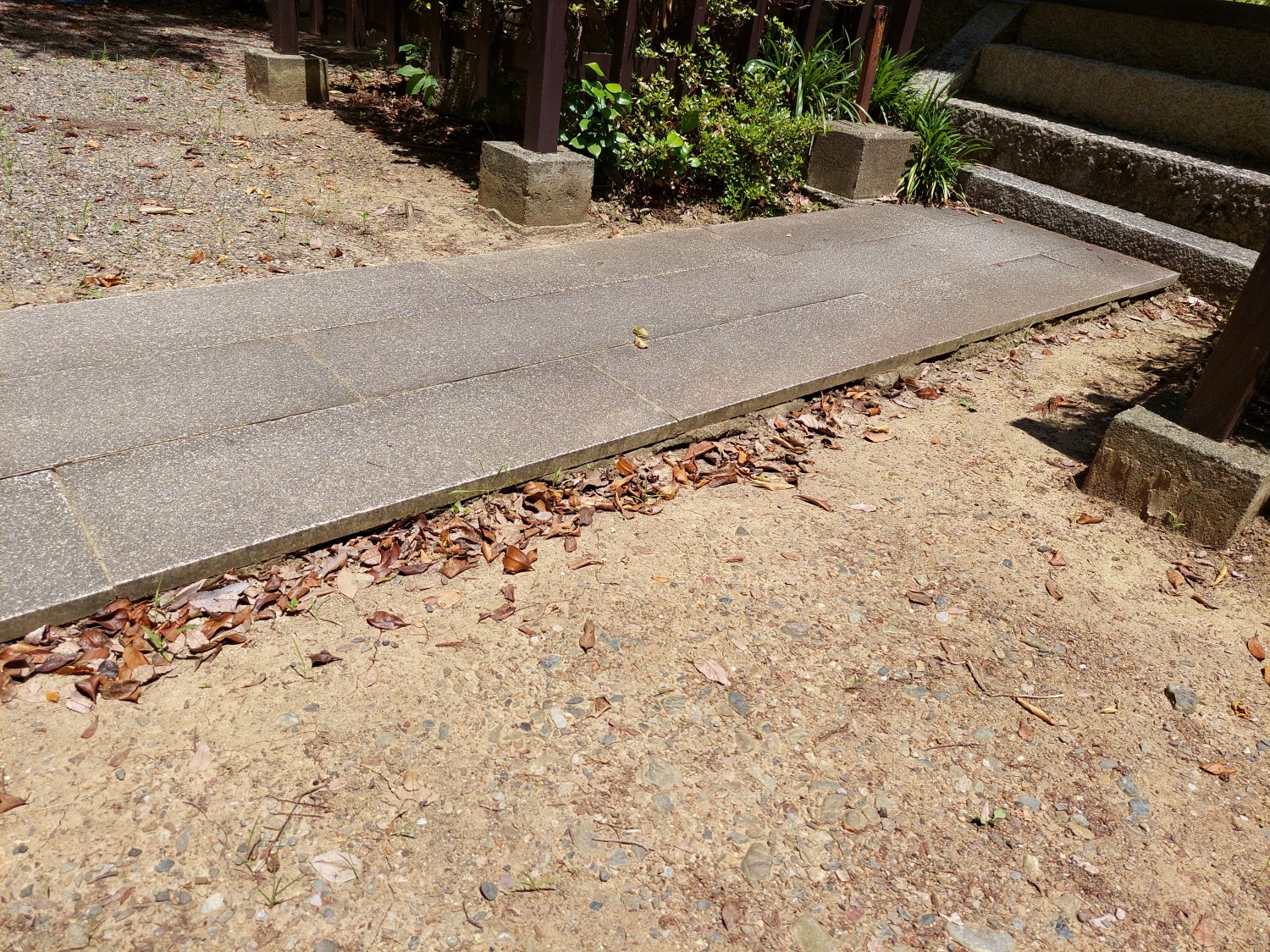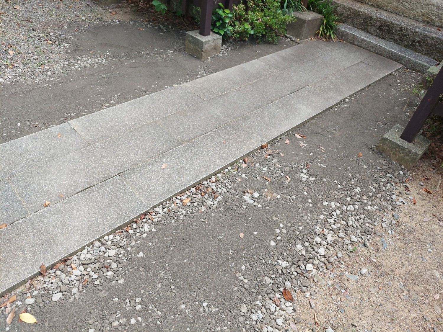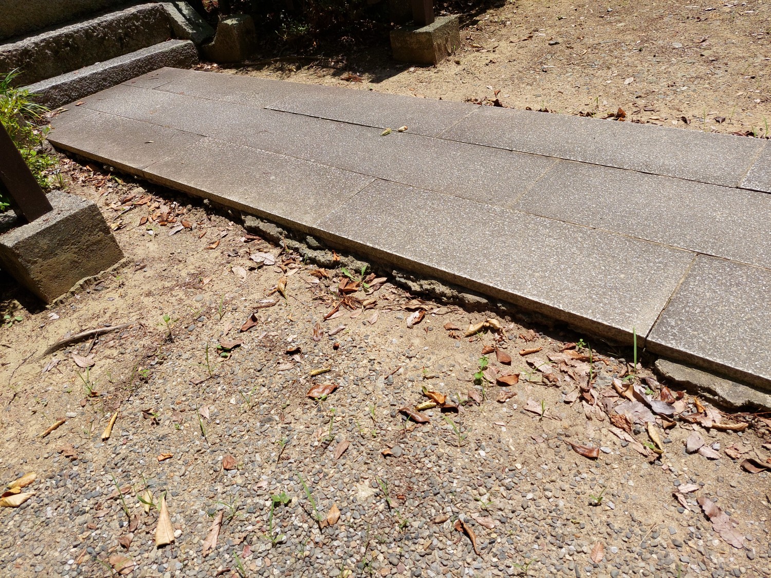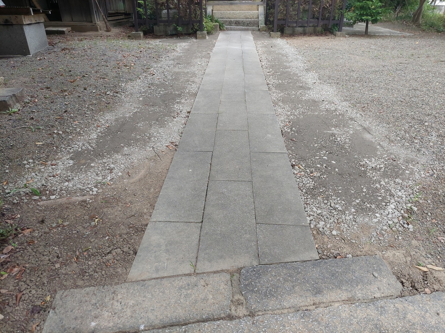 参道廻りが沈んで地が下がっていましたので、砕石敷きをおこない転圧処置を施して、その上にビリ砂利を敷きました。