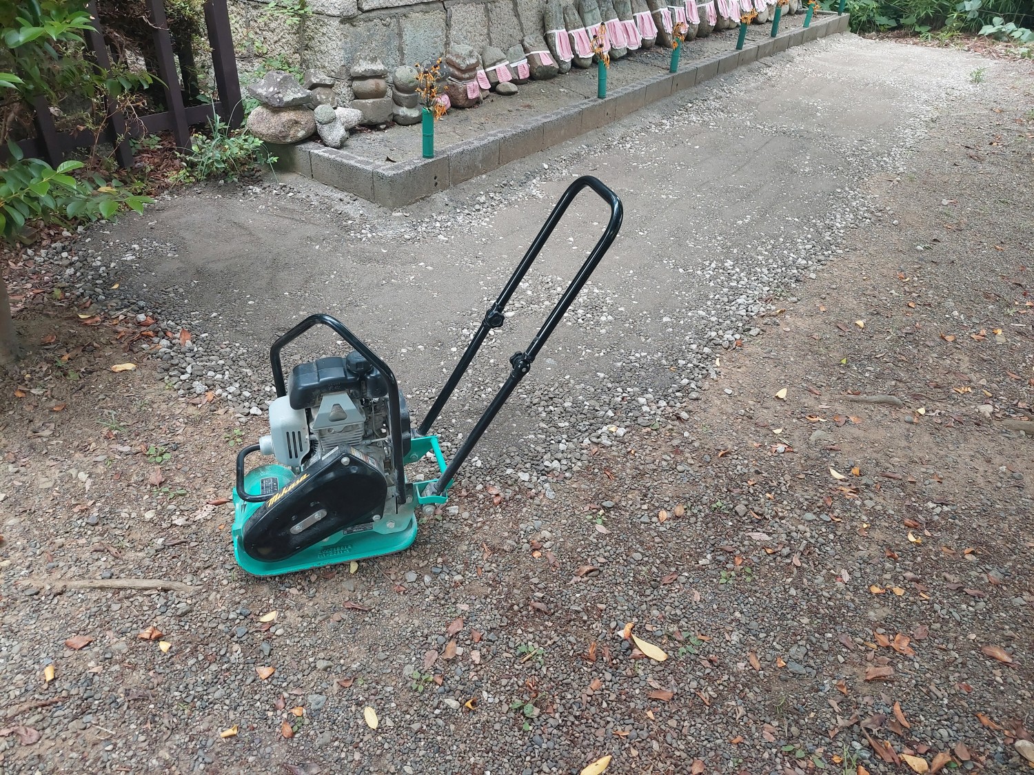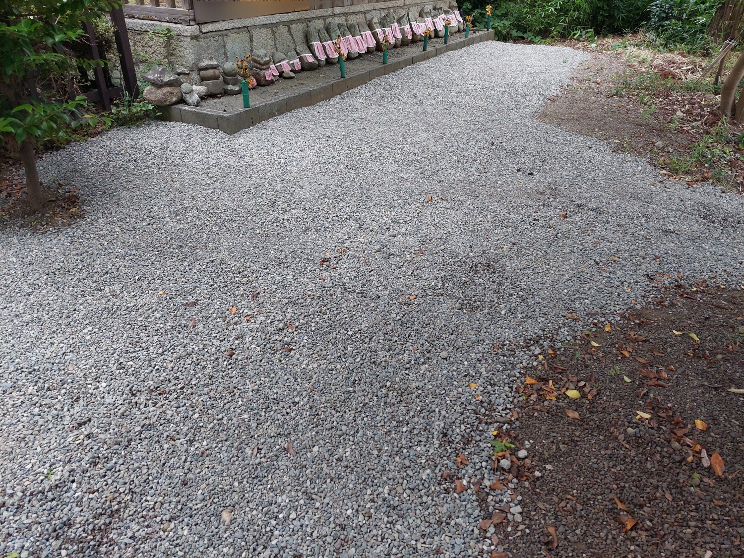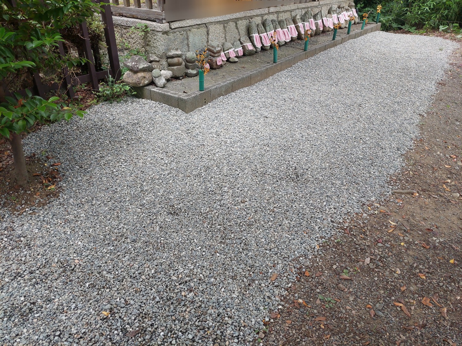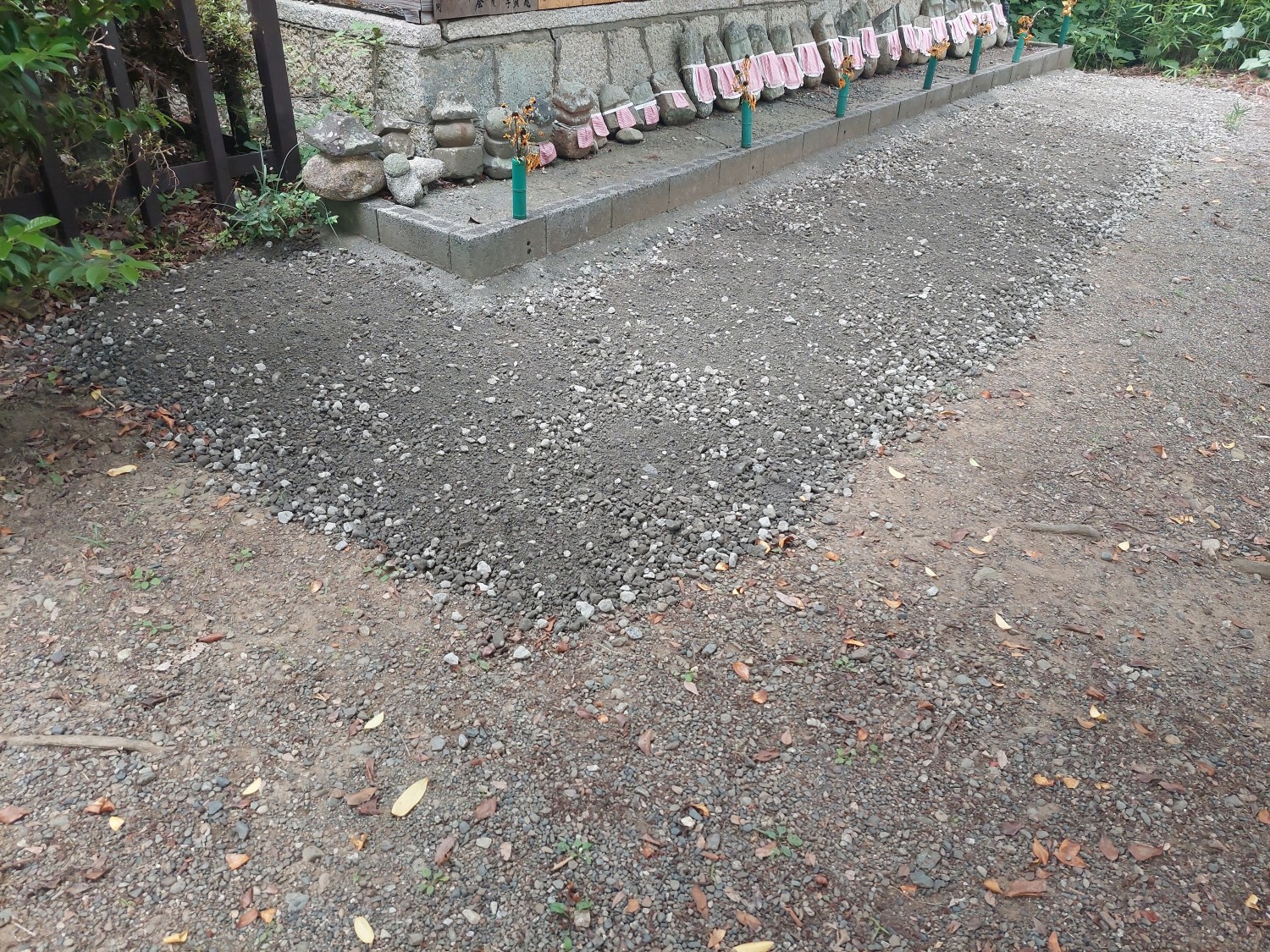 参道廻りに続き、お地蔵さんの廻りも地が下がっていましたので、砕石を敷いて転圧をおこない下地を整えてから、砂利敷きをおこないました。