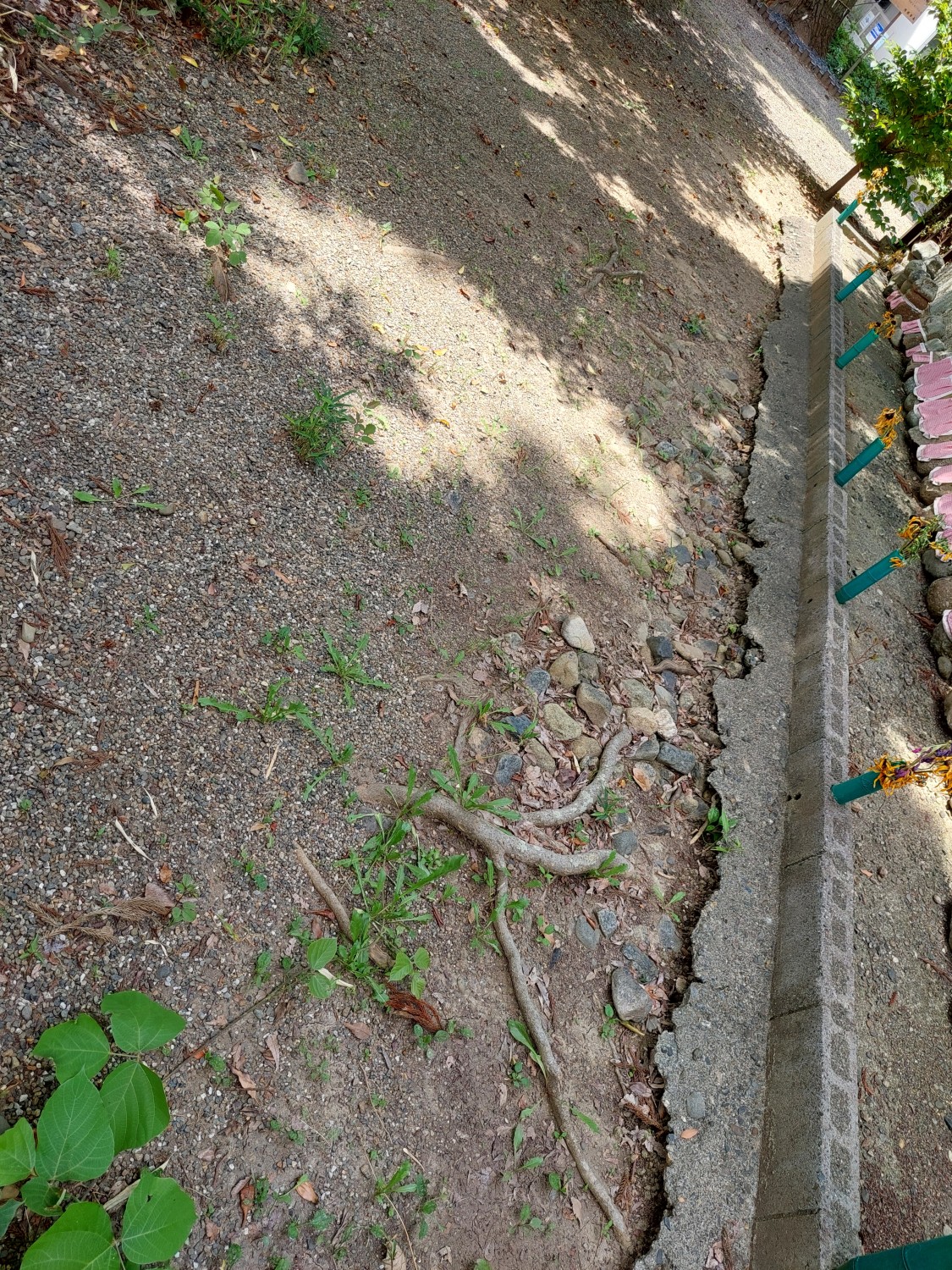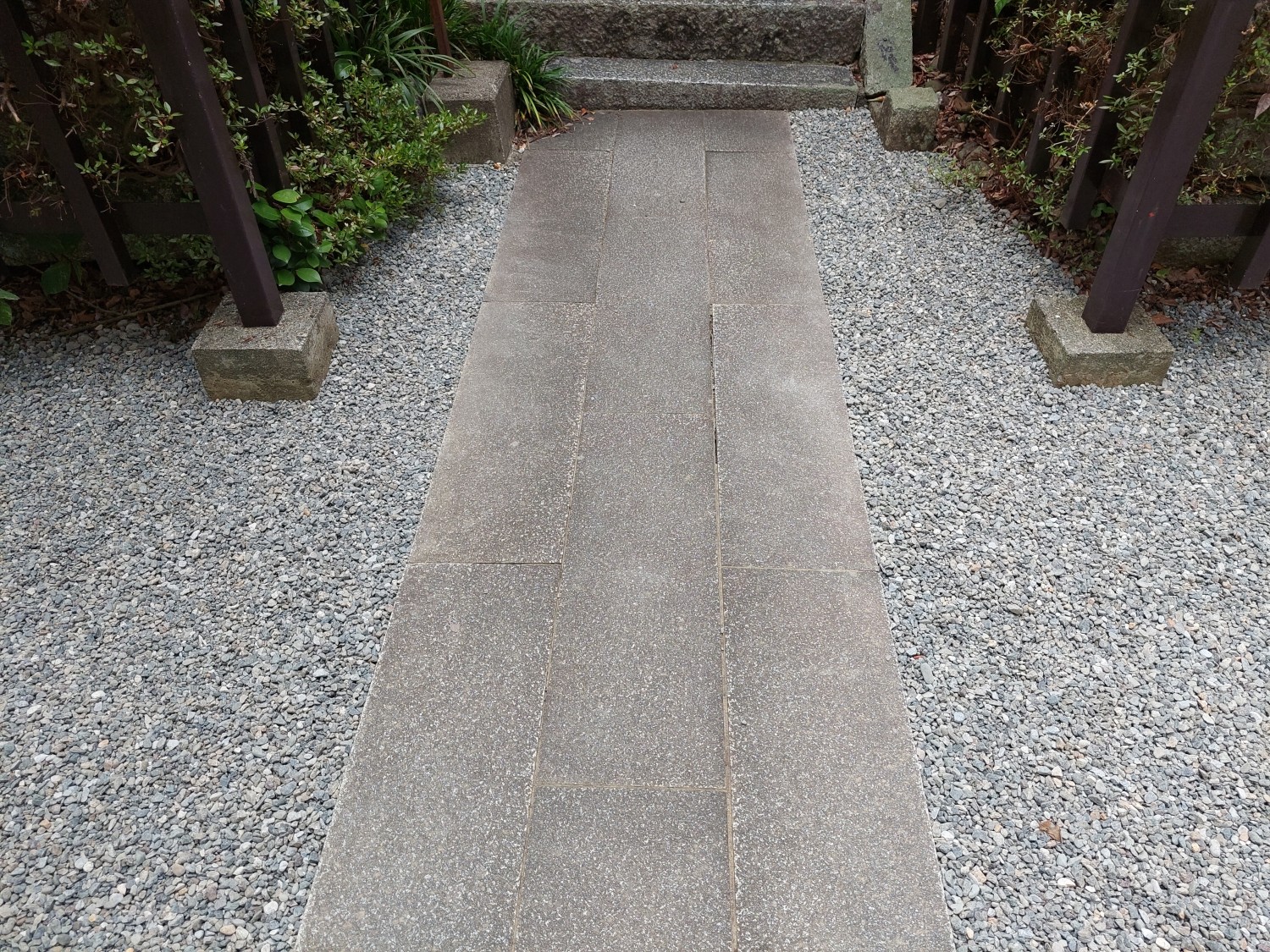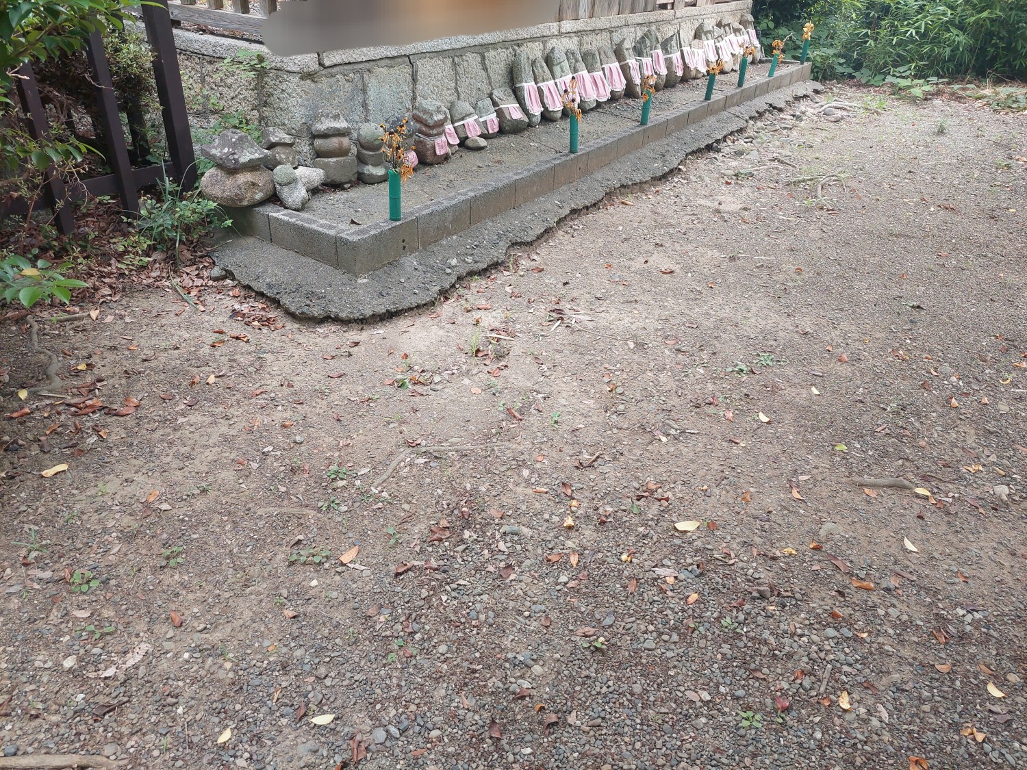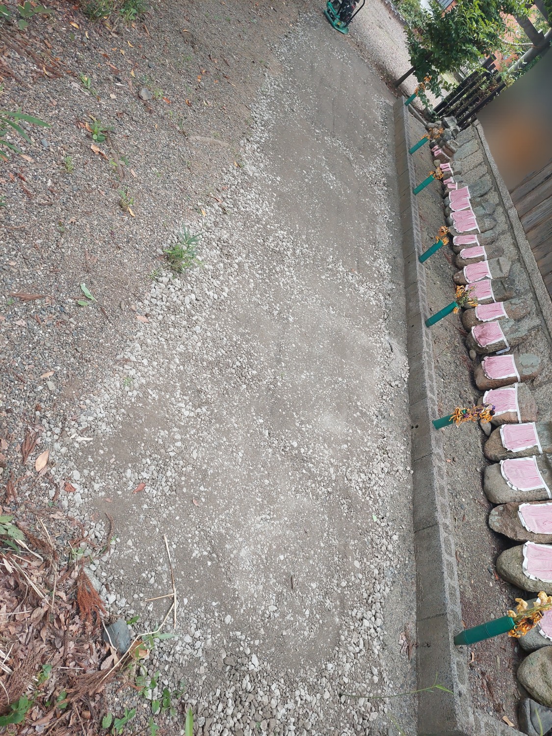 参道廻りに続き、お地蔵さんの廻りも地が下がっていましたので、砕石を敷いて転圧をおこない下地を整えてから、砂利敷きをおこないました。
