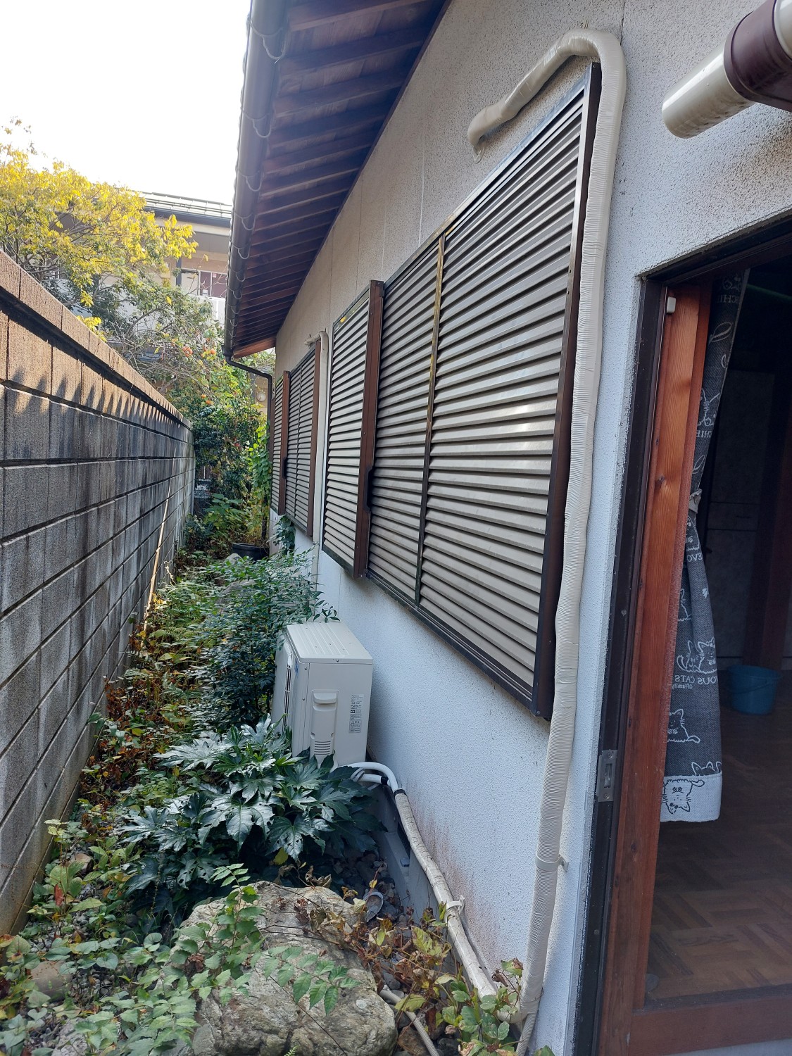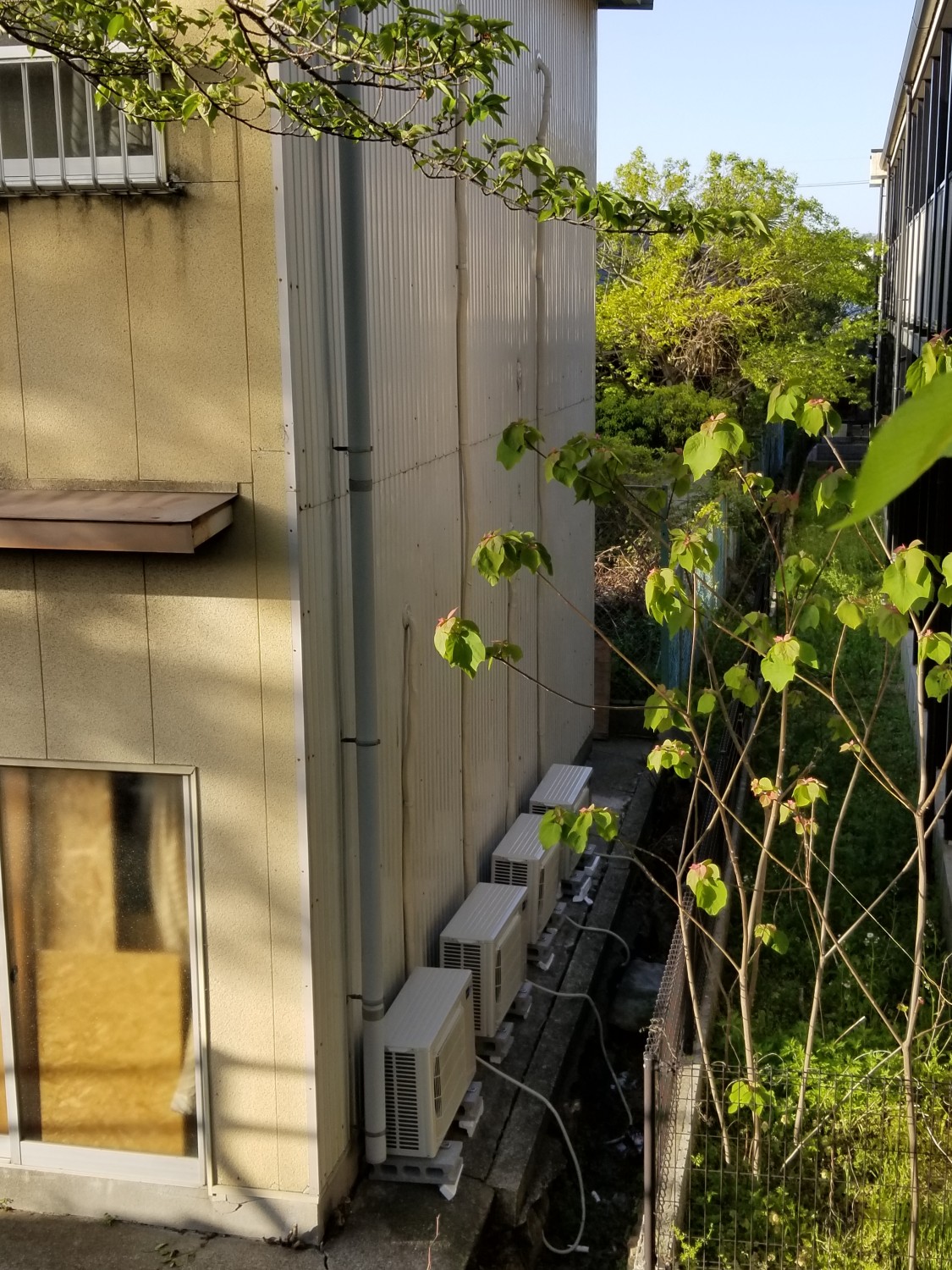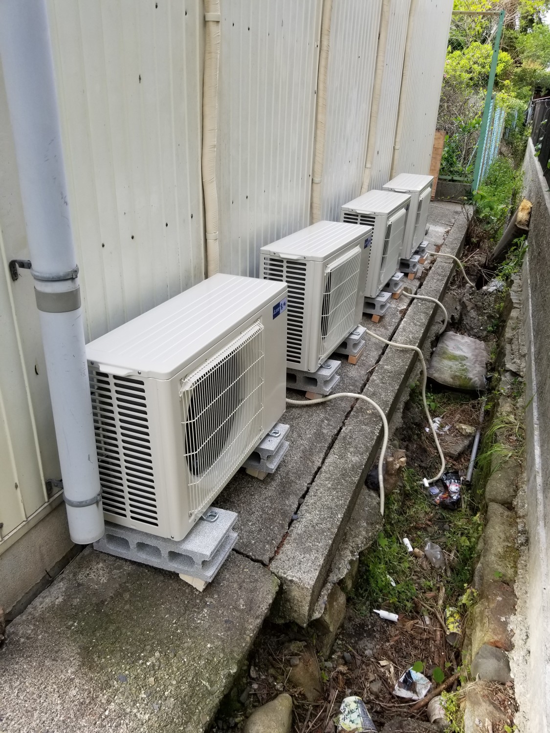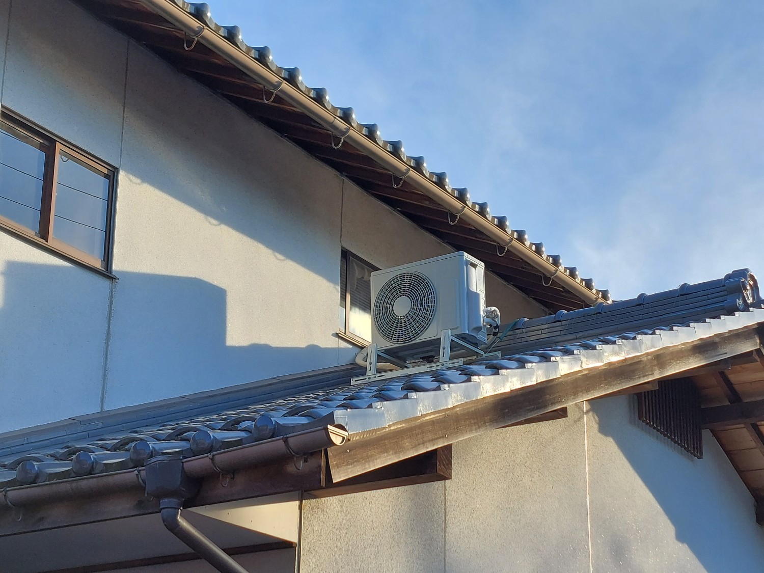 内1機の室外機は、屋根据え付けの取り付けの為、番線にて屋根にくくり付けて落下防止処置を施してあります。