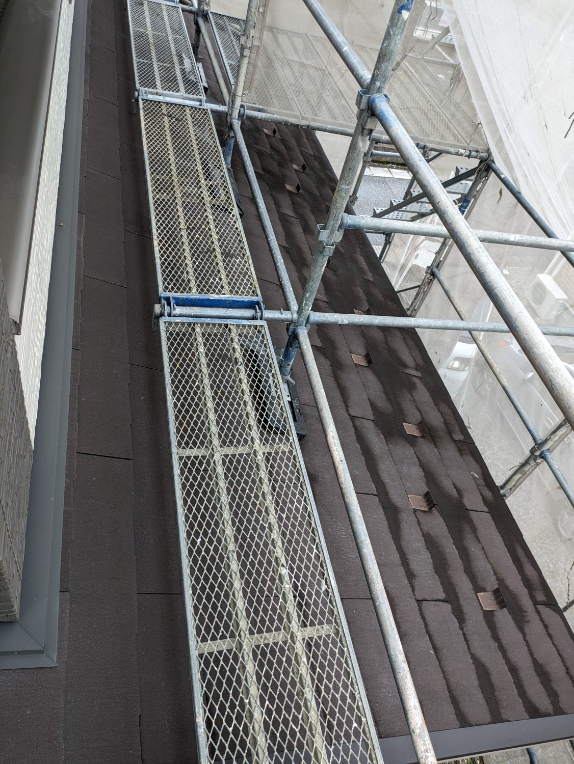 また、足場が邪魔をして同時に塗れなかったため、足場解体後に脚立にて登り塗装をおこないました。