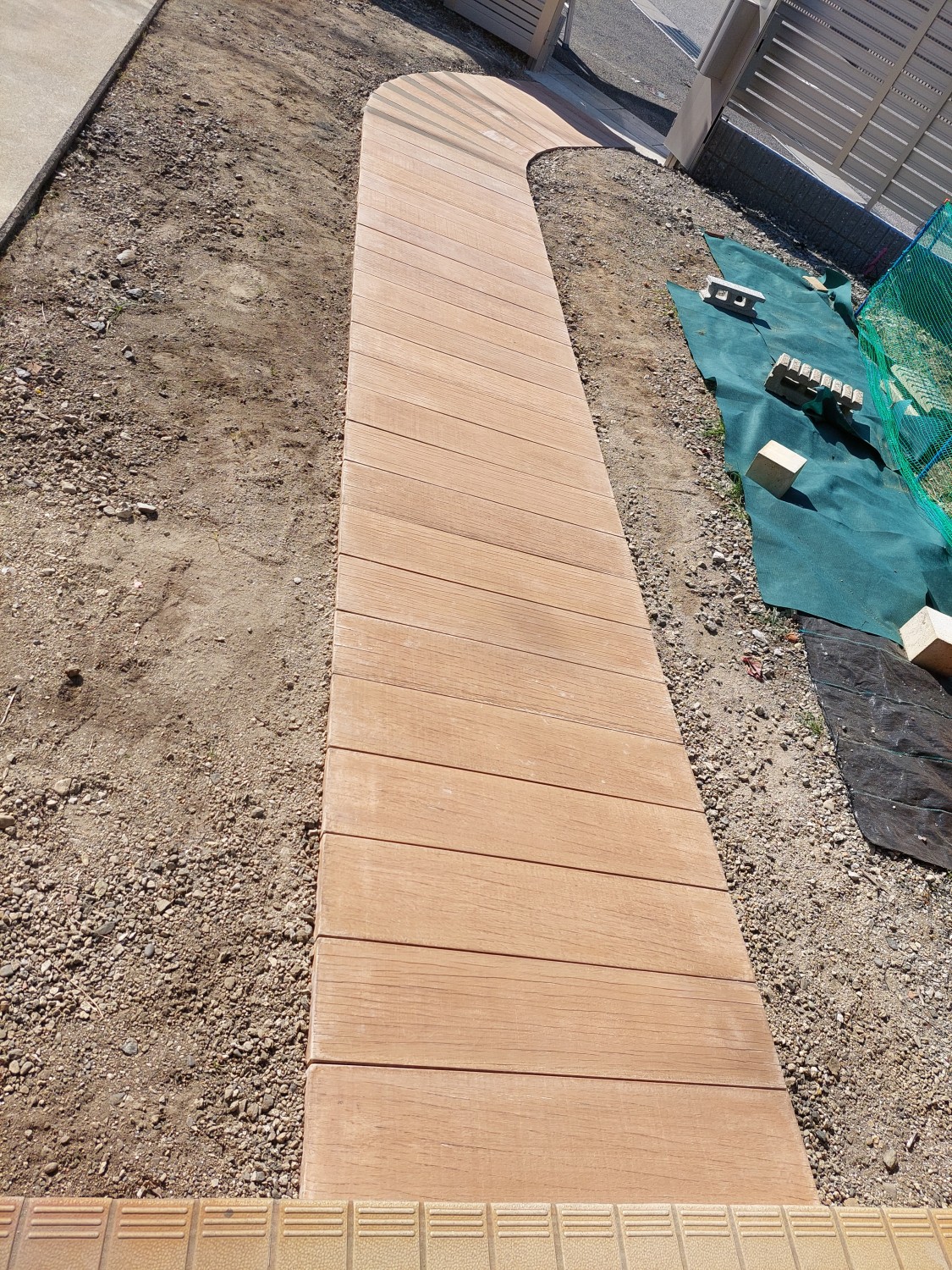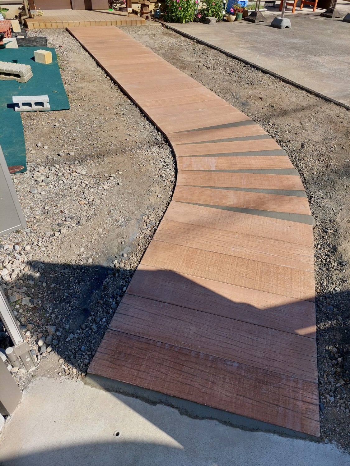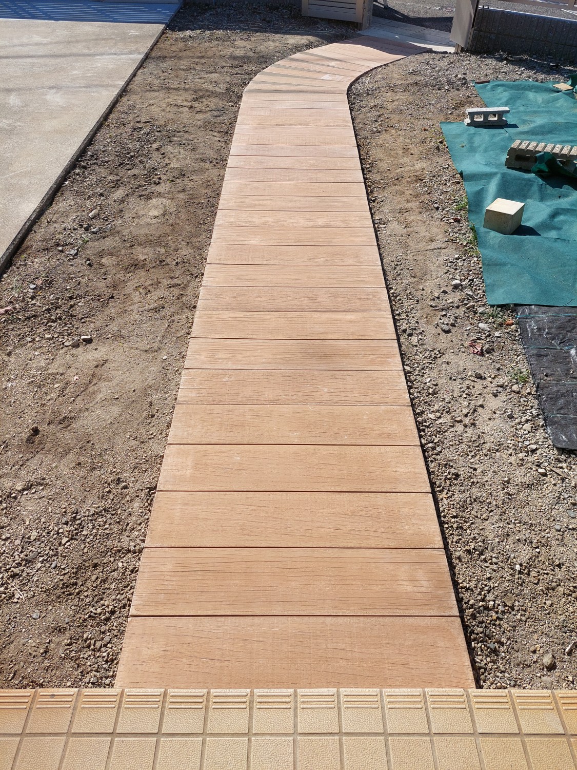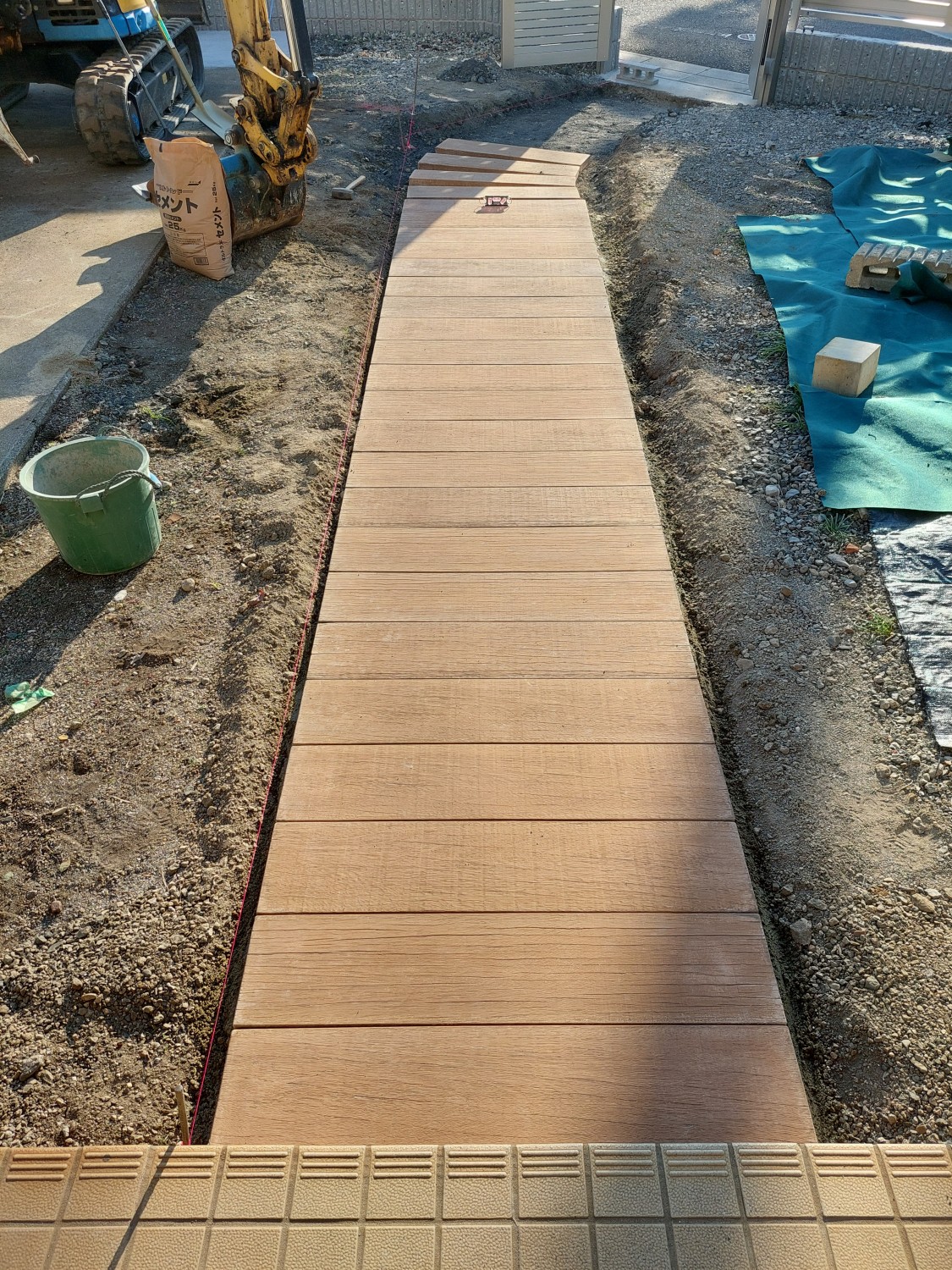 コンクリート製で木目調の枕木を敷き詰めて、アプローチを作りました。