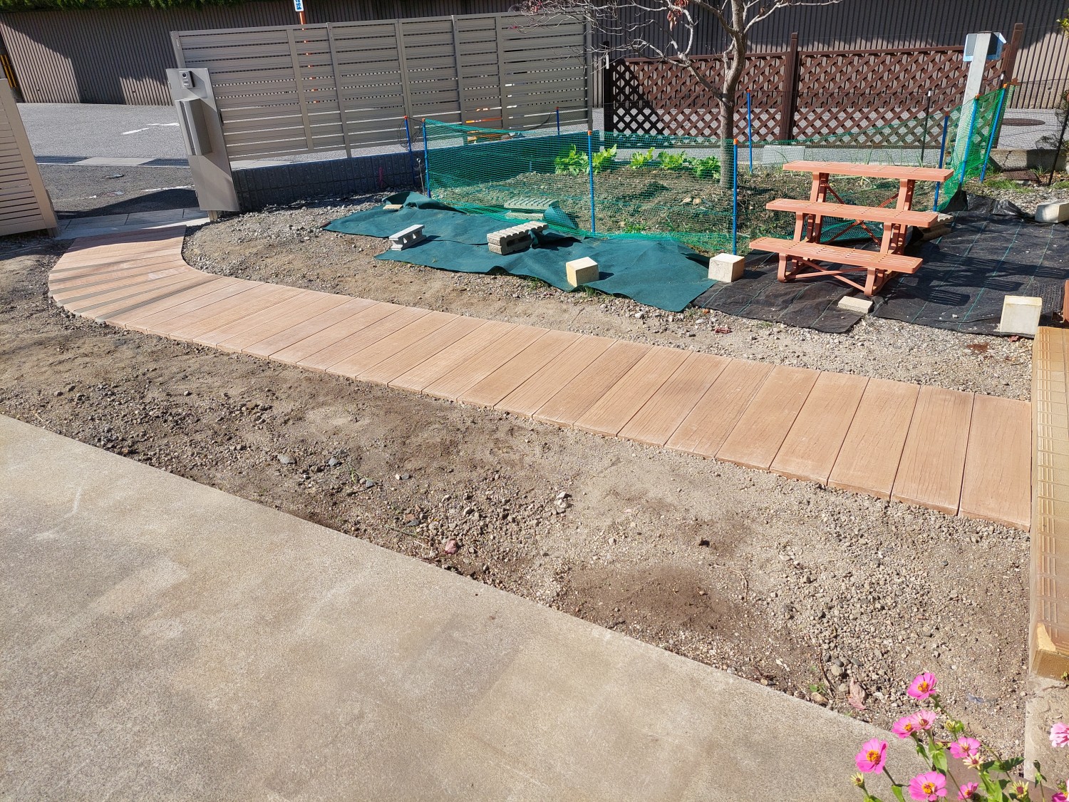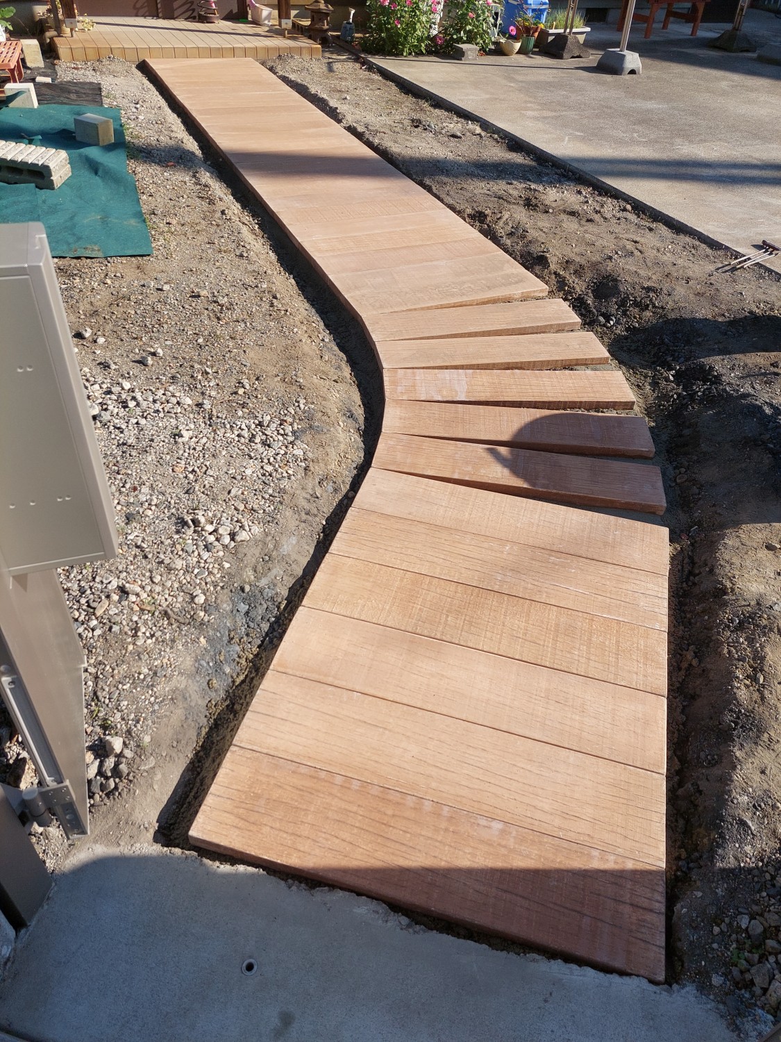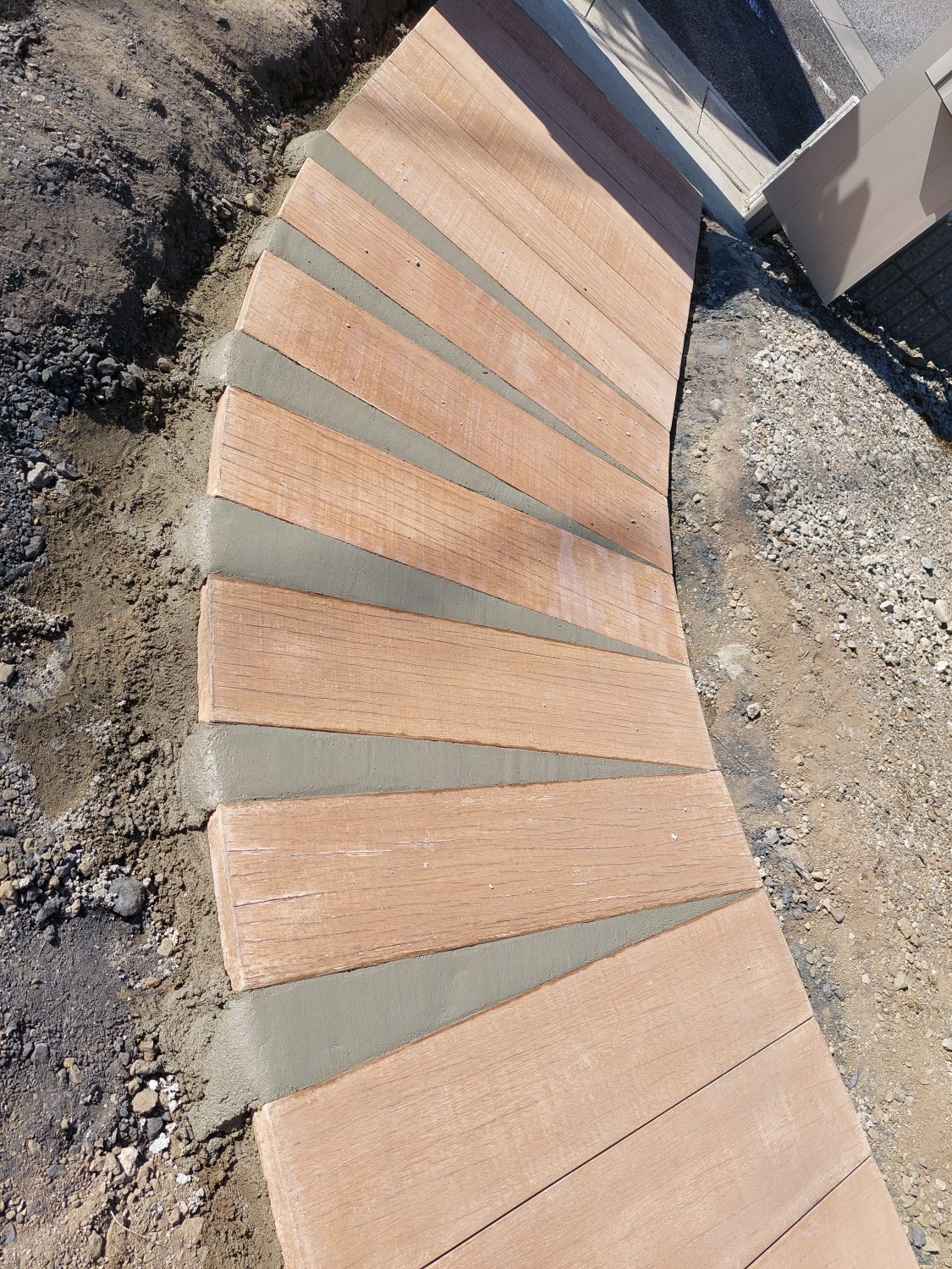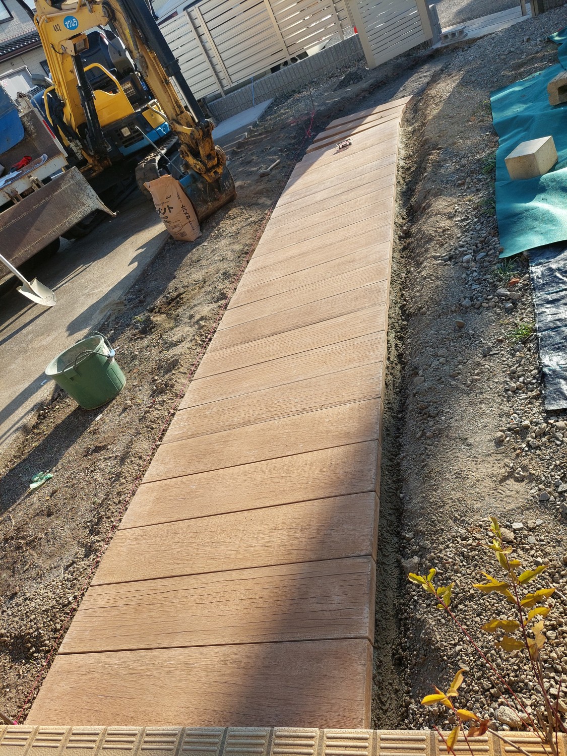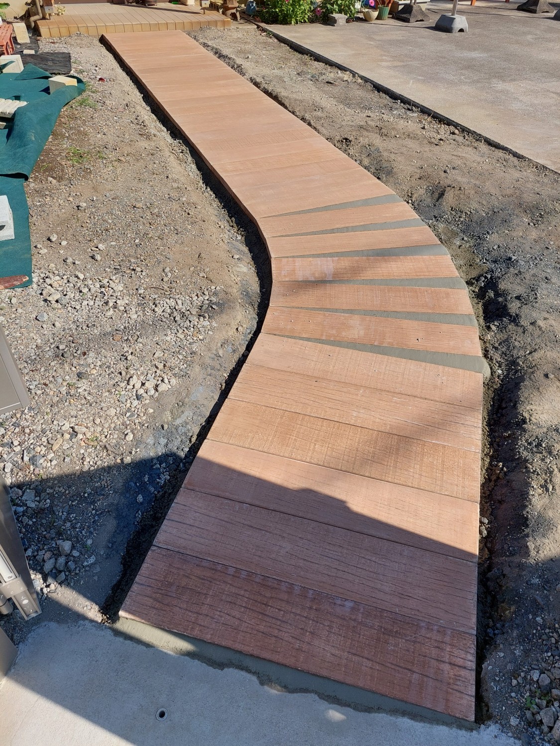コンクリート製で木目調の枕木を敷き詰めて、アプローチを作りました。