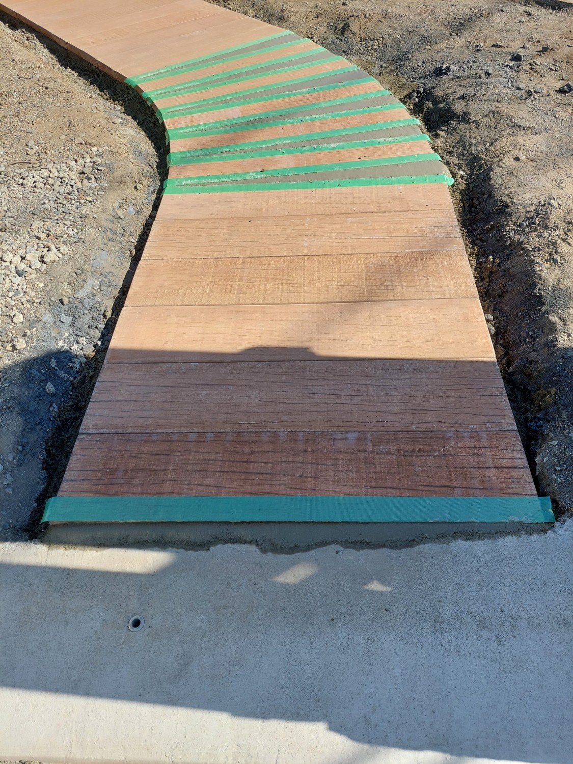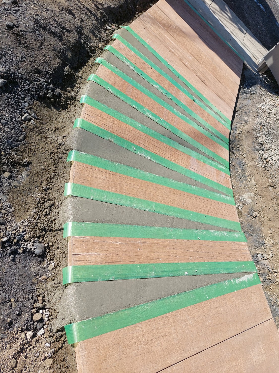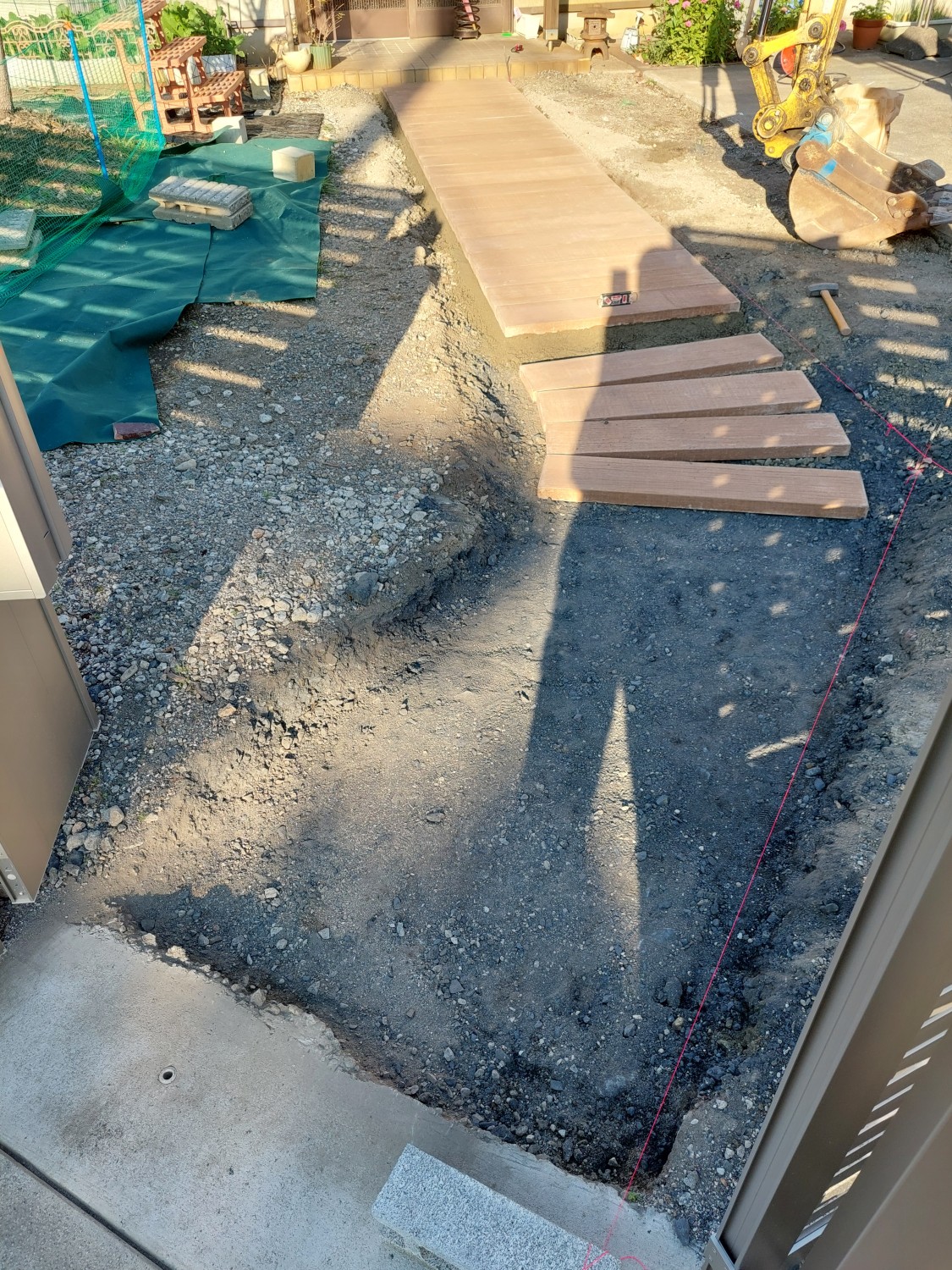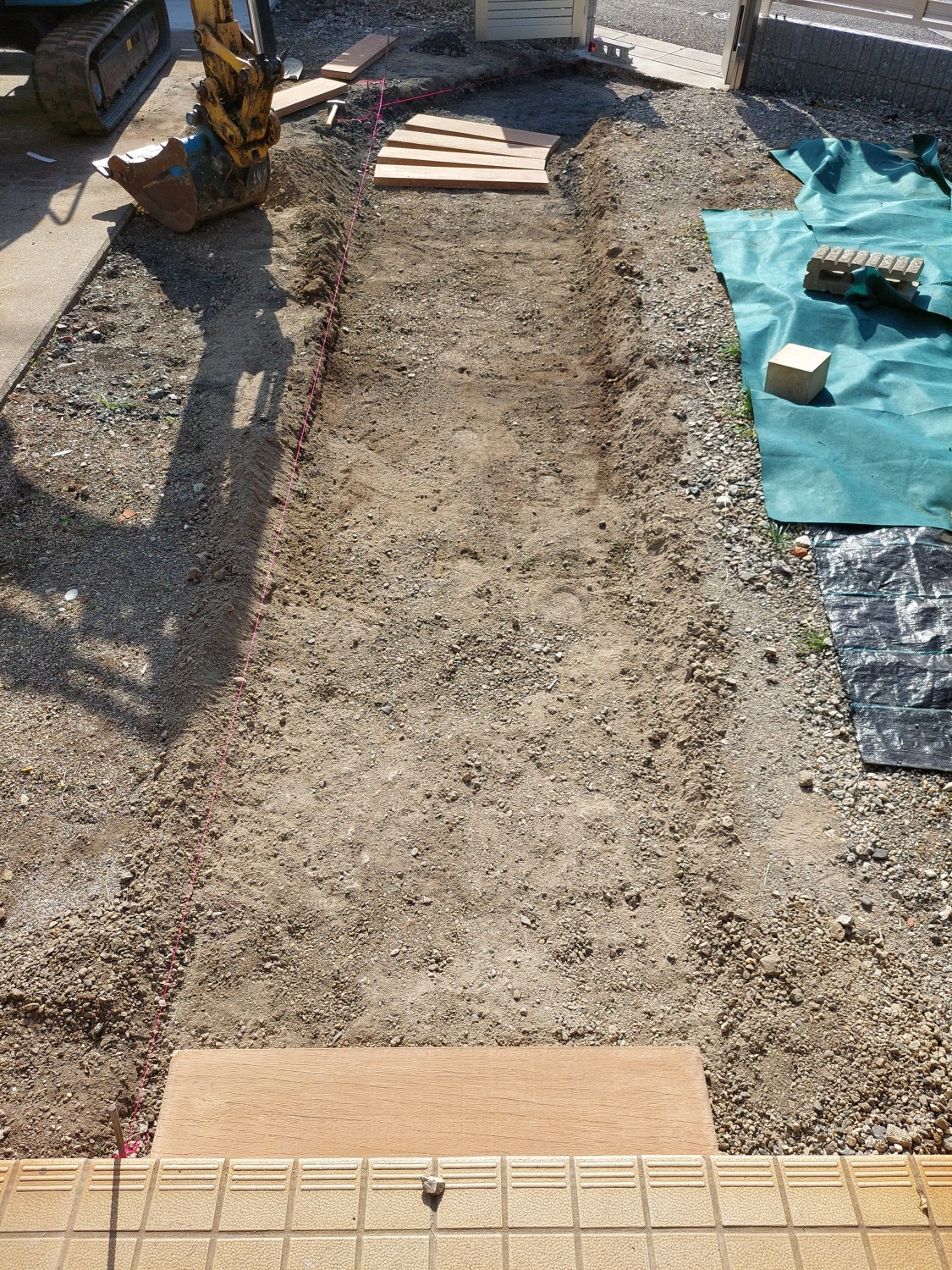 コンクリート製で木目調の枕木を敷き詰めて、アプローチを作りました。