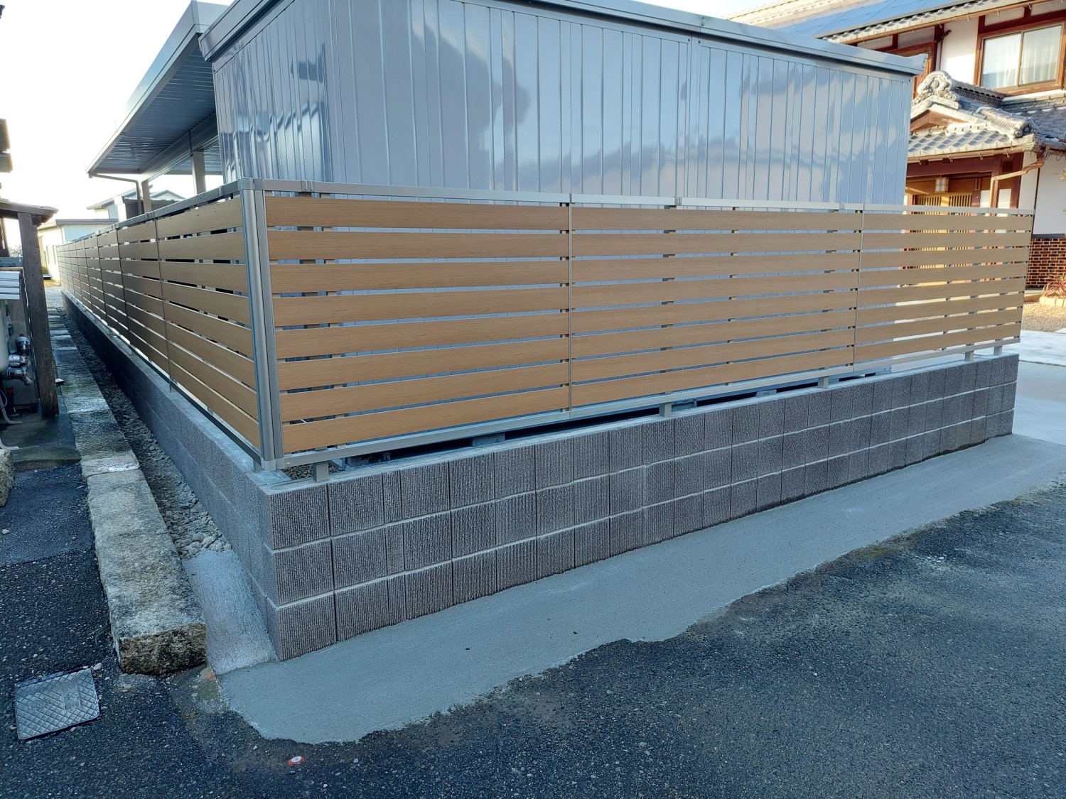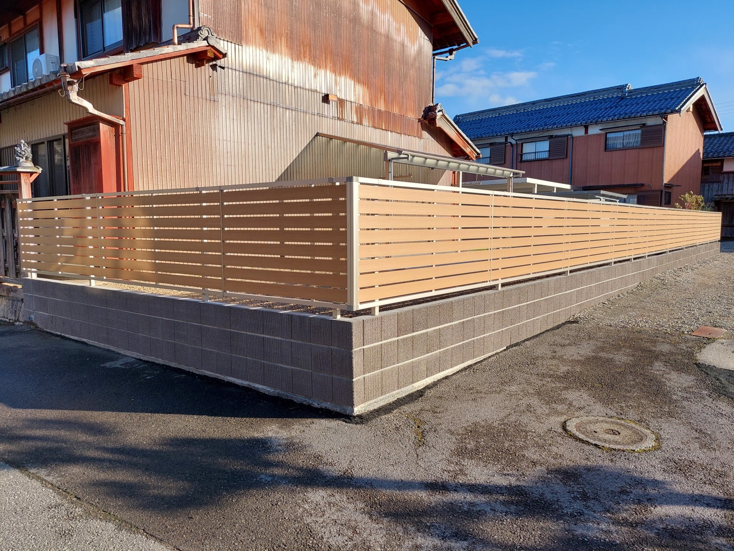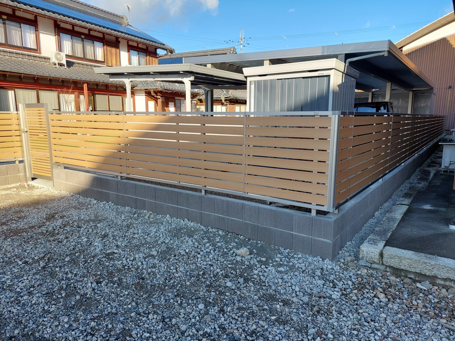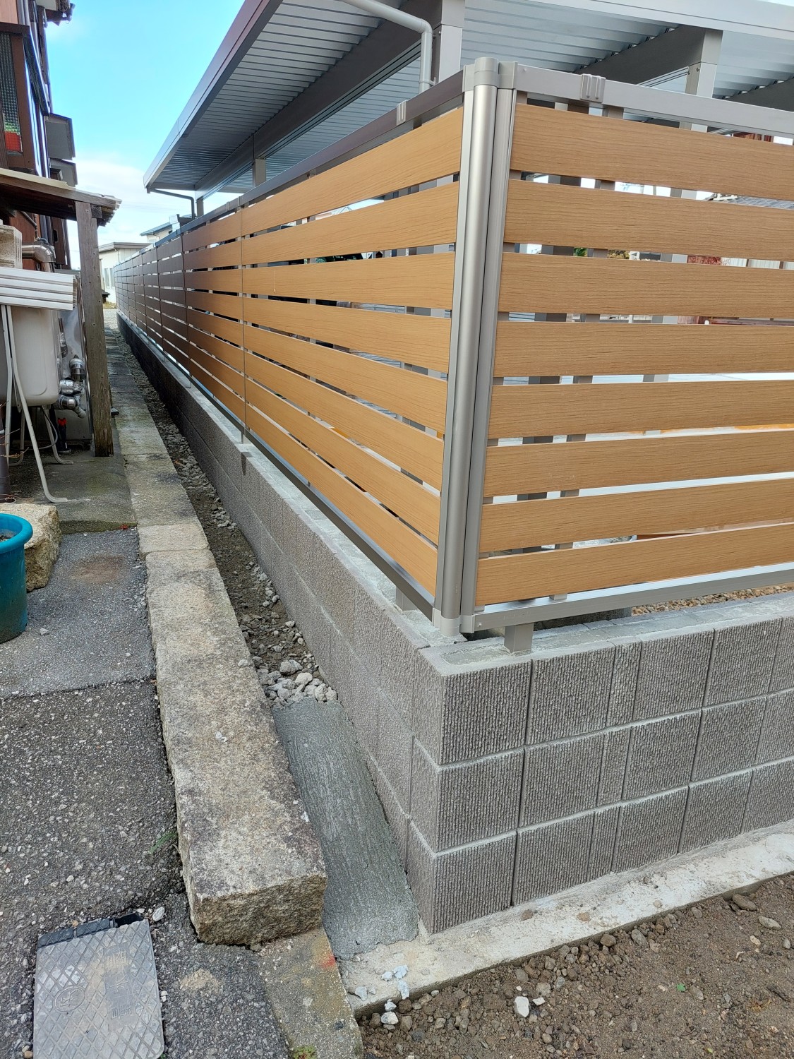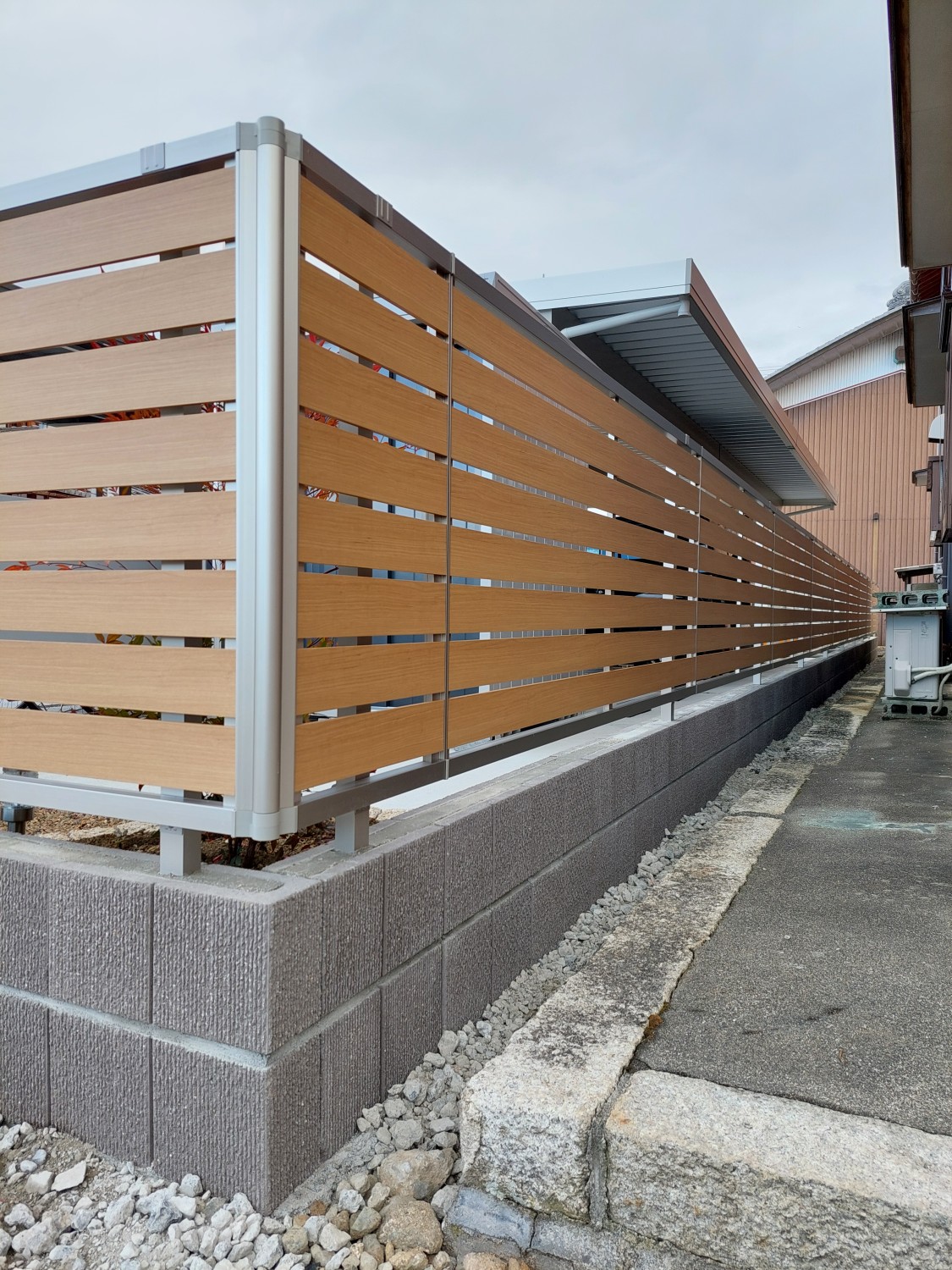木目調のアルミフェンスをブロック建て仕様にて、化粧ブロックに設置しました。