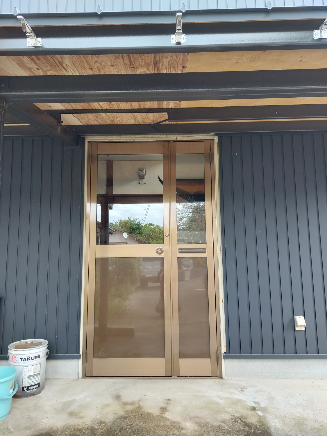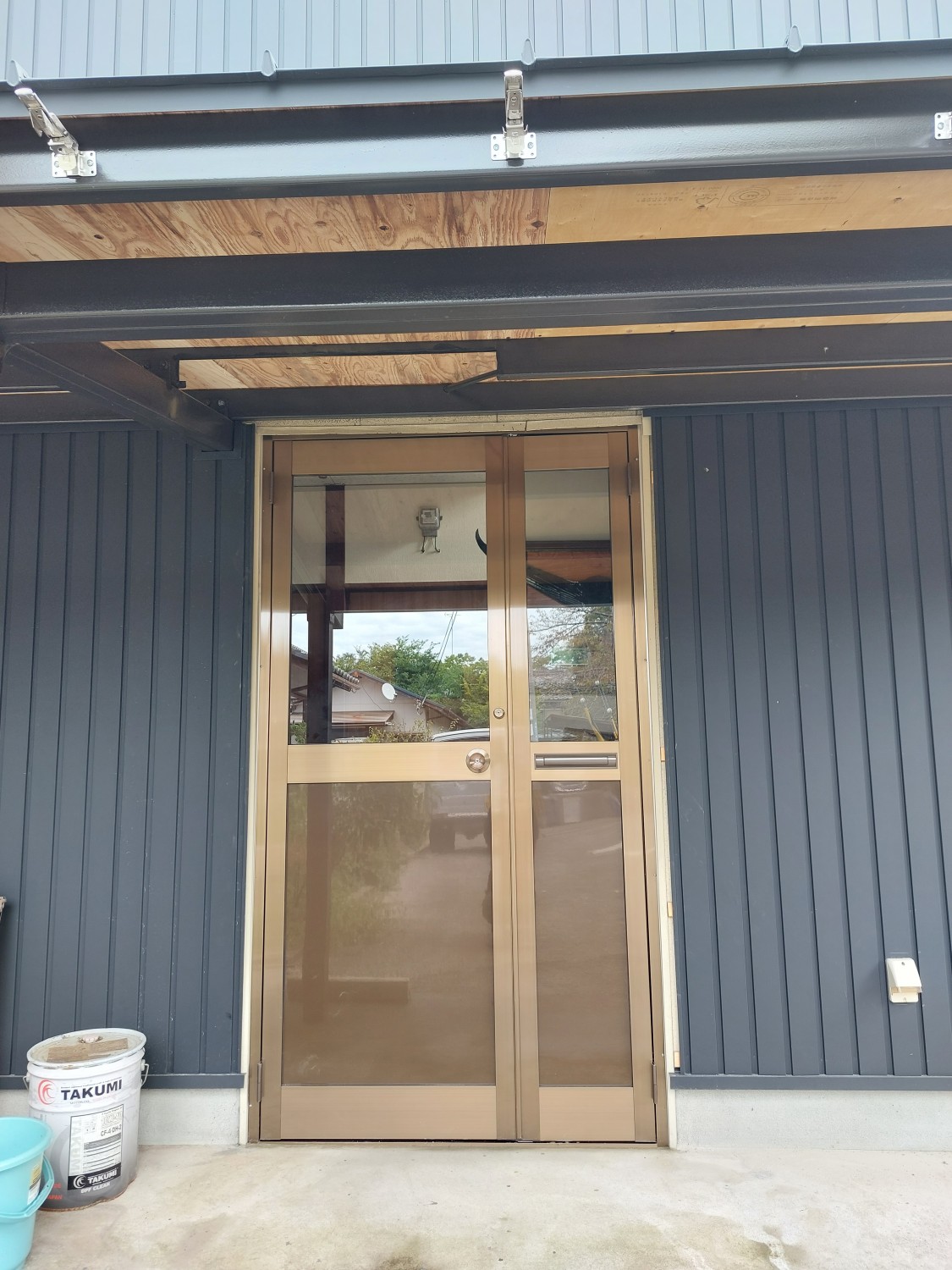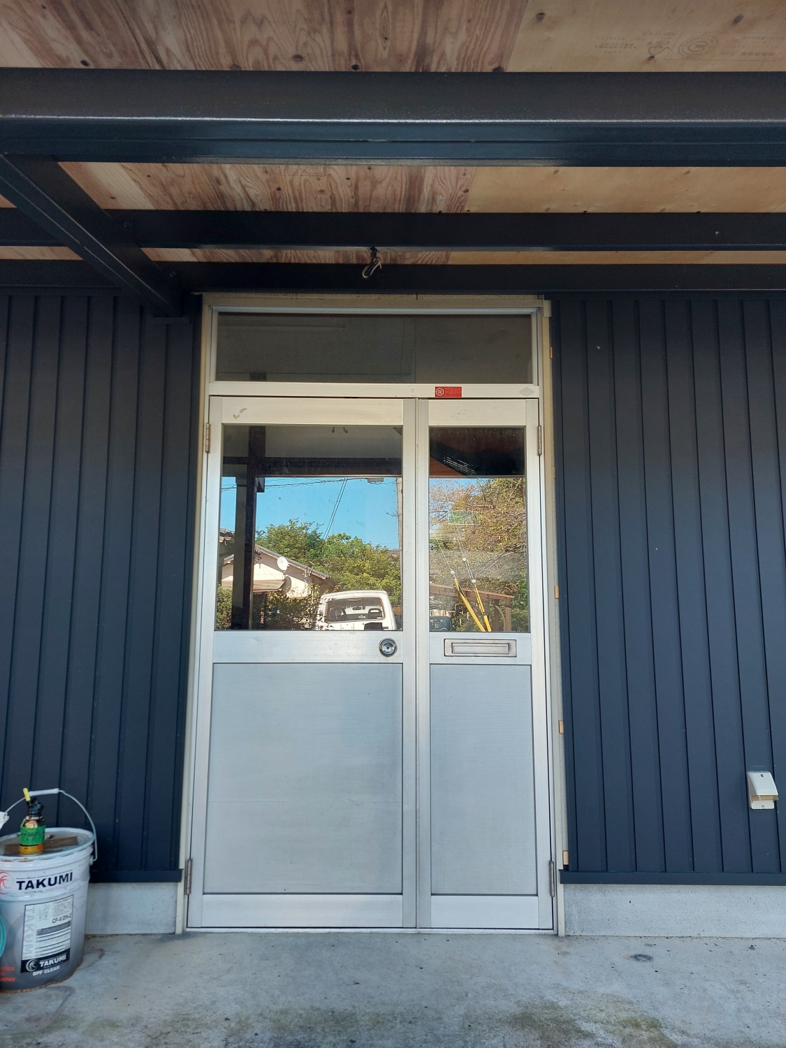 その為、親子扉の親側の扉が開閉時に軒の鉄骨に干渉するので、鉄骨のカットもおこないました。