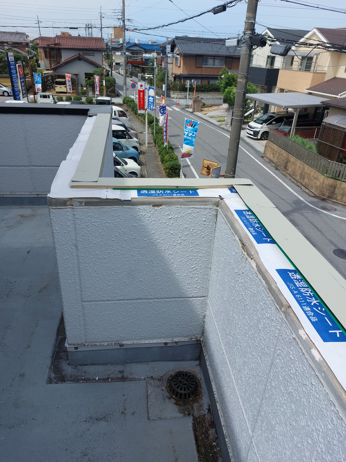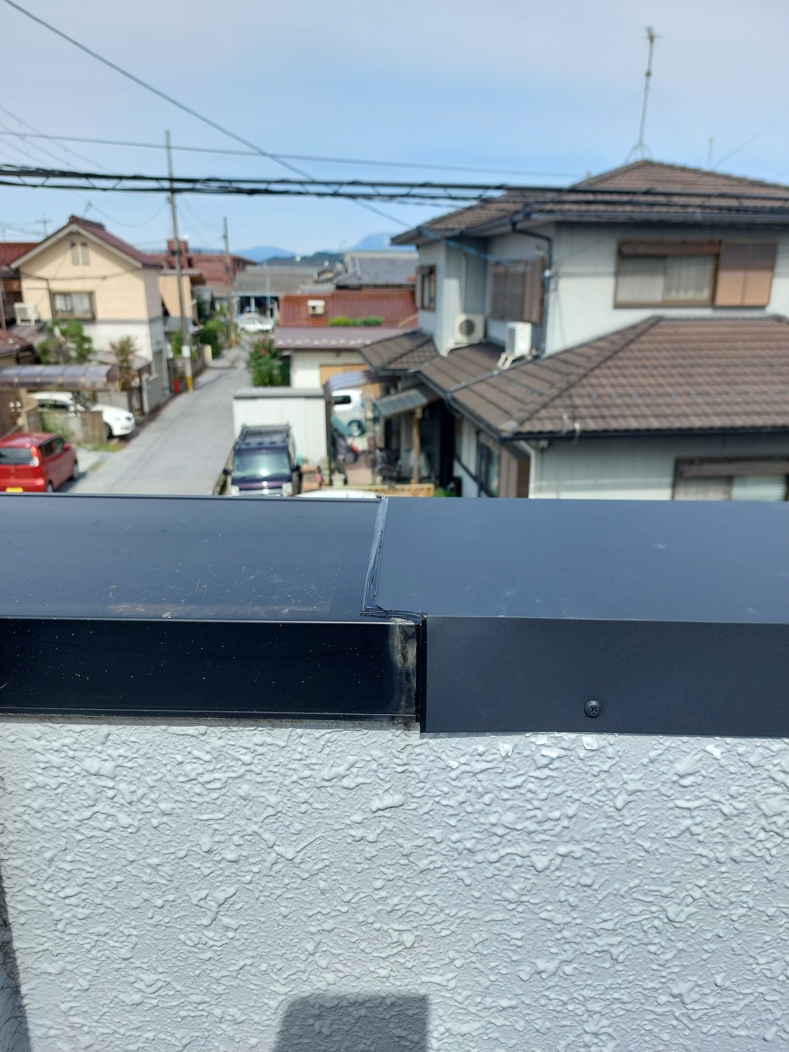 そして、雨水による鉄骨の腐食が見られたので掃除をしてから防水シートをひき、胴縁を入れて笠木までの隙間を作り換気スペースを設け、新規に笠木を施工し既存笠木に接続・仕上げをおこないました。