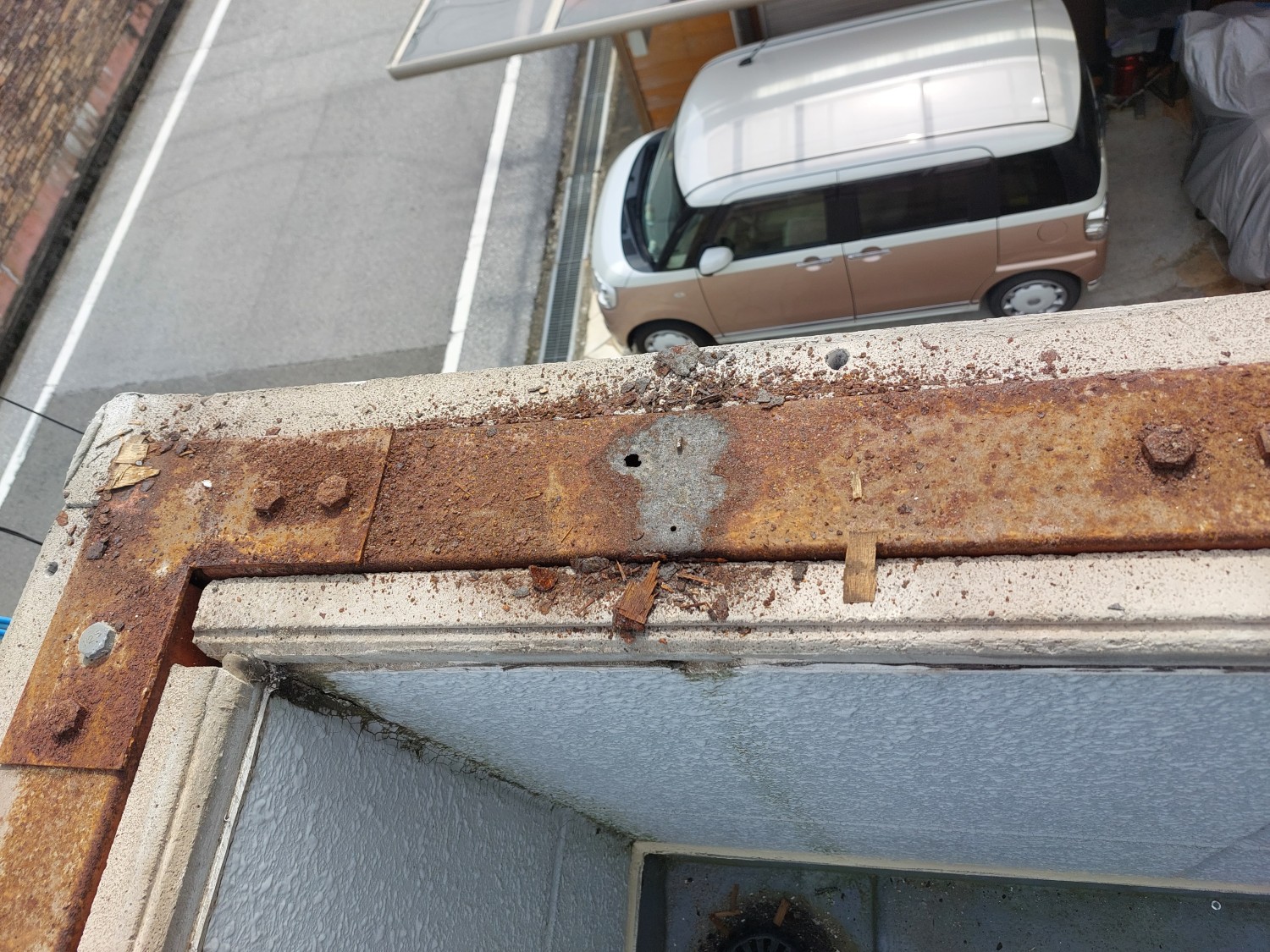 バルコニーの笠木のジョイント部分から雨漏りが見受けられた為、既存笠木を一部解体し撤去しました。
