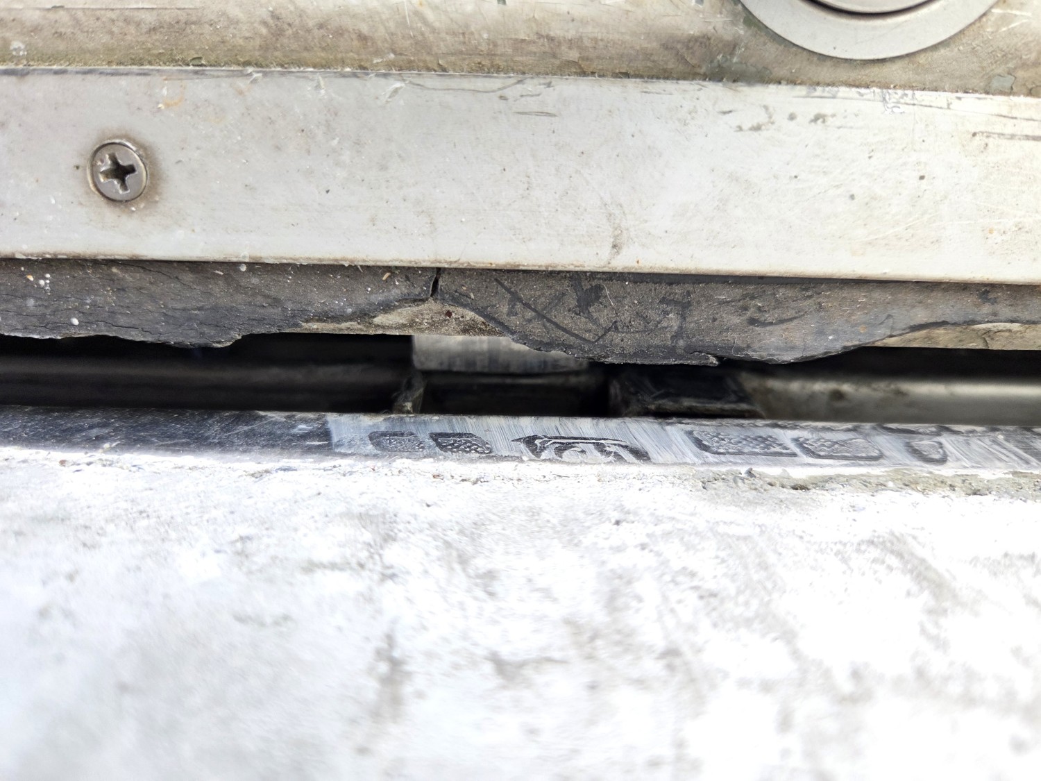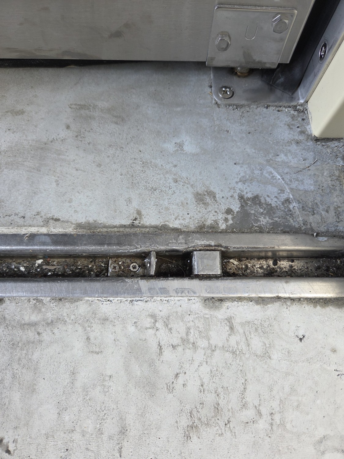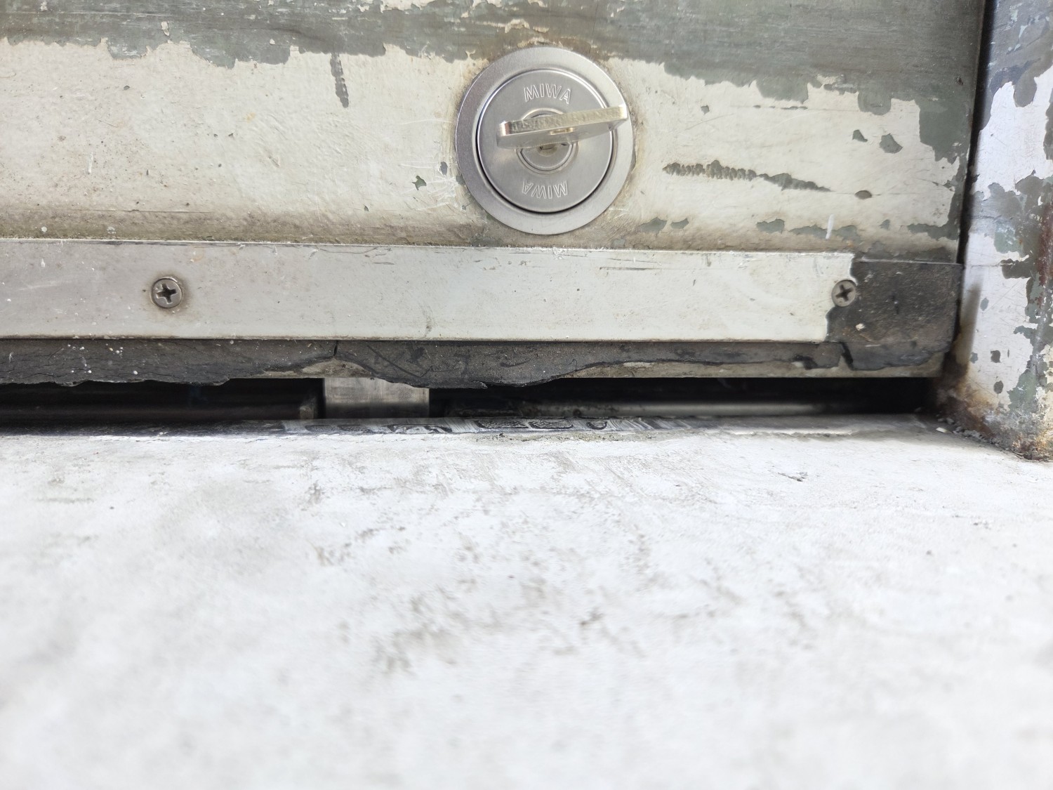 吊り鉄扉のレール脱線を復旧の数日後に鍵がかからなくなったとのことで確認しましたところ、鍵をかけたまま扉を閉めたことにより、下部の鍵受けが曲がっておりましたので、修復しました。