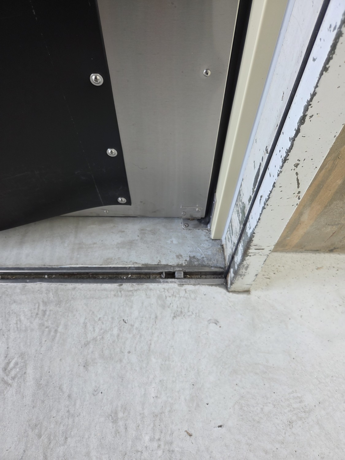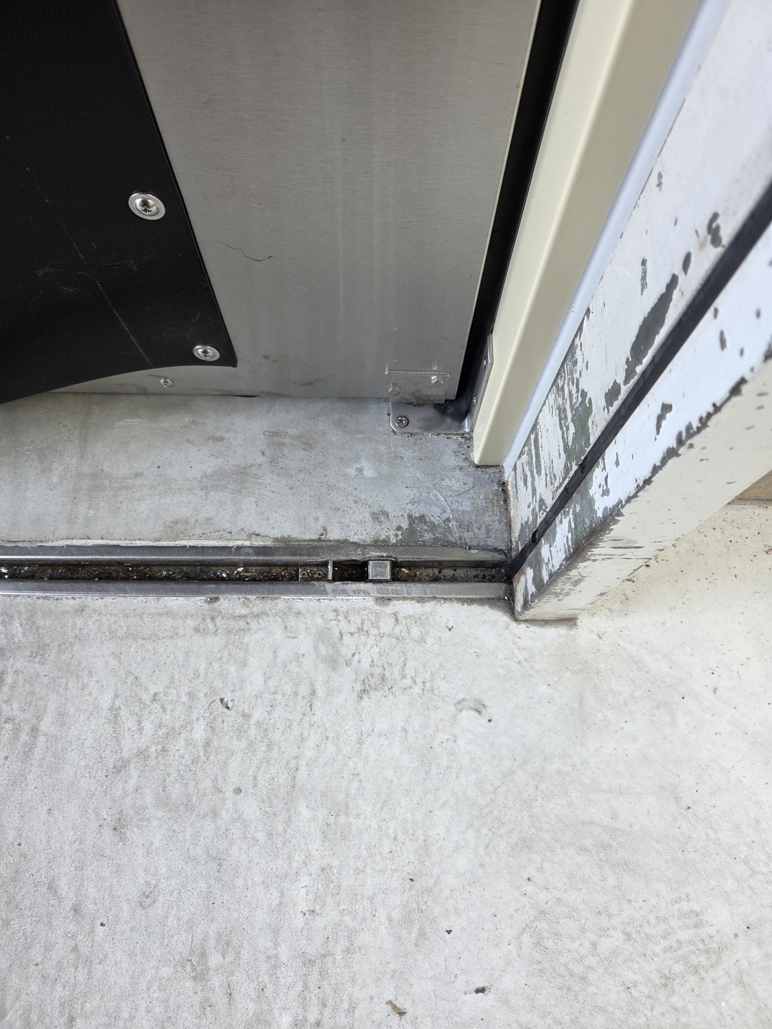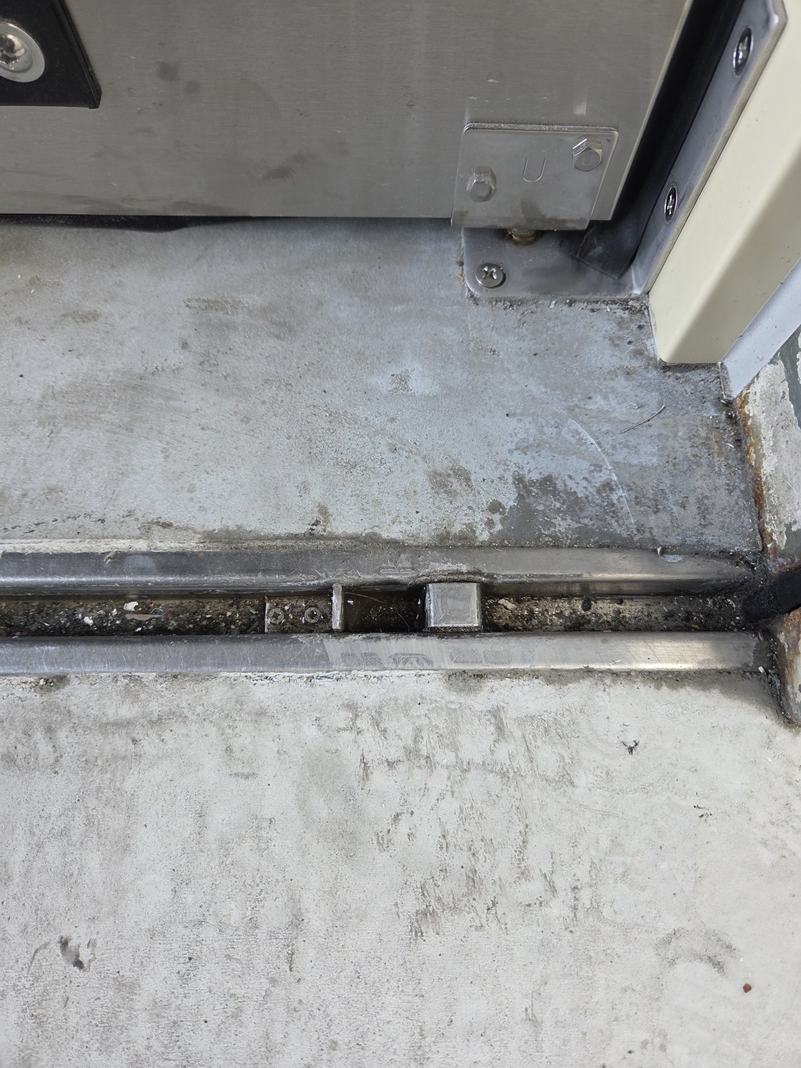 吊り鉄扉のレール脱線を復旧の数日後に鍵がかからなくなったとのことで確認しましたところ、鍵をかけたまま扉を閉めたことにより、下部の鍵受けが曲がっておりましたので、修復しました。