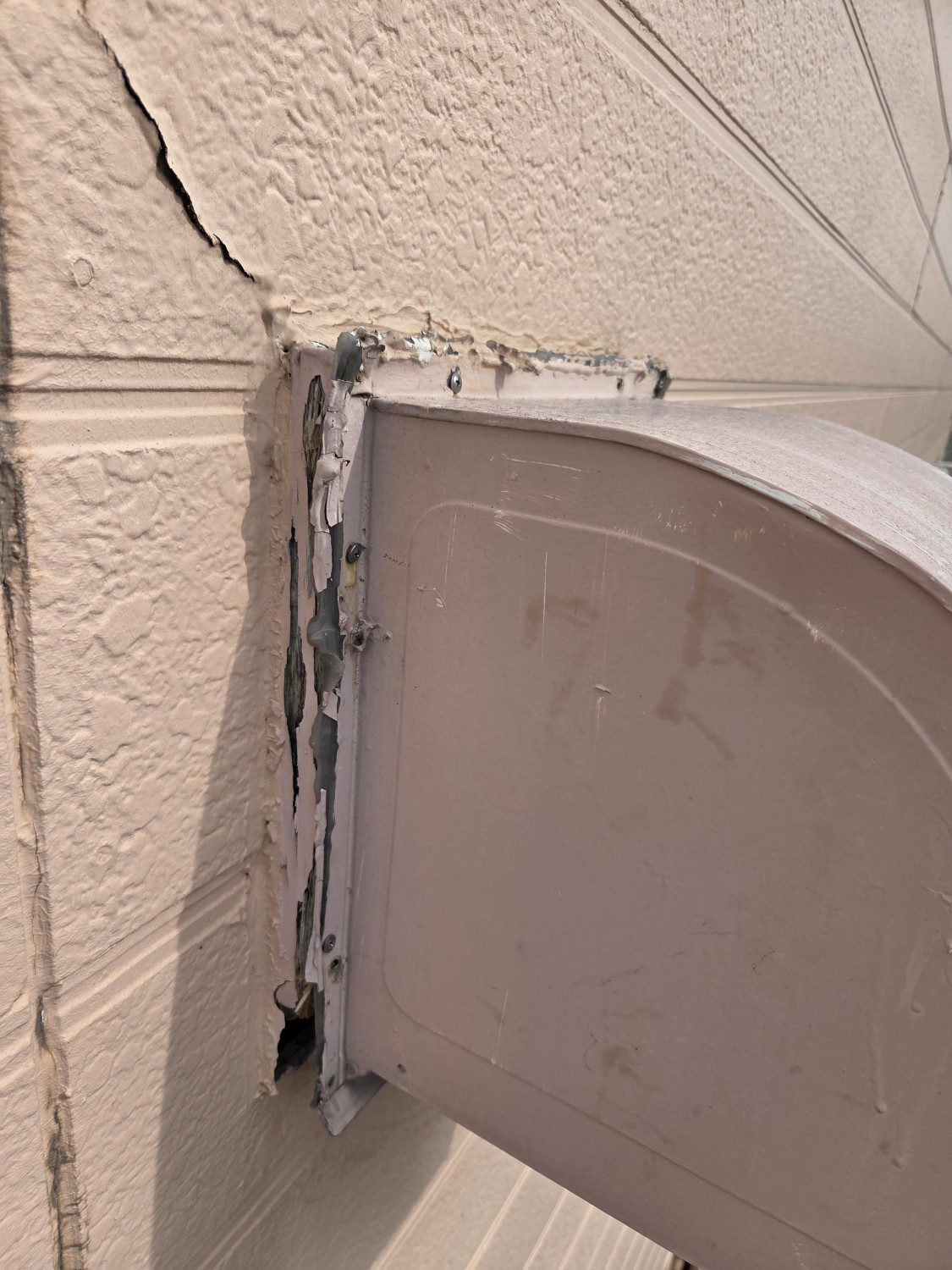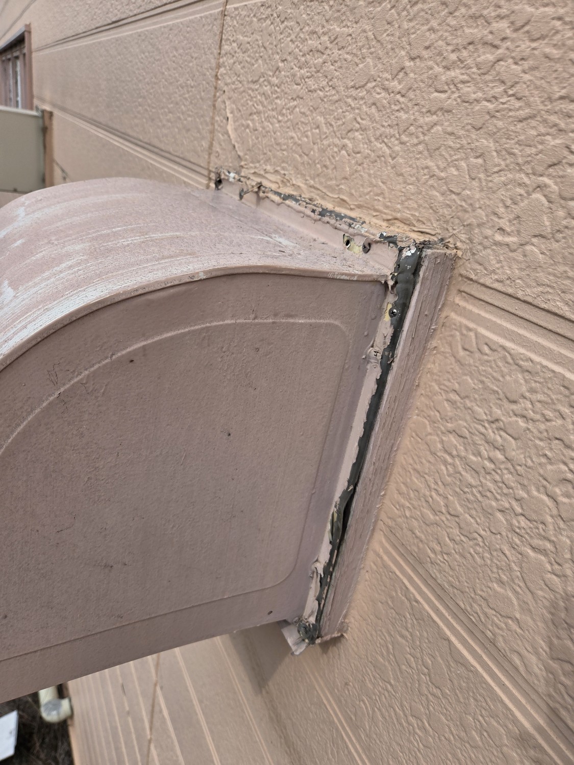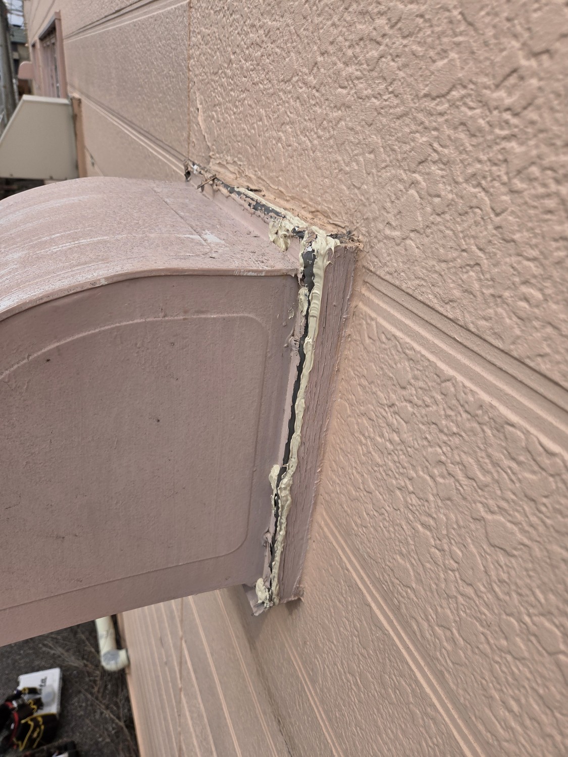 屋外の換気フードが、内側の木枠が朽ちて一部以外重みに耐えきれずに宙ぶらりん状態になっており、復旧の依頼がきましたので、木枠の朽ちていない箇所に新たに穴あけ加工をおこない、ビス止めをした後の接合部に後々塗装が出来るように変性のコーキングにて廻りとビスの頭を補修しました。