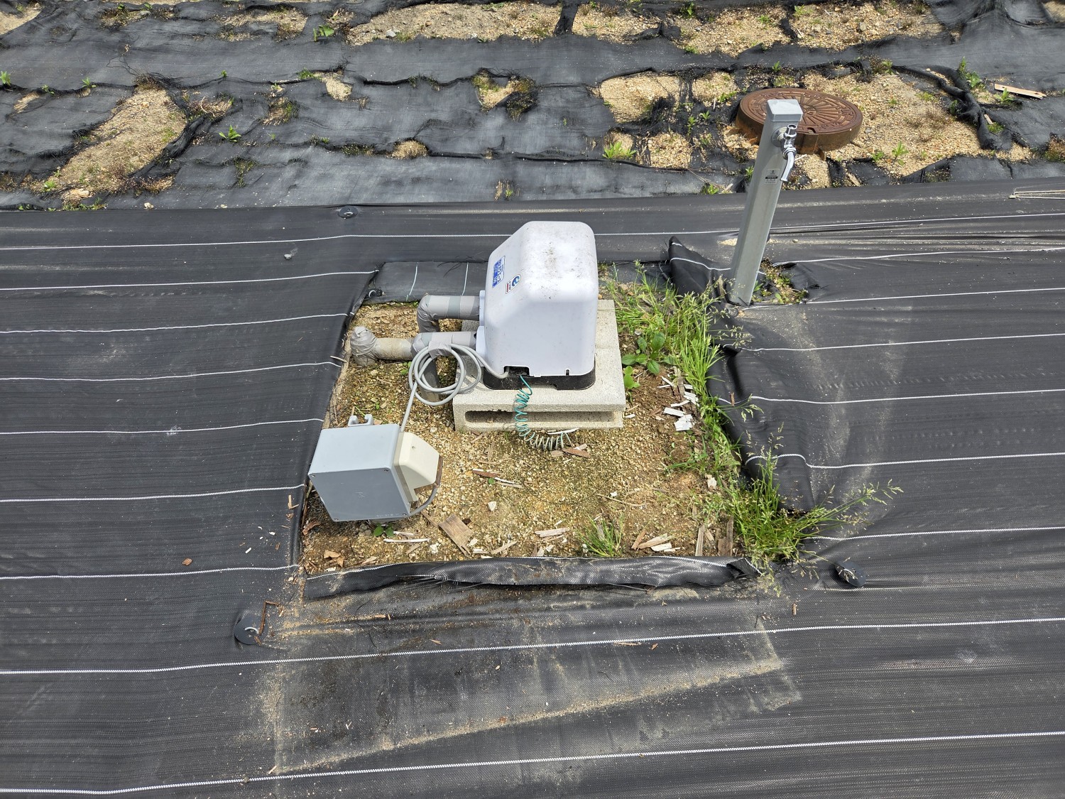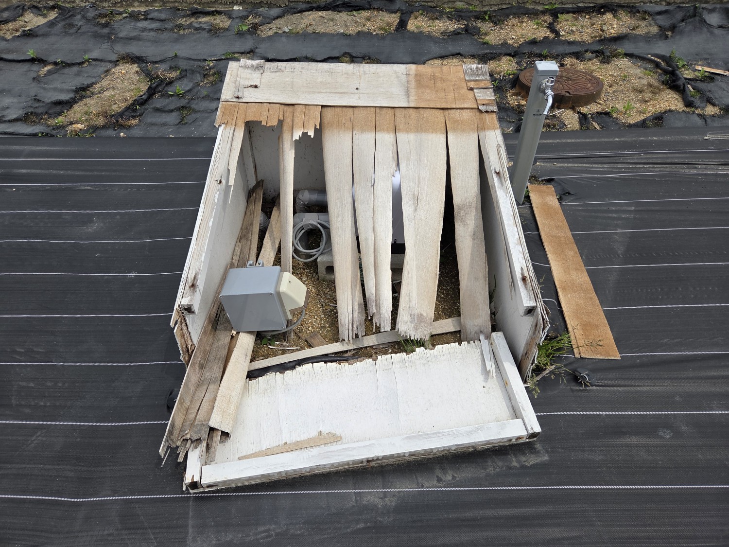 屋外の中継ポンプの格納箱(フタ兼用)が木製のため、朽ちていたので新しく作製しまして、交換設置をおこないました。
