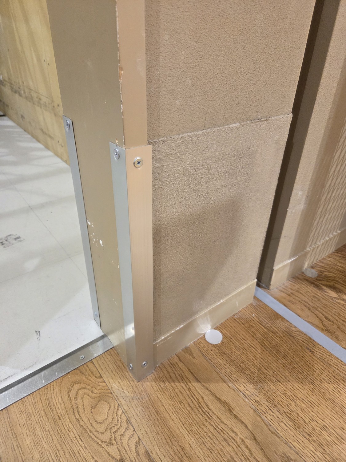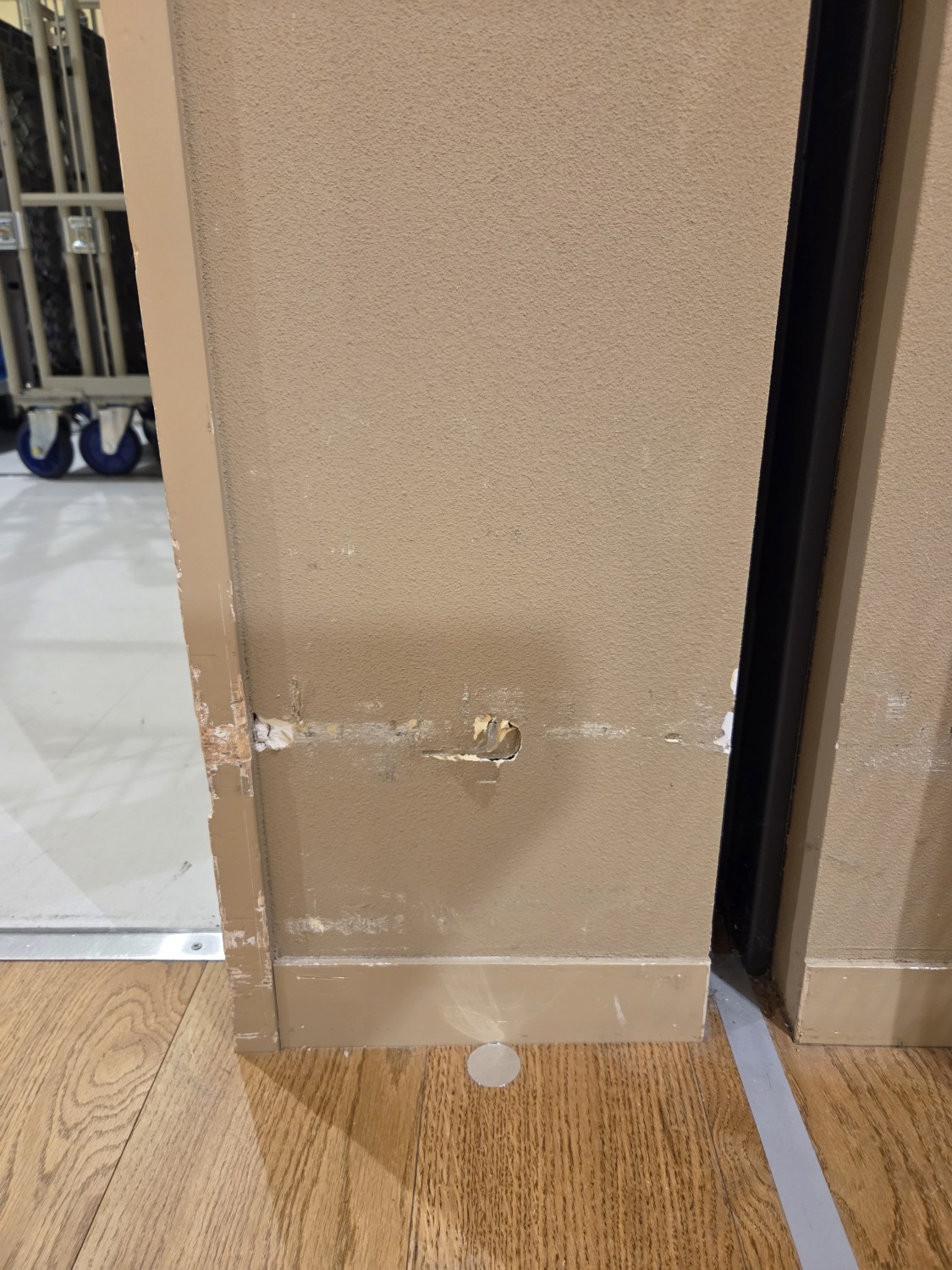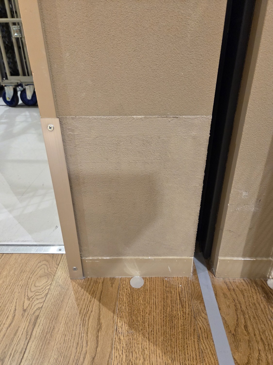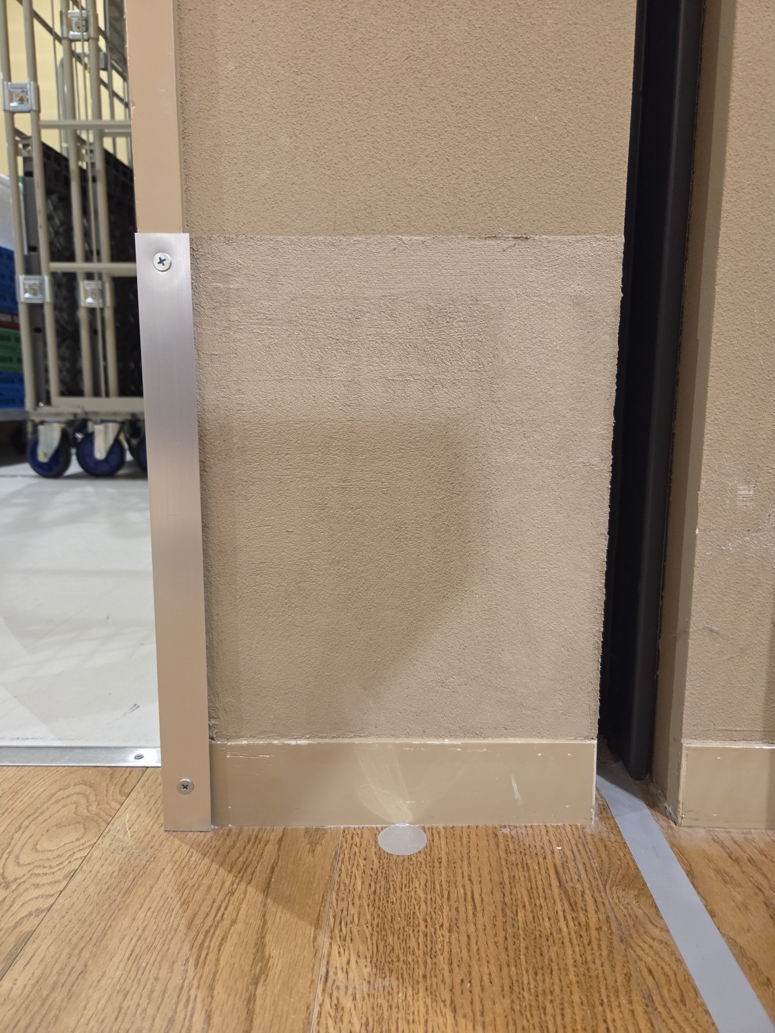 壁に台車が当たり損傷するため、石膏ボードをコンパネに張り変えて、更にその上に鉄板を張って補強しました。