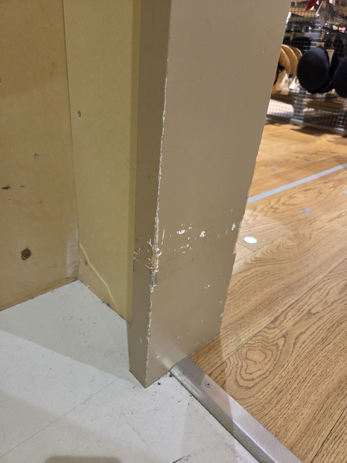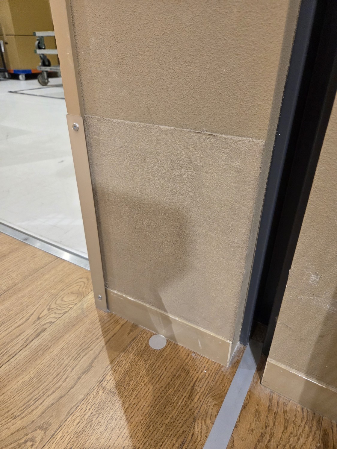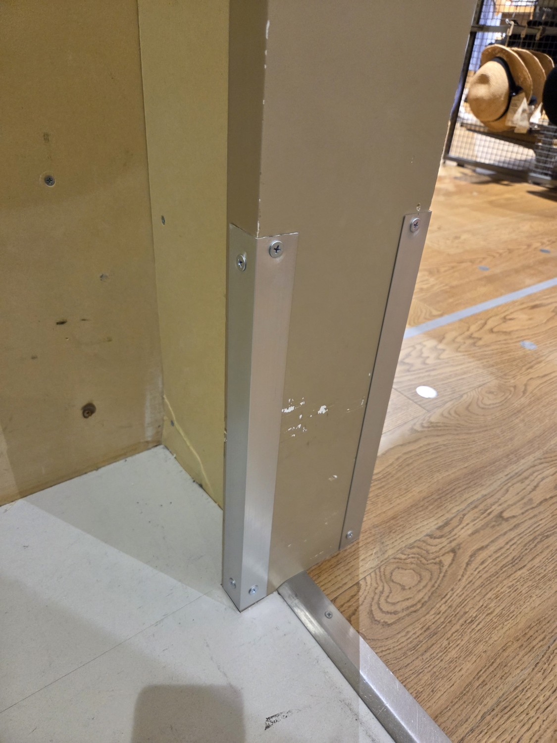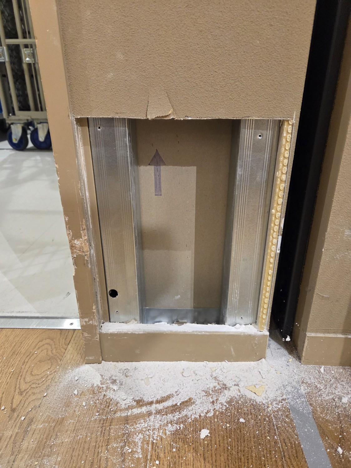 壁に台車が当たり損傷するため、石膏ボードをコンパネに張り変えて、更にその上に鉄板を張って補強しました。